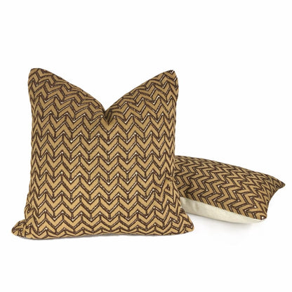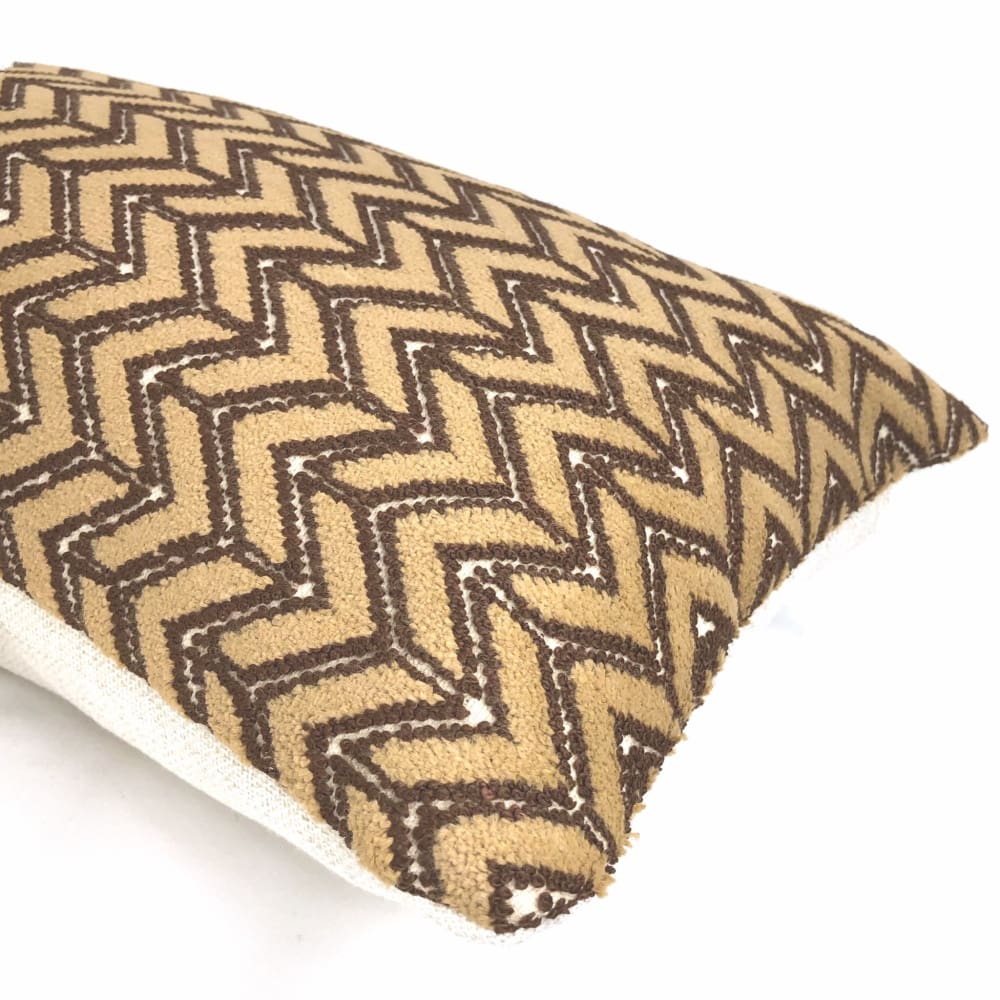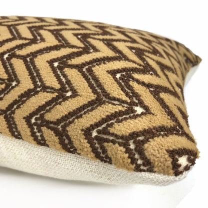 Our limited edition camel chevron velvet pillow cover features a bold arrow geometric pattern. Each chevron is woven in camel beige, rimmed in dark brown, on a cream colored base cloth.