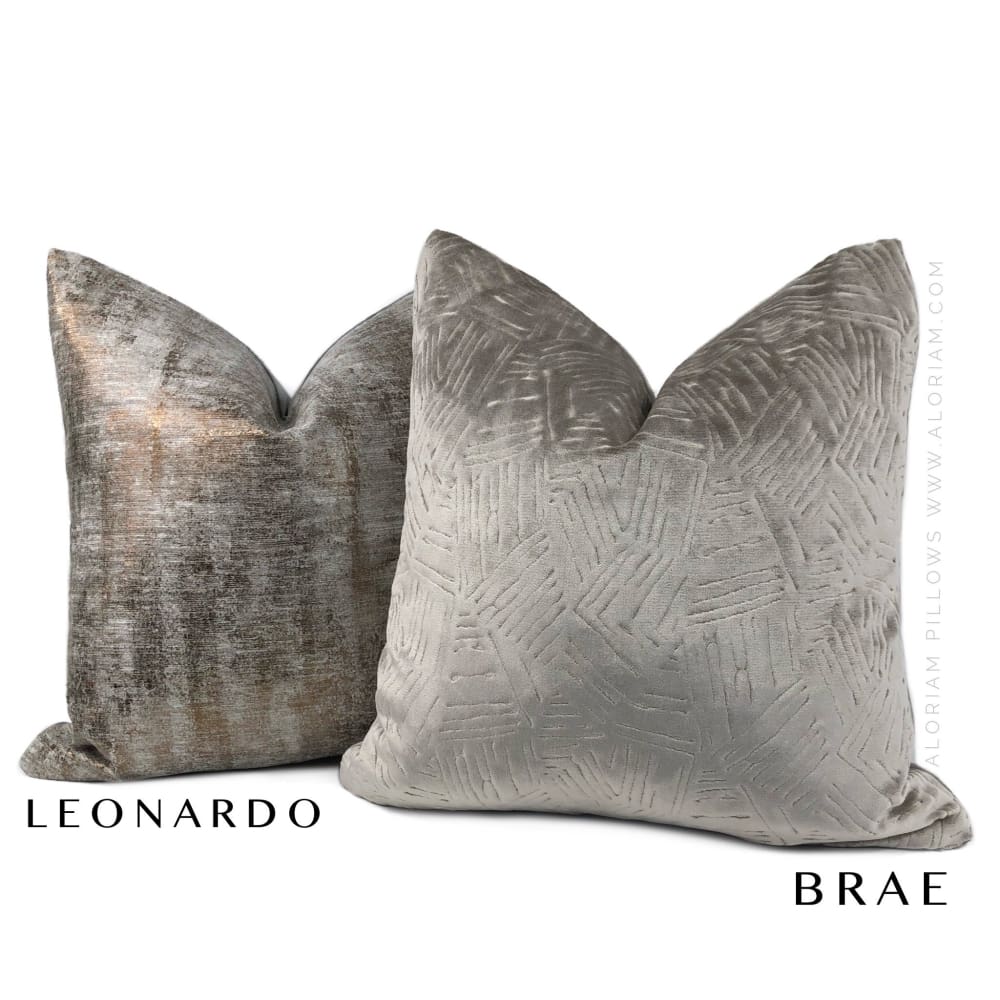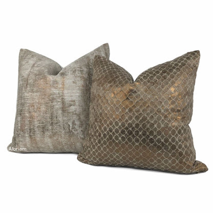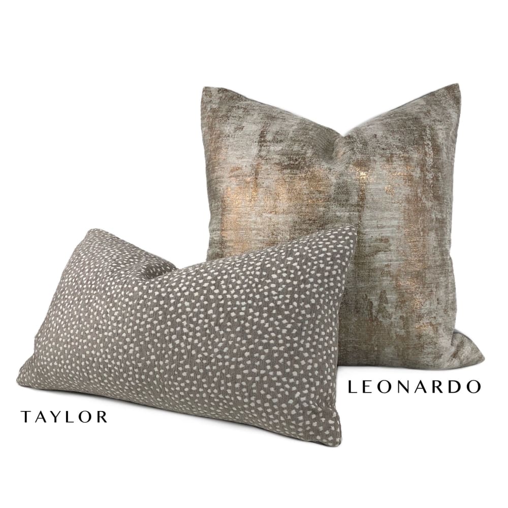 Leonardo is a contemporary pillow cover with an abstract patina pattern and metallic coppery bronze accents overlaid on a light gray background. Offered in your choice of the pattern fabric on both sides or with a solid gray backside. Photographed on 19x19 cover (filled with 20x20 insert).