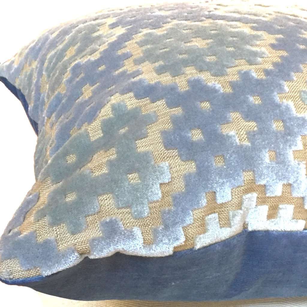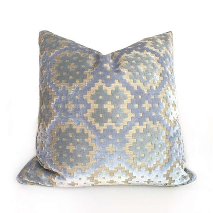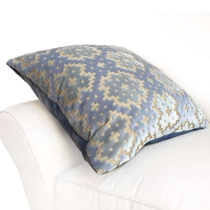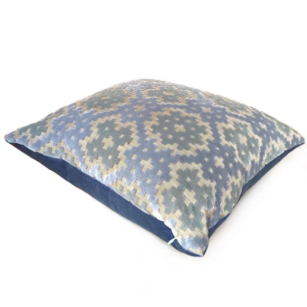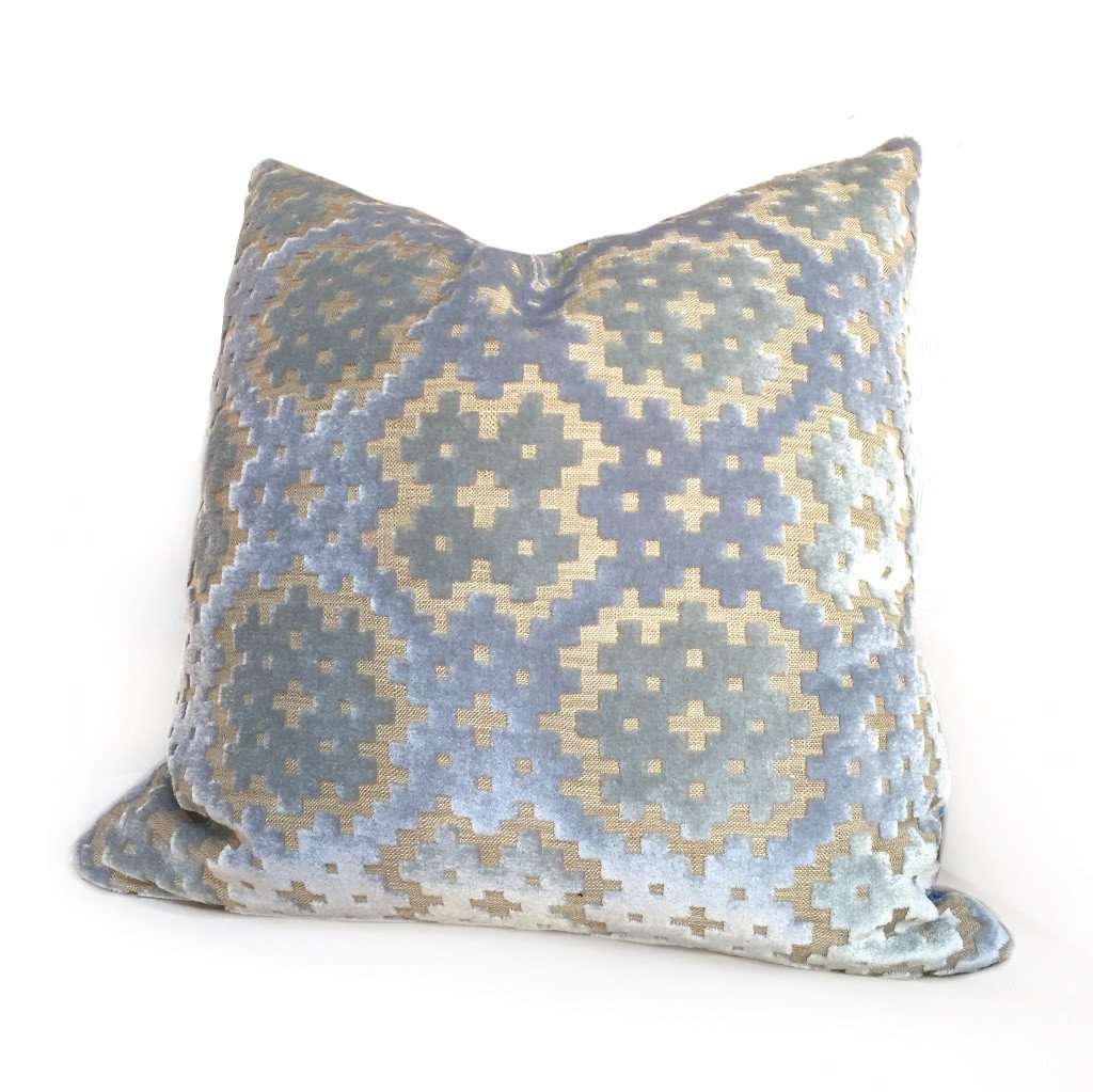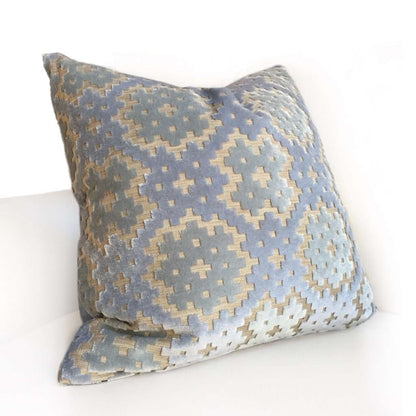 The pattern design is woven in pale blue and light green cut velvet on a beige background. The back of the cover is a coordinating solid velvet. Photographed on 19x19 cover (filled with 20x20 insert).
