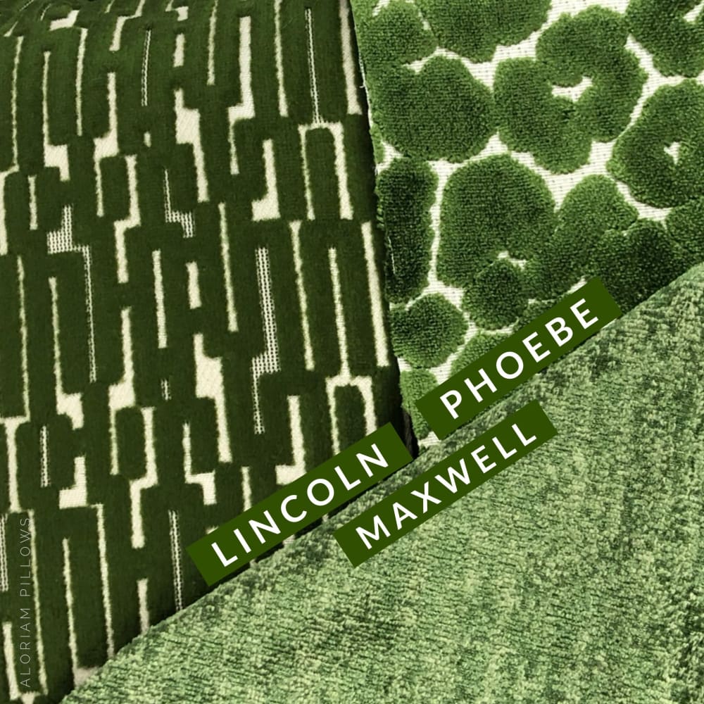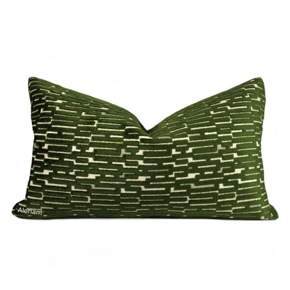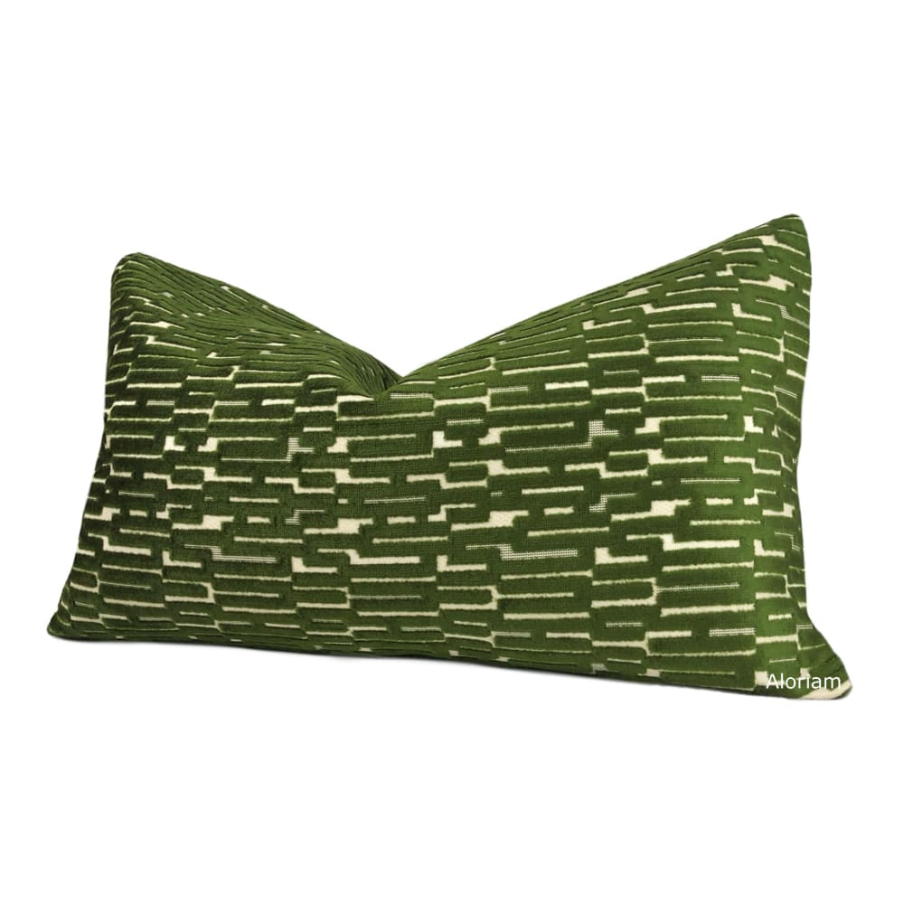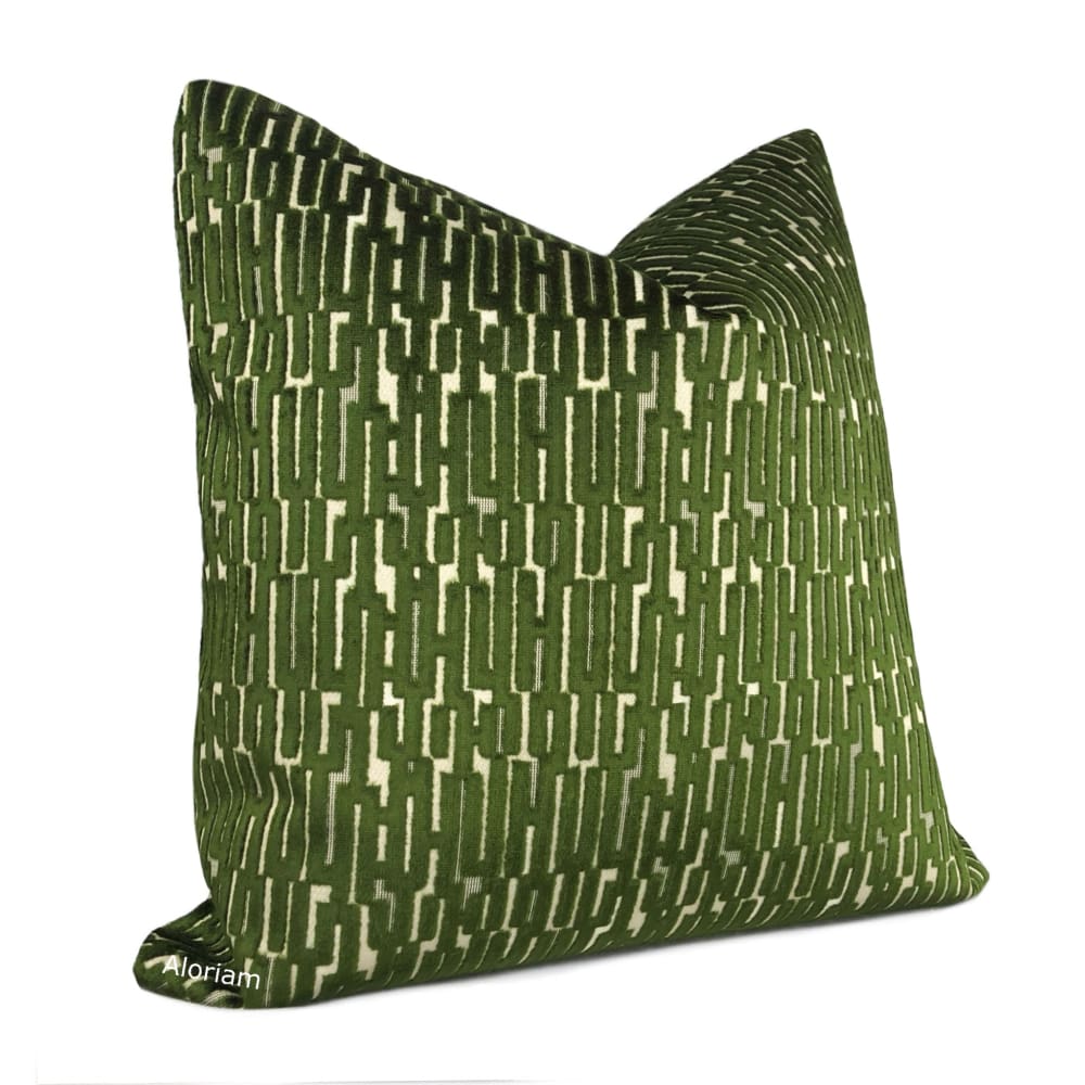The Lincoln pillow cover features an eye-catching geometric design woven in a moss green velvet.