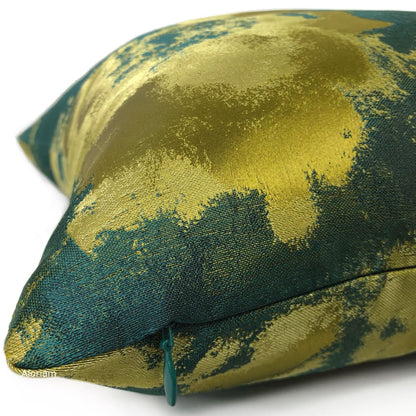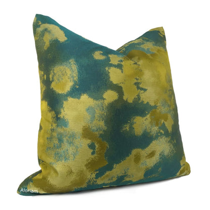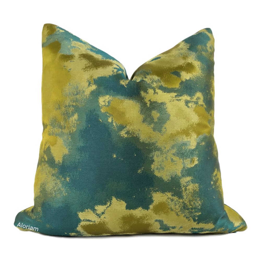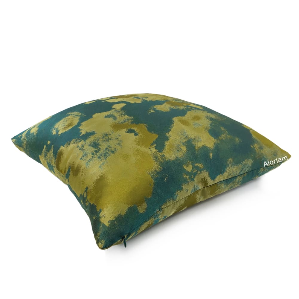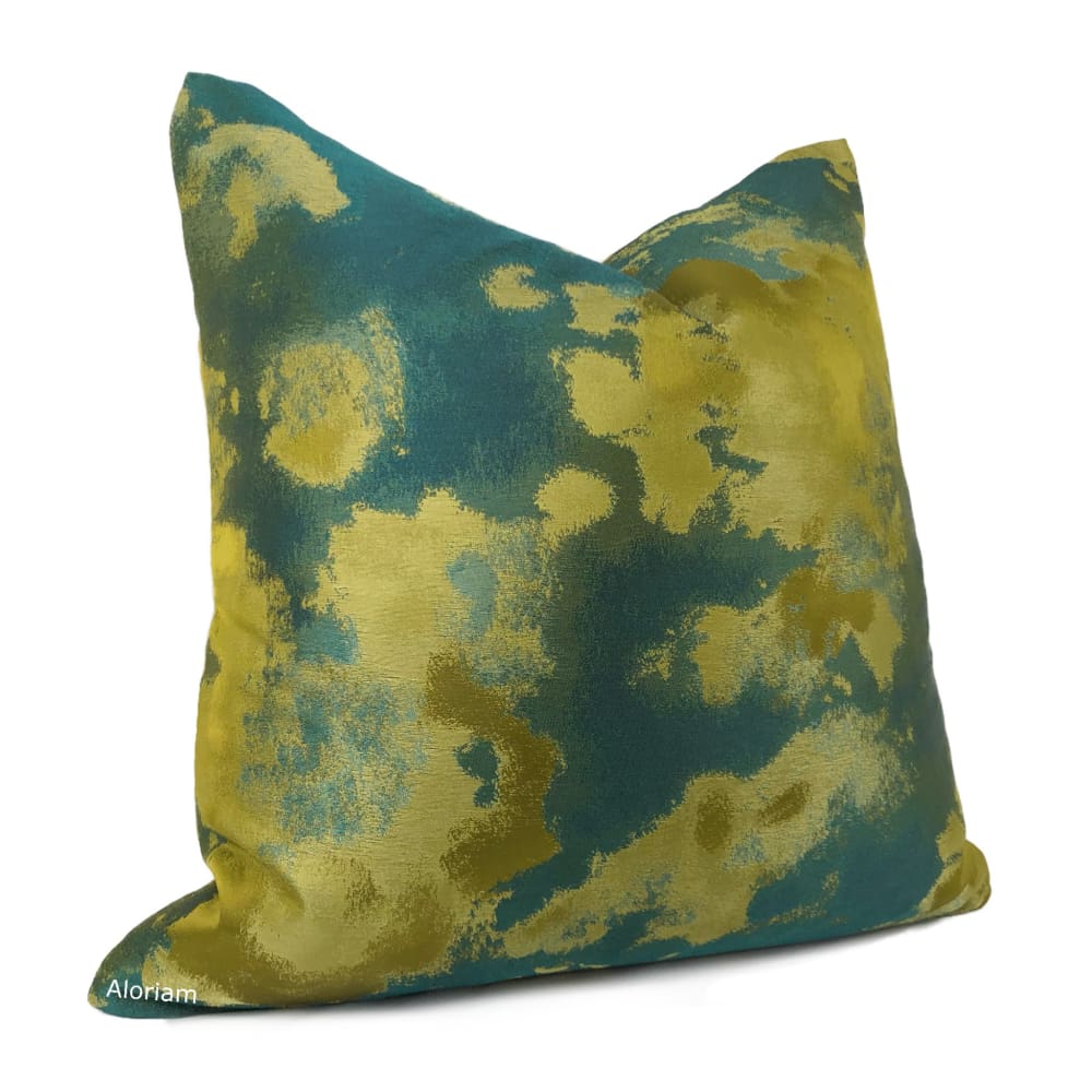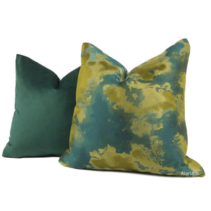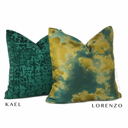 The Lorenzo pillow cover brings together a rich color palette of dark greens and golden chartreuse in a tonal abstract design.