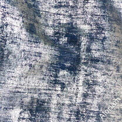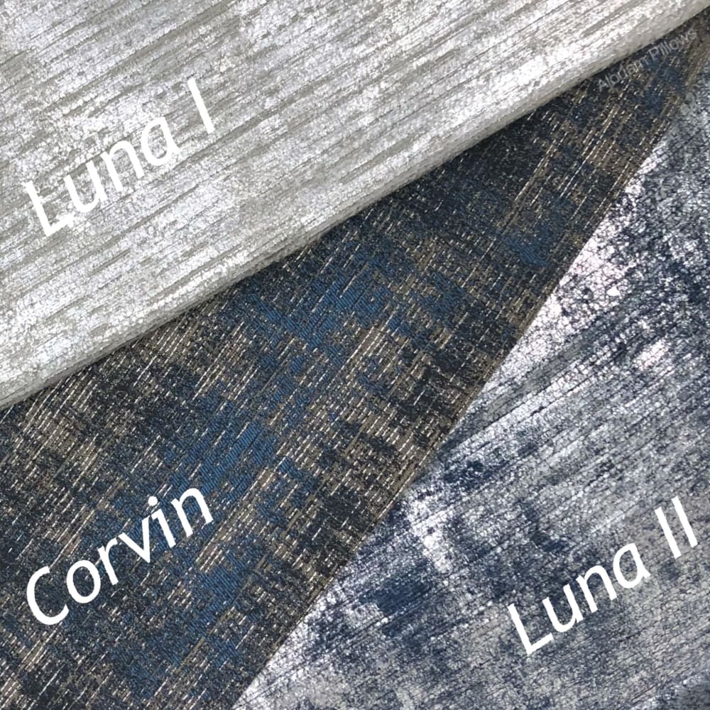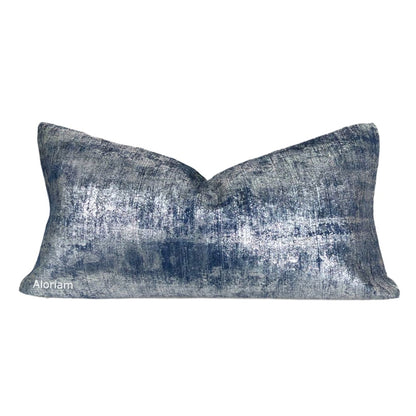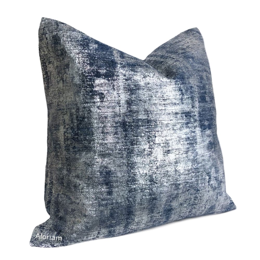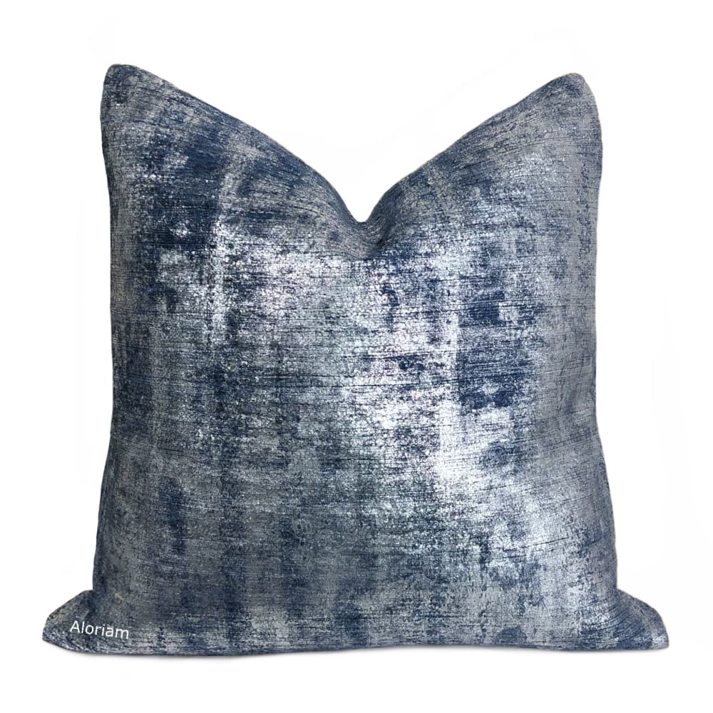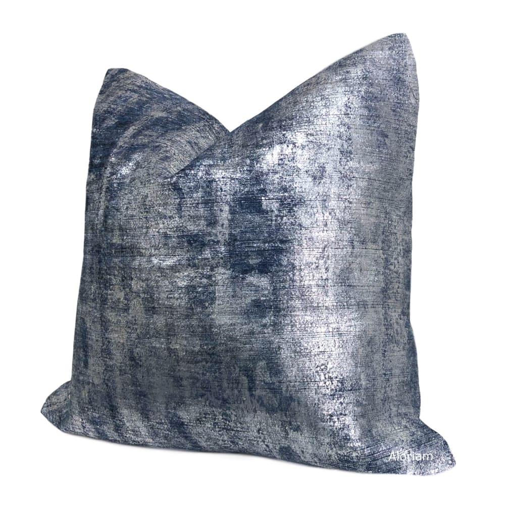 The Luna II pillow cover features a reflective metallic silver glaze printed on blue chenille.