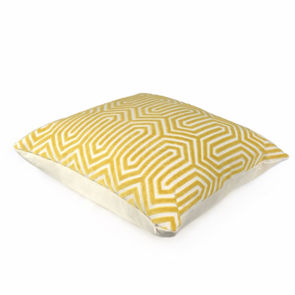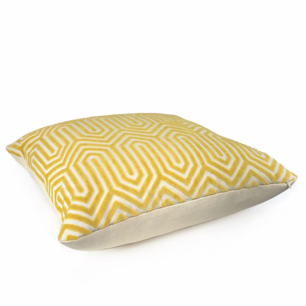 The Maestro pillow cover features a striking geometric design woven in yellow cut velvet on a cream background.