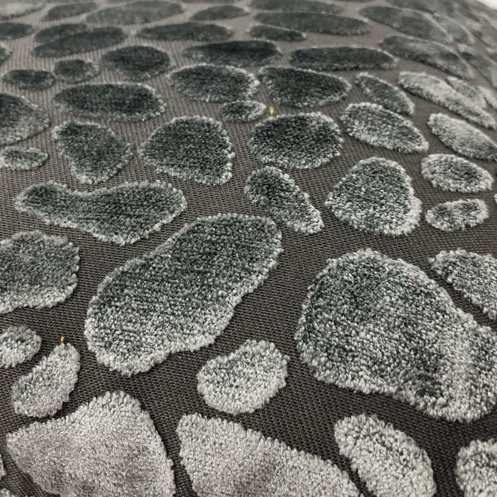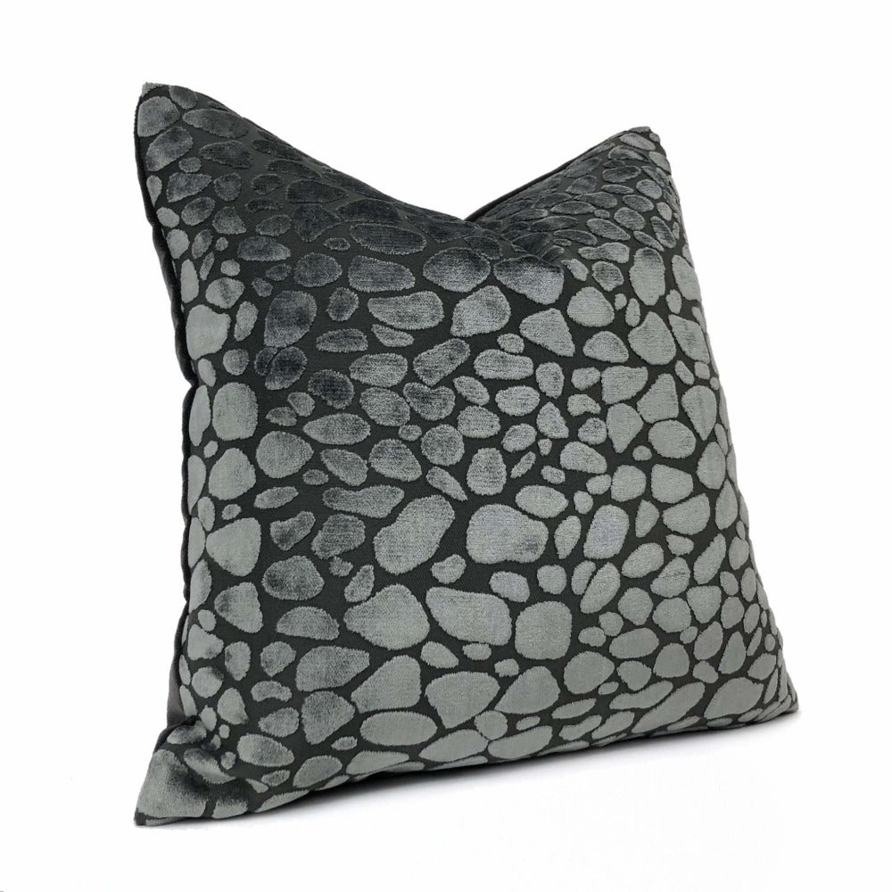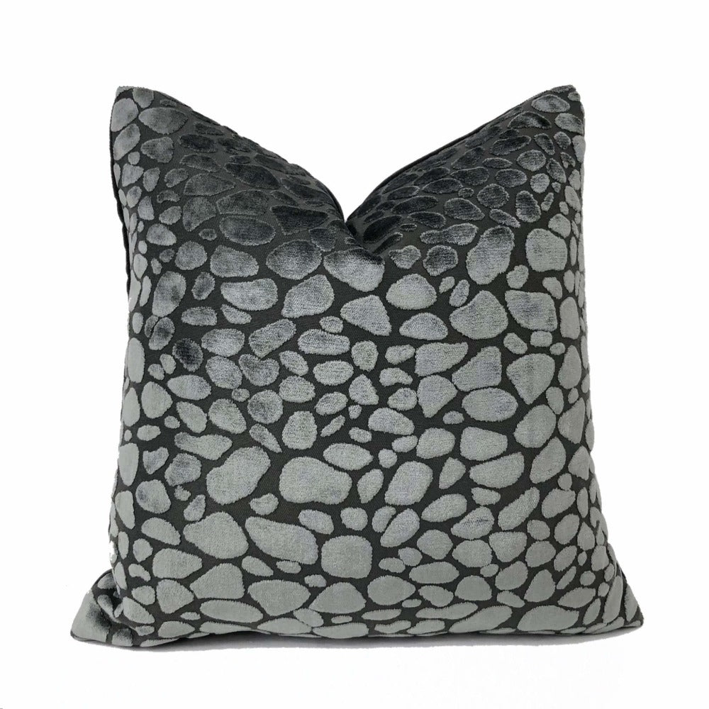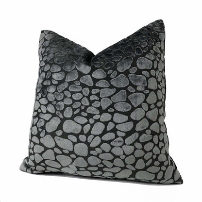 This dark gray velvet pillow cover features a modernized animal spot or pebble pattern. The spots have a raised, soft velvet texture, contrasted against a matte woven background.