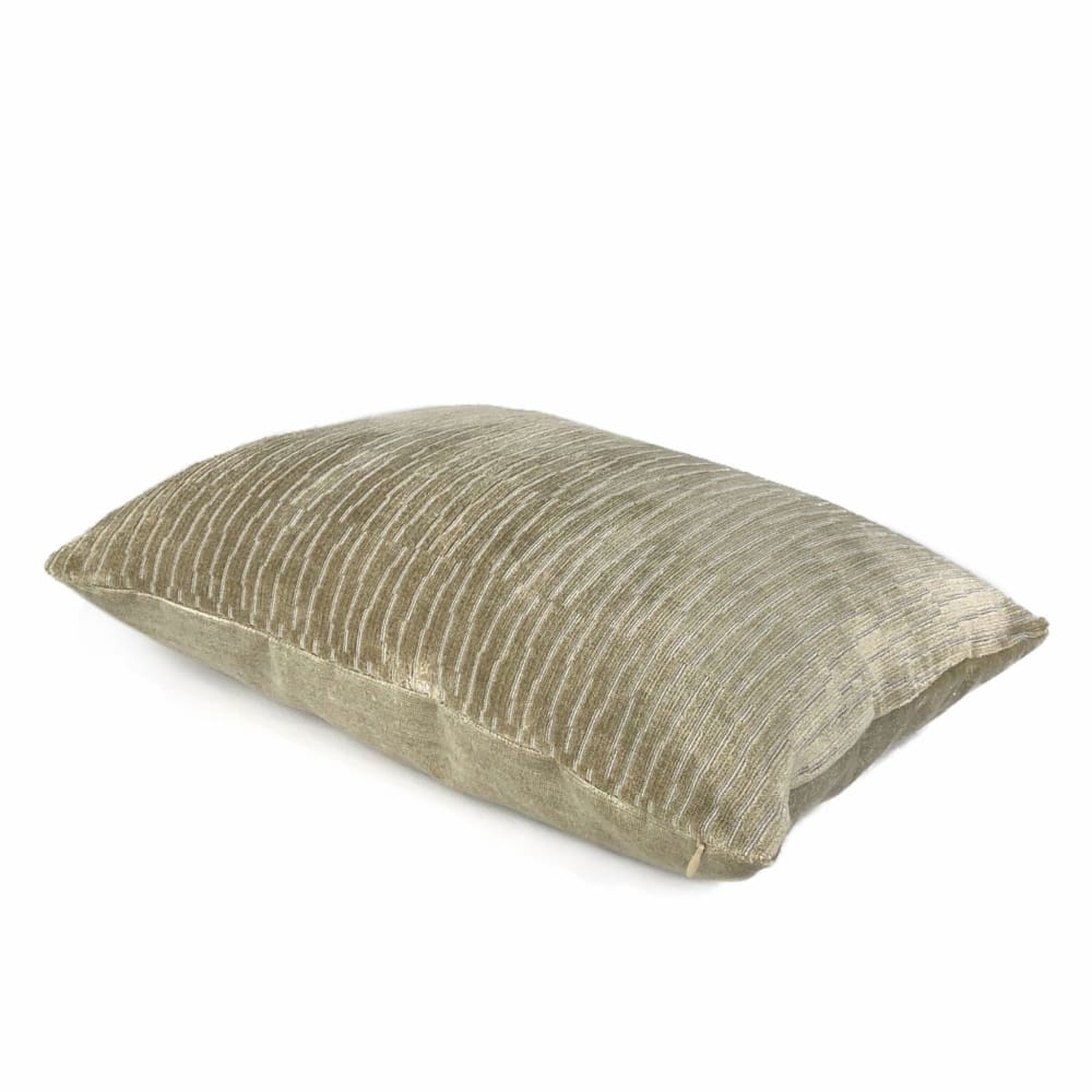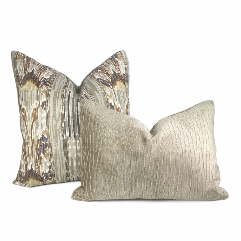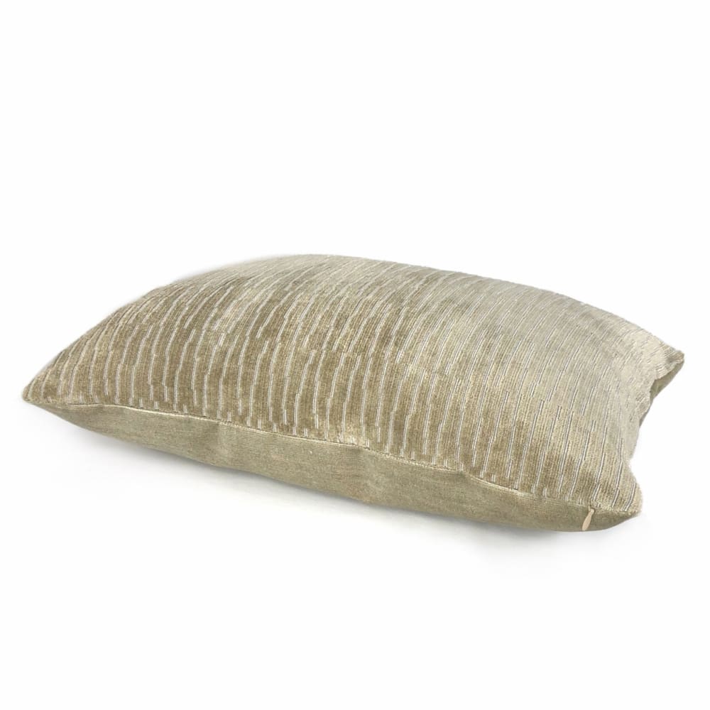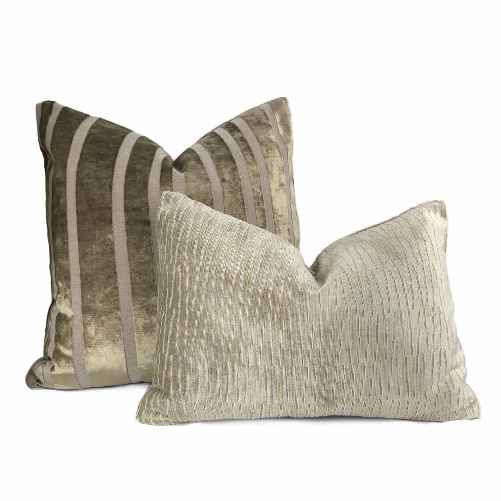 Our limited edition Bresis pillow cover features a subtle zig zag pattern woven in light taupe brown. This luscious designer velvet designed by Manuel Canovas for Cowtan & Tout retails for over $200/yard and is a rare find. Don’t miss it! Photograph shows the 13x19 cover (filled with a 14x20 insert).