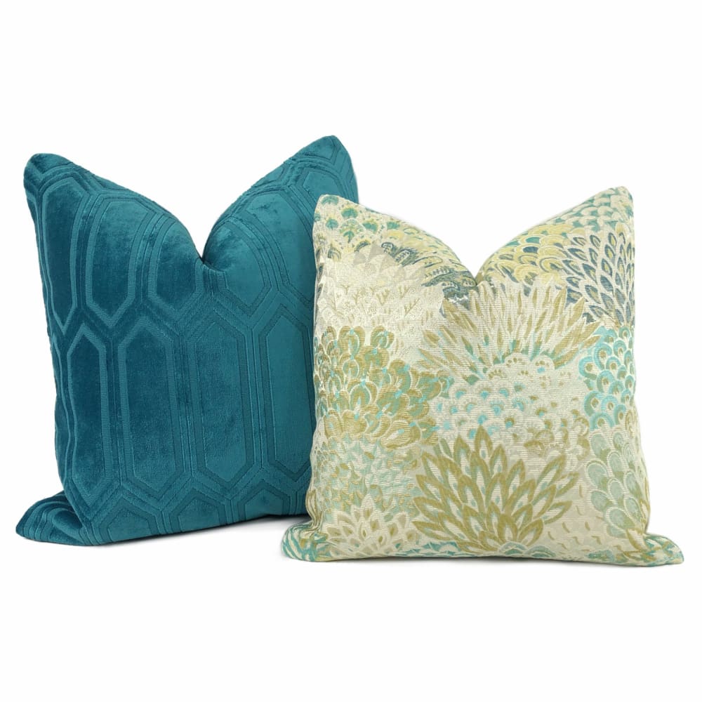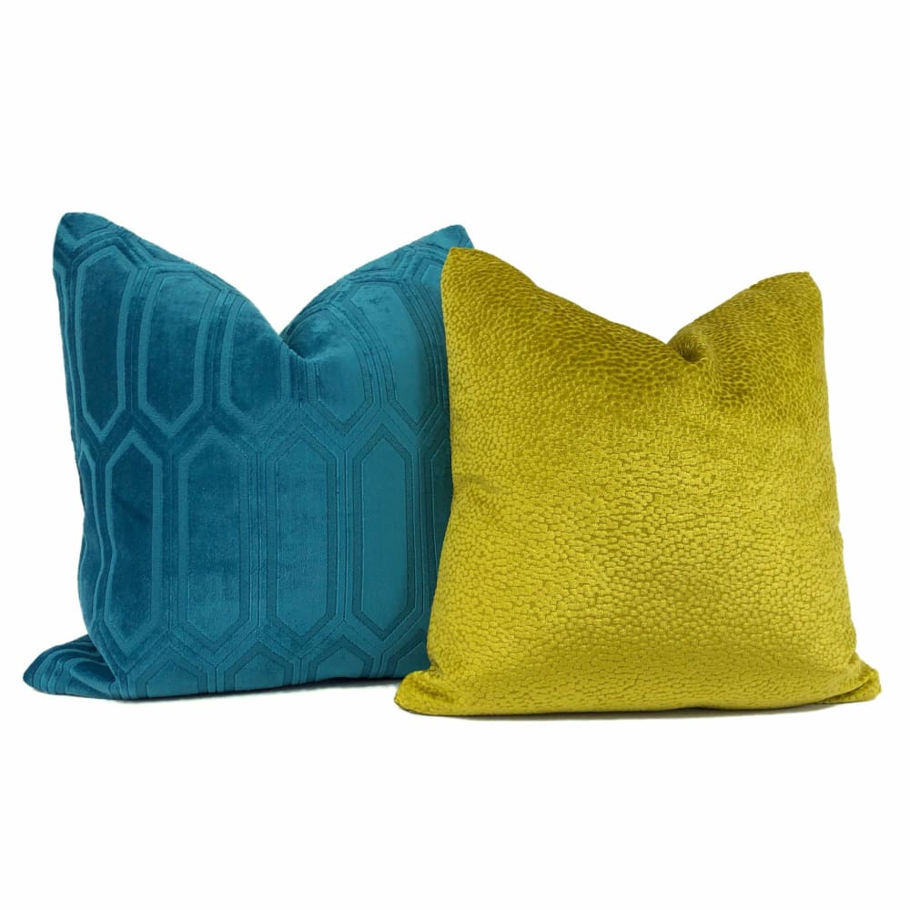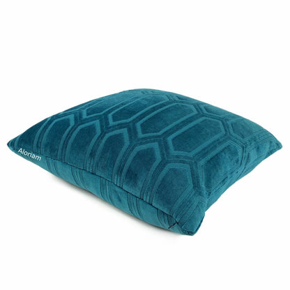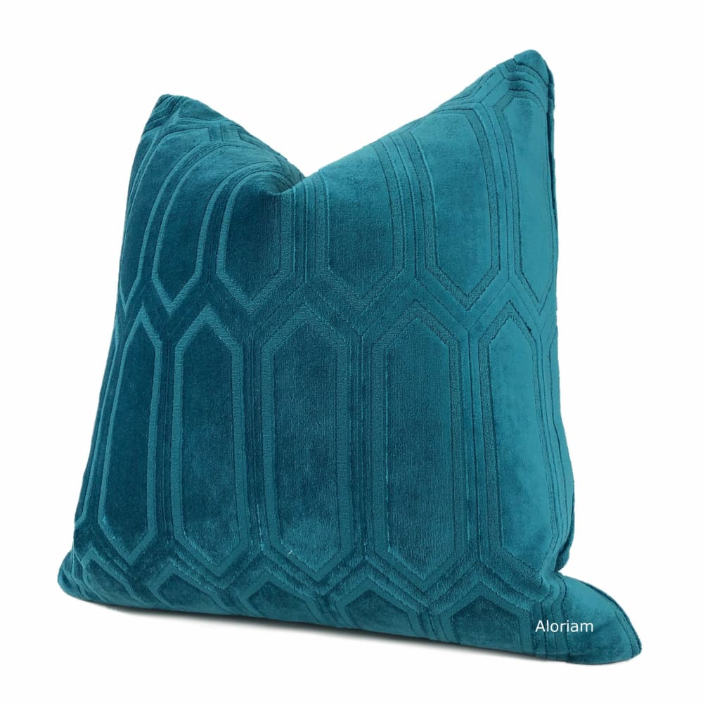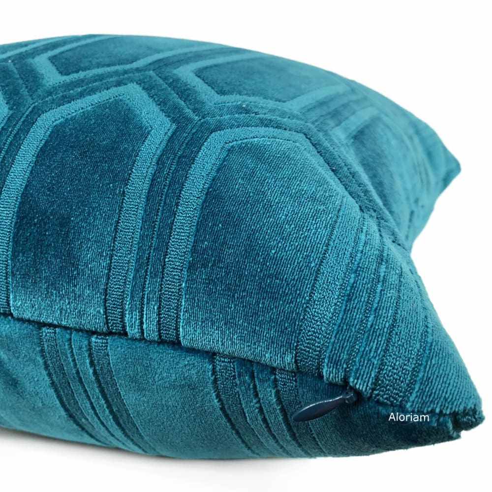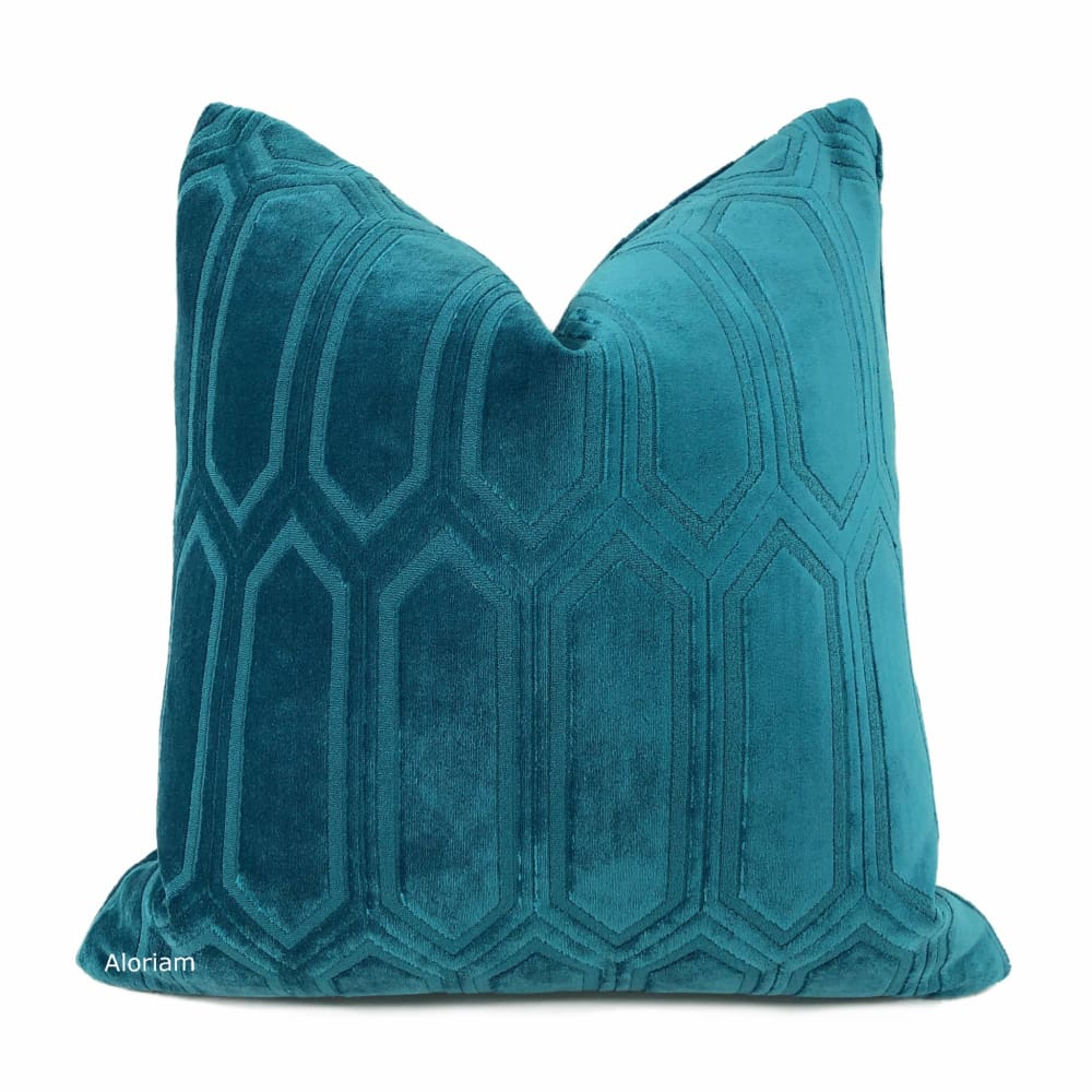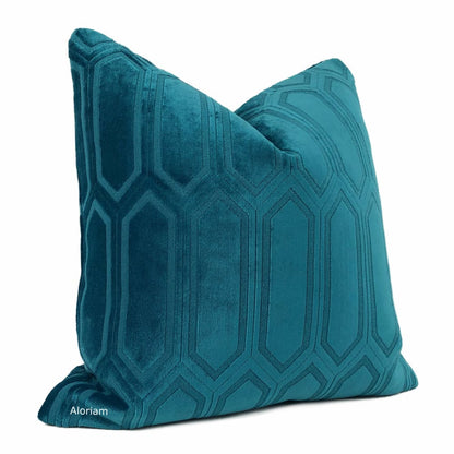 The Markham velvet pillow cover brings a dramatic hexagonal pattern to you in a stunning shade of peacock teal.
