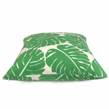 Martinique is a fresh and modern palm leaf print pillow cover in green and off-white. Home decor cotton drapery pattern fabric on both sides. Photographed on 17x17 cover (filled with 18x18 insert).