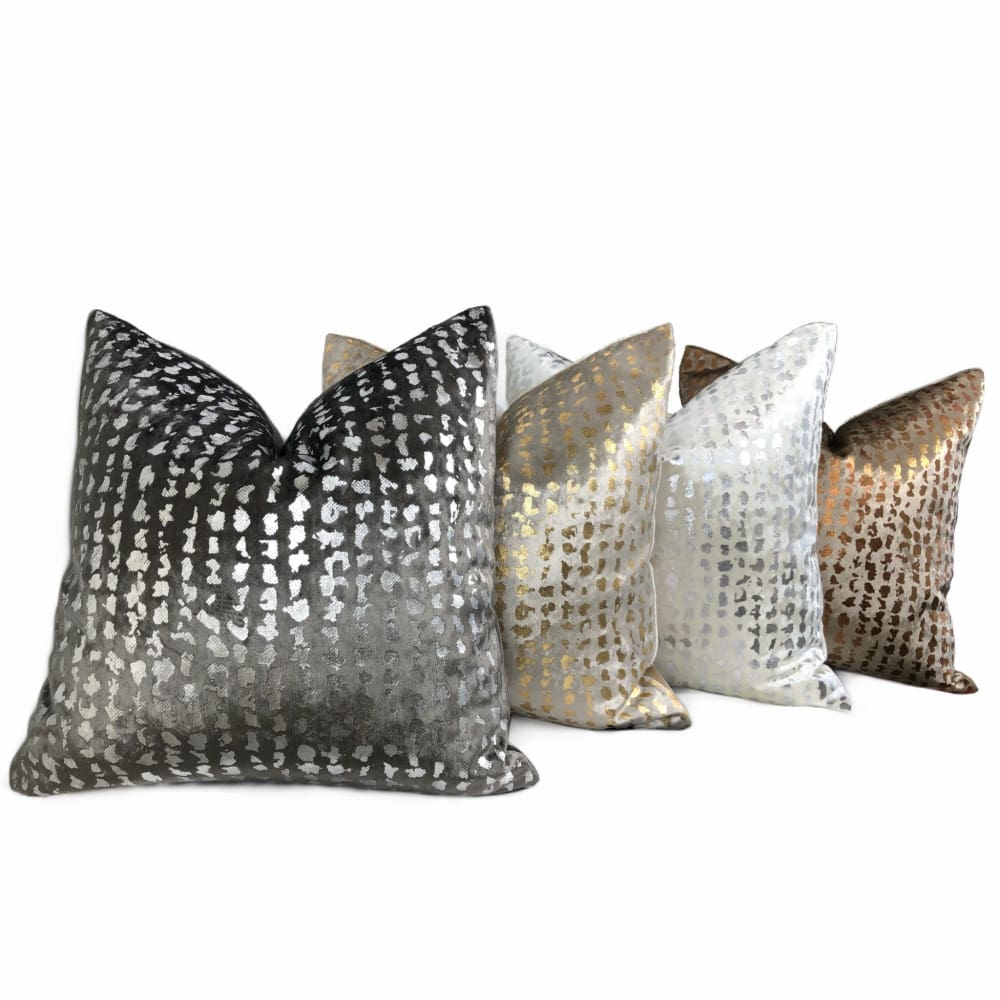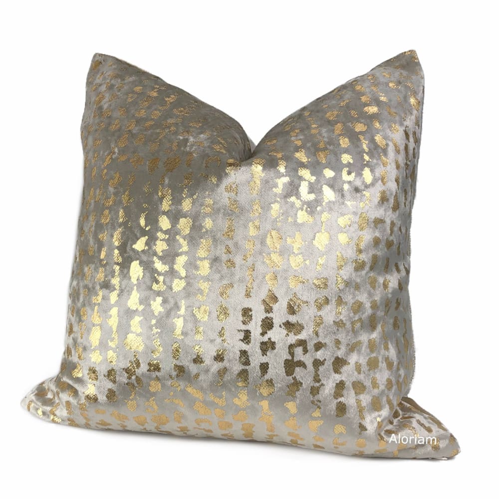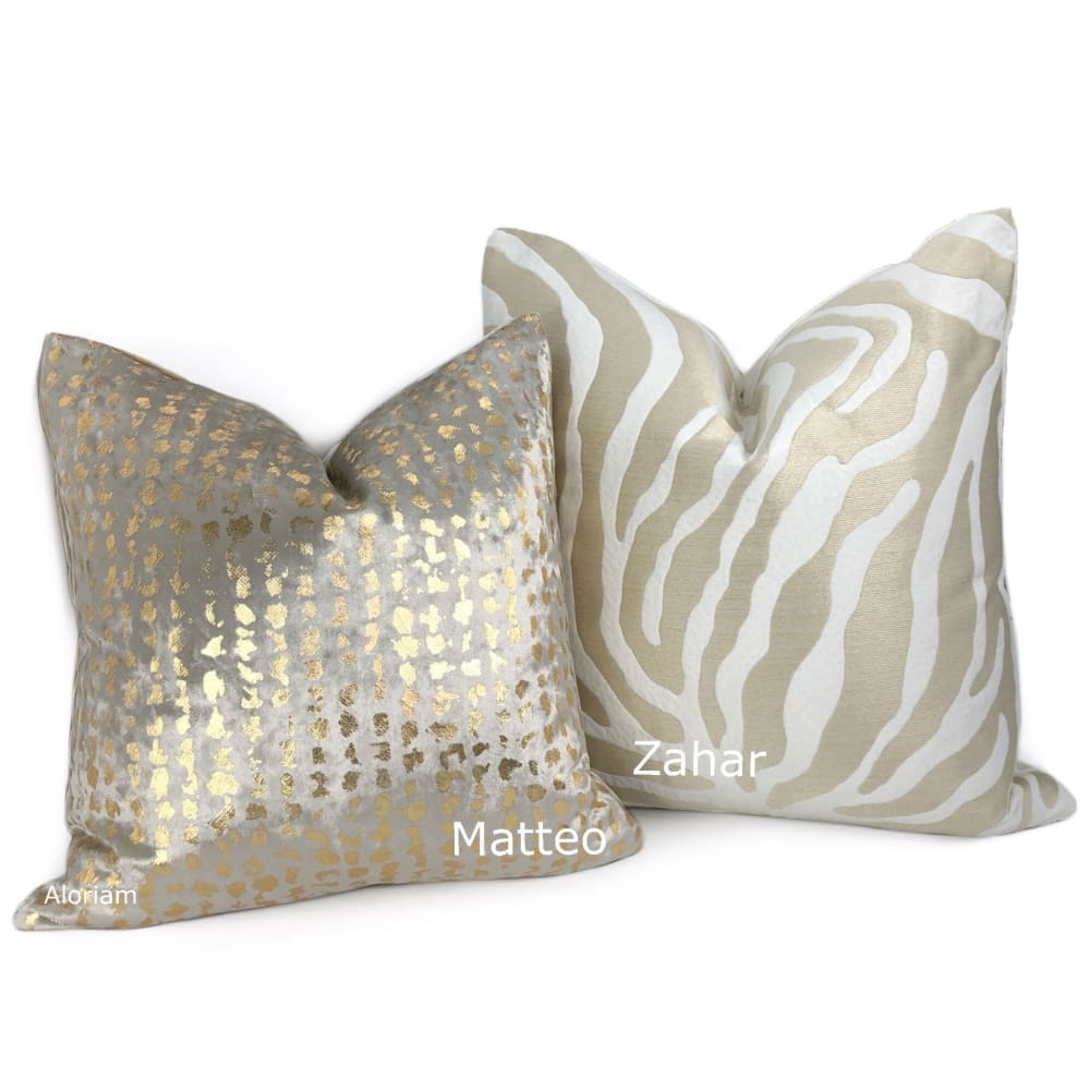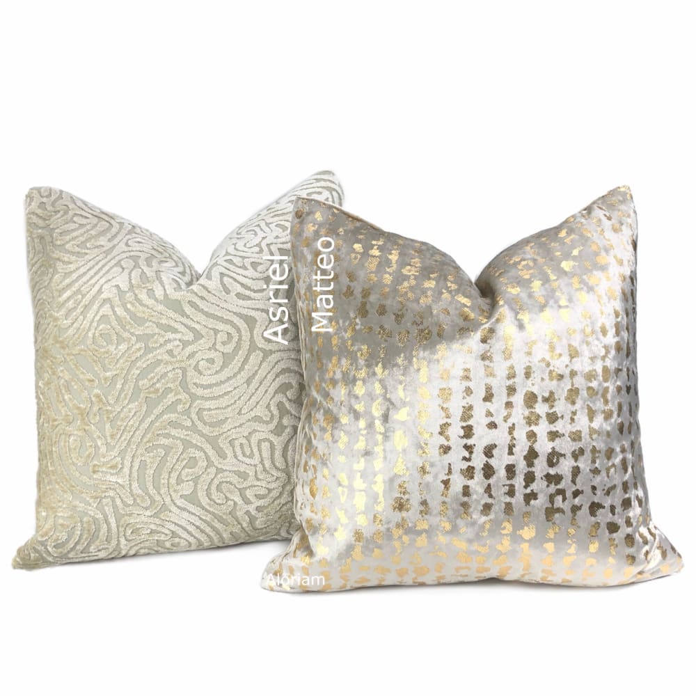 Low stock! The Matteo pillow cover merges an abstract leopard print with velvet and metallic textures. With a lustrous champagne polyester velvet as the base, a gold metallic overlay brings the classic leopard pattern to bold new heights. Photographed on 17x17 cover (filled with 18x18 insert). Offered in your choice of the pattern fabric on both sides or with a coordinating solid backside.