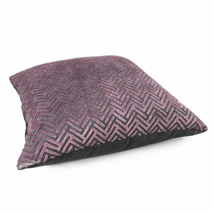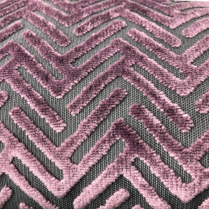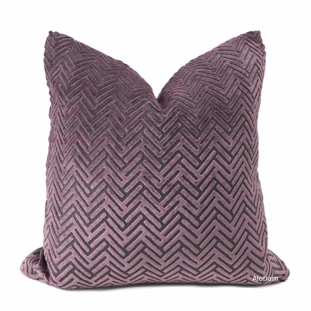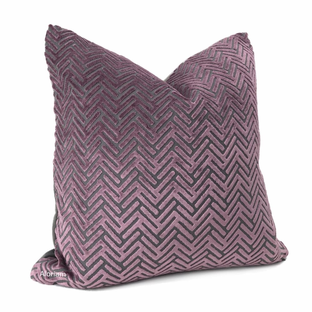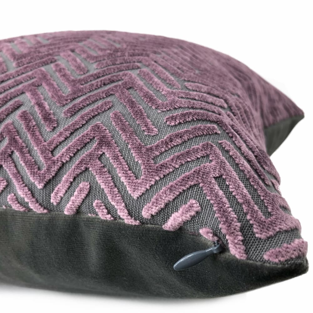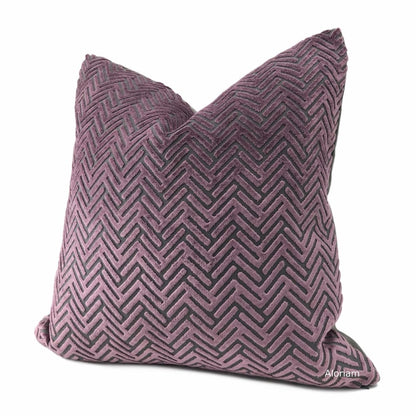 This geometric pillow cover features textured velvet chevrons woven in purplish mauve on a dark gray background. The backside of the cover is a coordinating solid gray velvet.