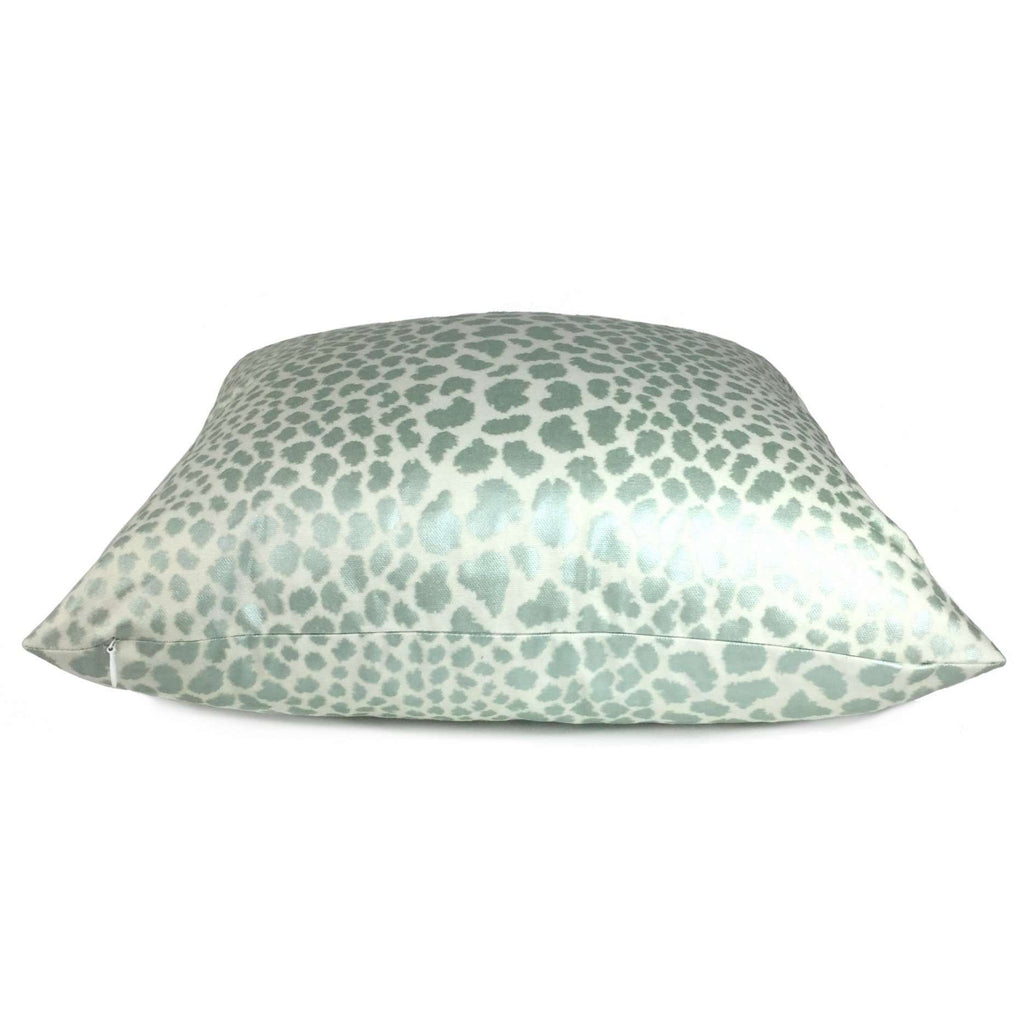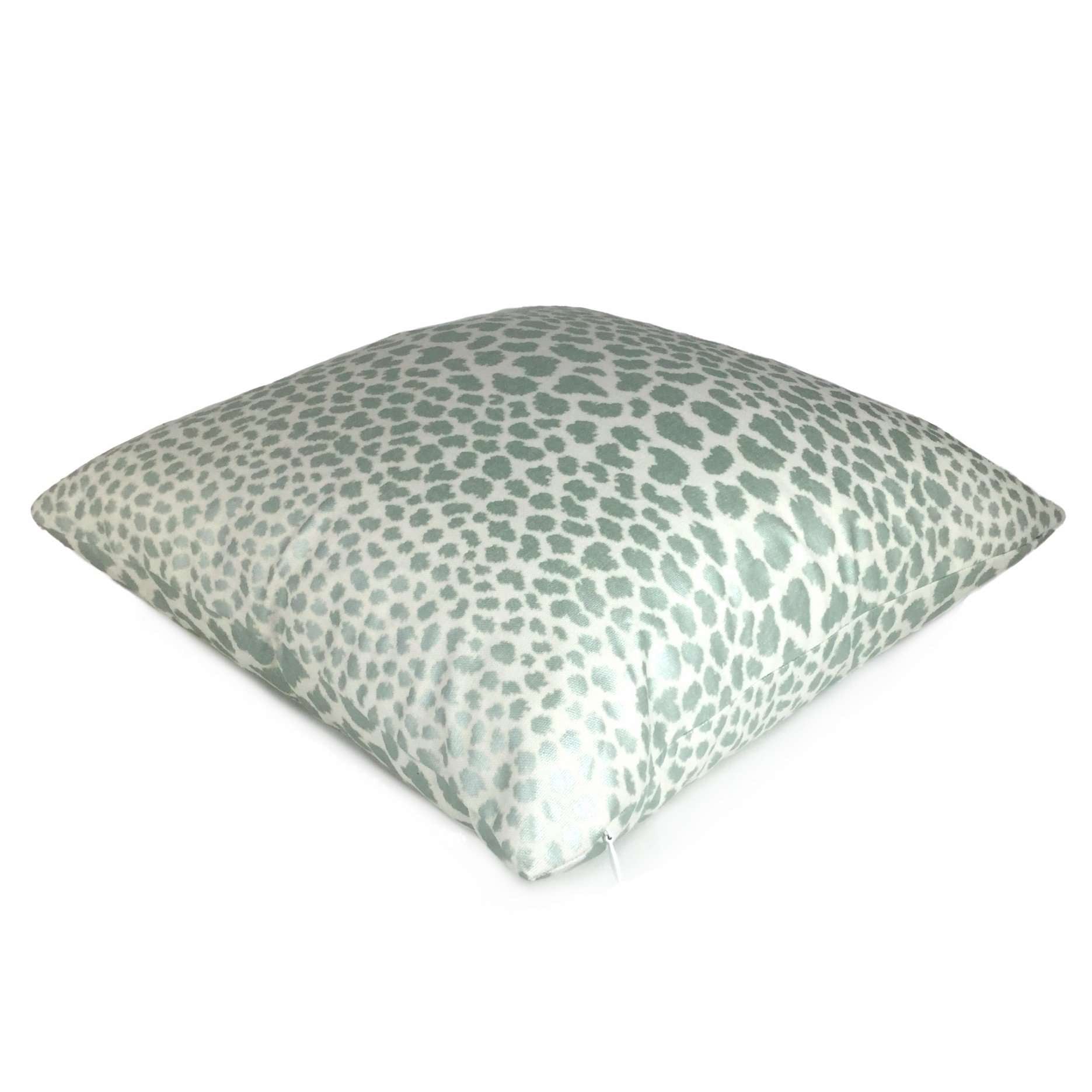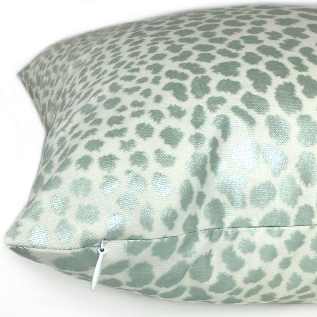 Almost sold out! This leopard print pillow cover features a chic animal spotted pattern printed in metallic aqua on a creamy white background. The color is a silvery bluish-green that shines with a brilliant luster under bright lights. Designer pattern fabric has a soil and stain resistant finish. Photographed on 17x17 cover (filled with 18x18 insert).