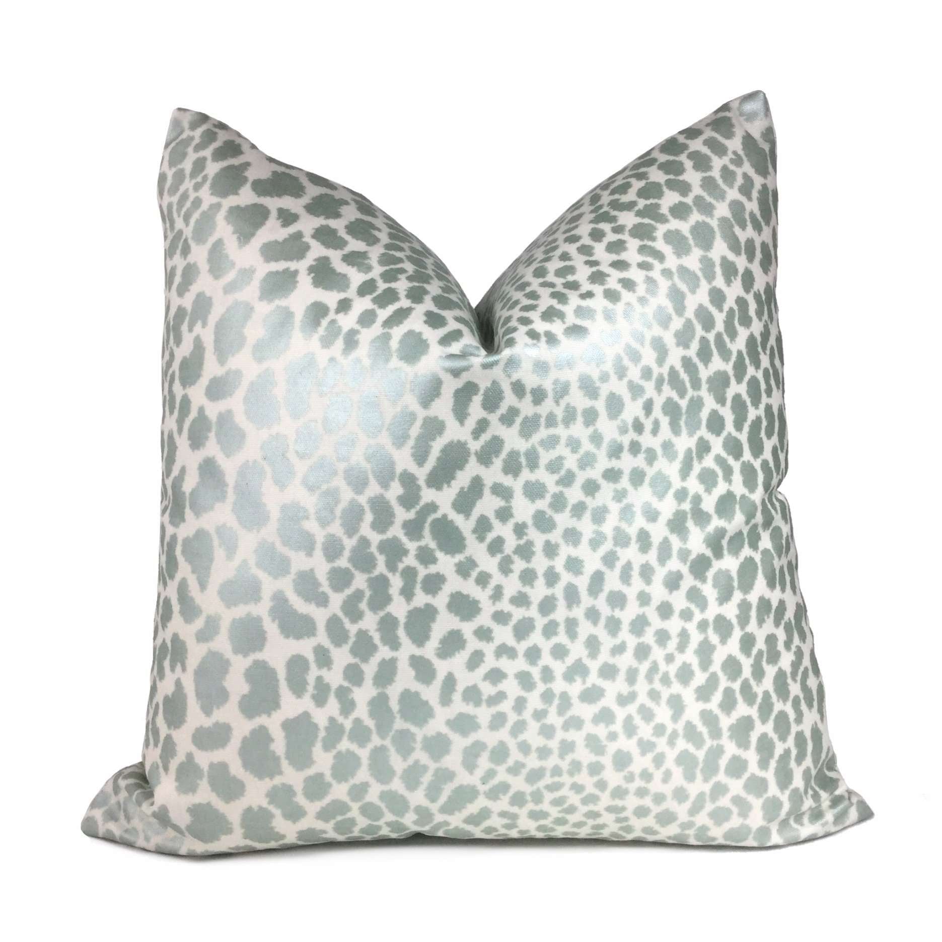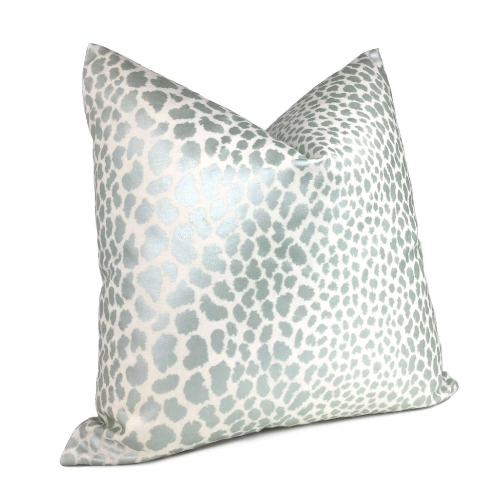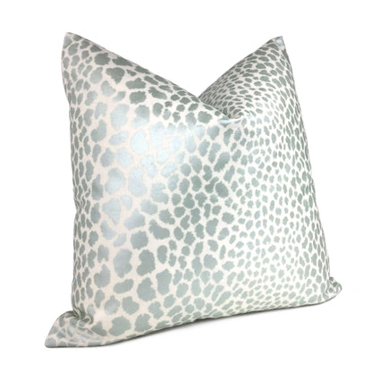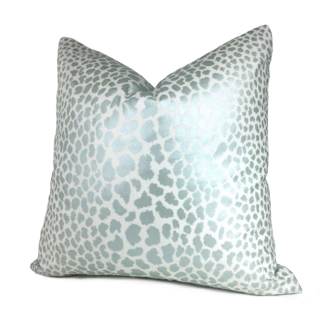 Almost sold out! This leopard print pillow cover features a chic animal spotted pattern printed in metallic aqua on a creamy white background. The color is a silvery bluish-green that shines with a brilliant luster under bright lights. Designer pattern fabric has a soil and stain resistant finish. Photographed on 17x17 cover (filled with 18x18 insert).