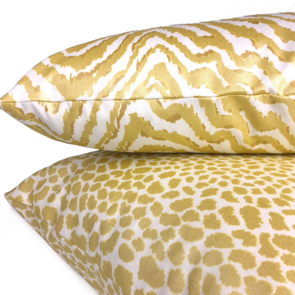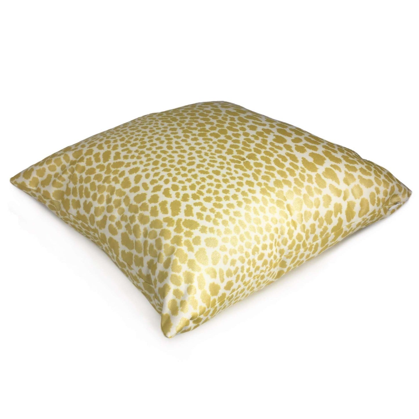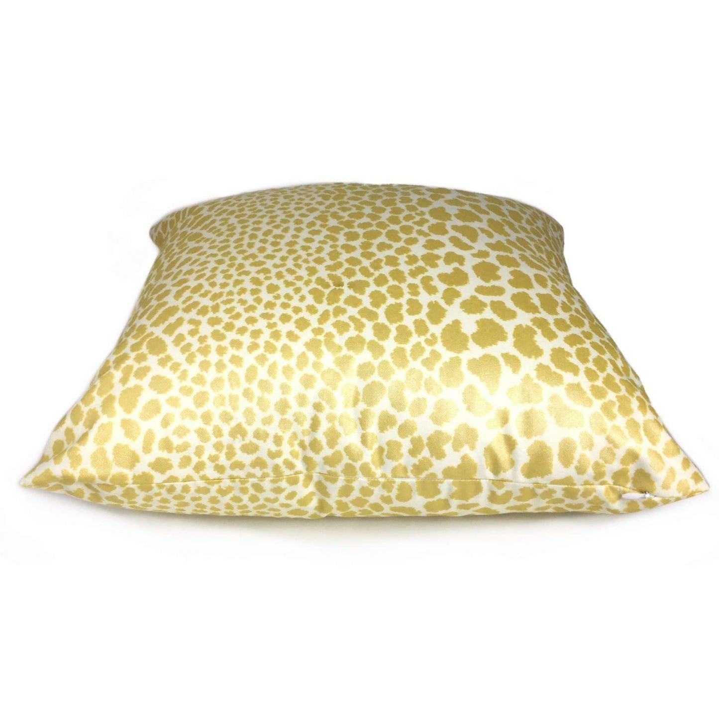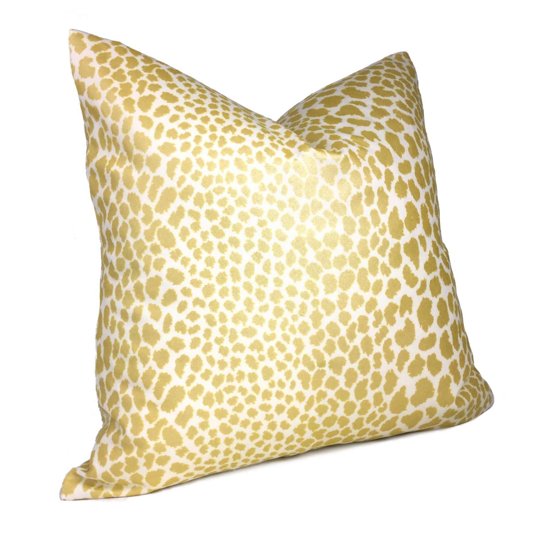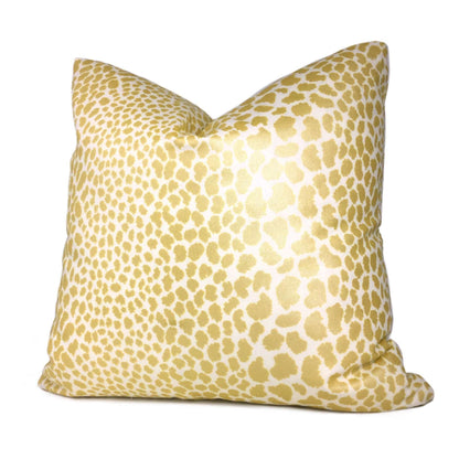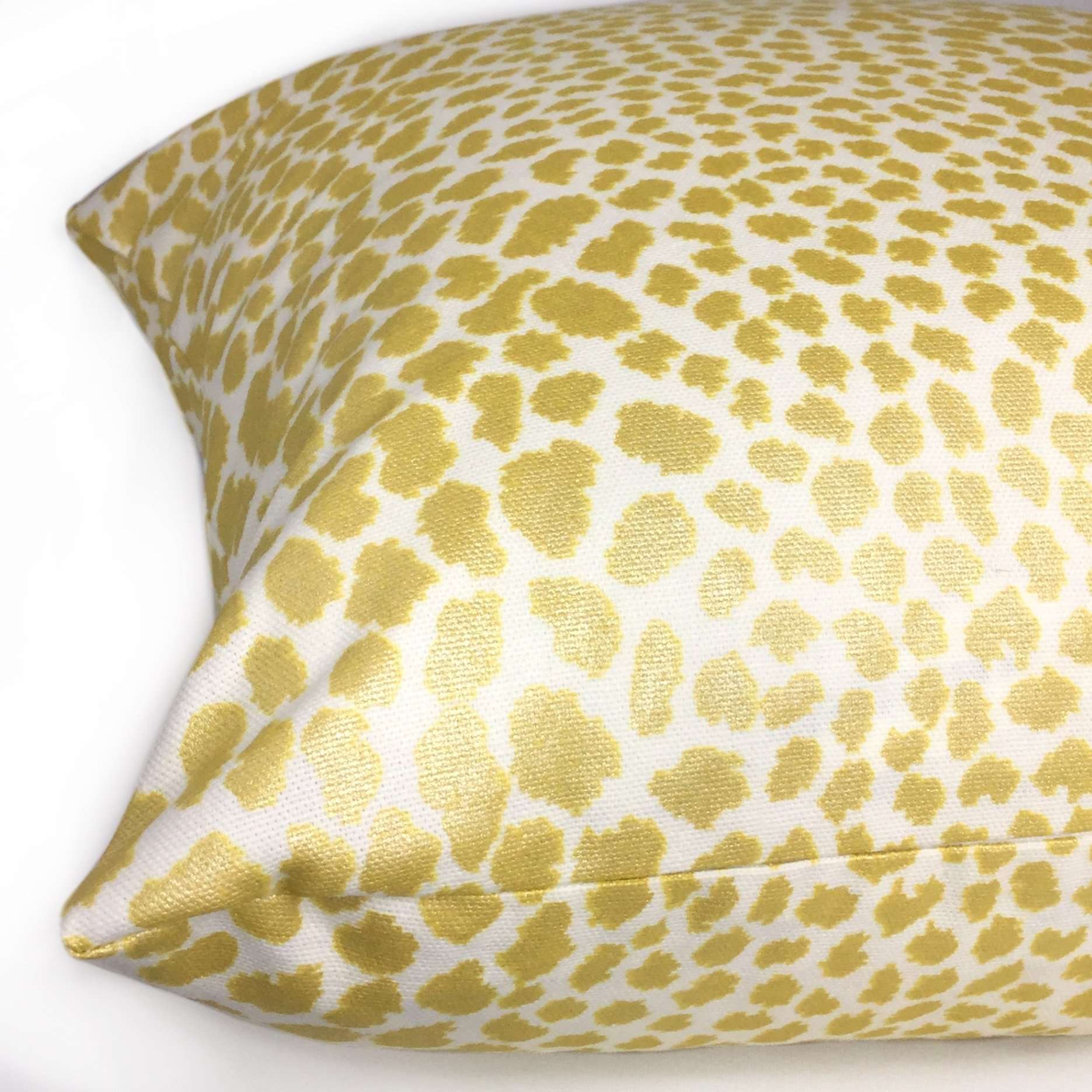 Almost sold out! This animal print pillow cover features a chic leopard spotted pattern printed in metallic gold on a creamy white background. The color is a intense yellow gold that shines with a brilliant luster under bright lights.