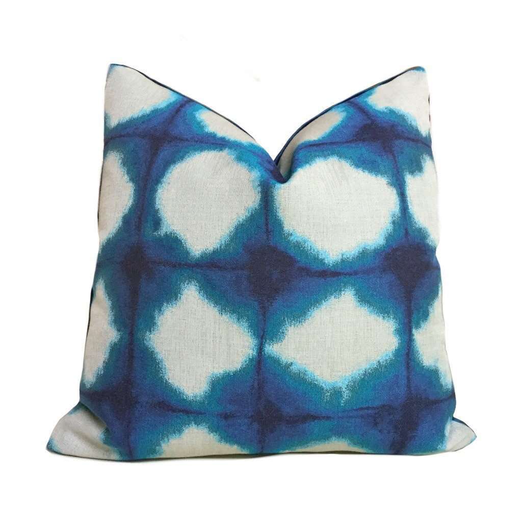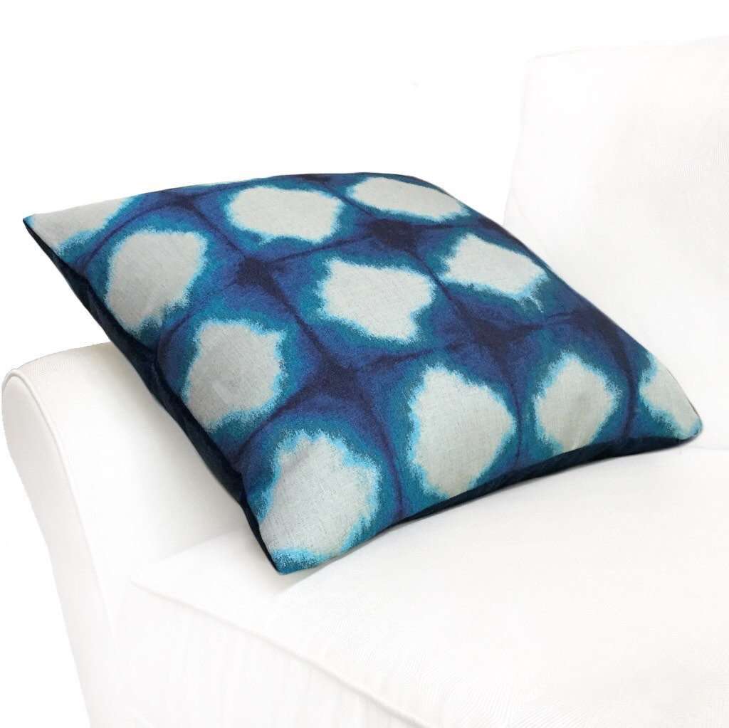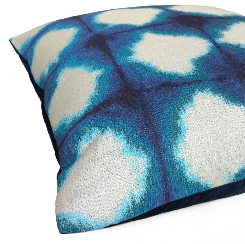 Almost sold out! Strikingly modern, this geometric pillow cover is made from a designer ikat-style fabric. Each square is ringed in navy blue, progressing to ocean blue, green and turquoise towards a pale gray center.