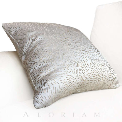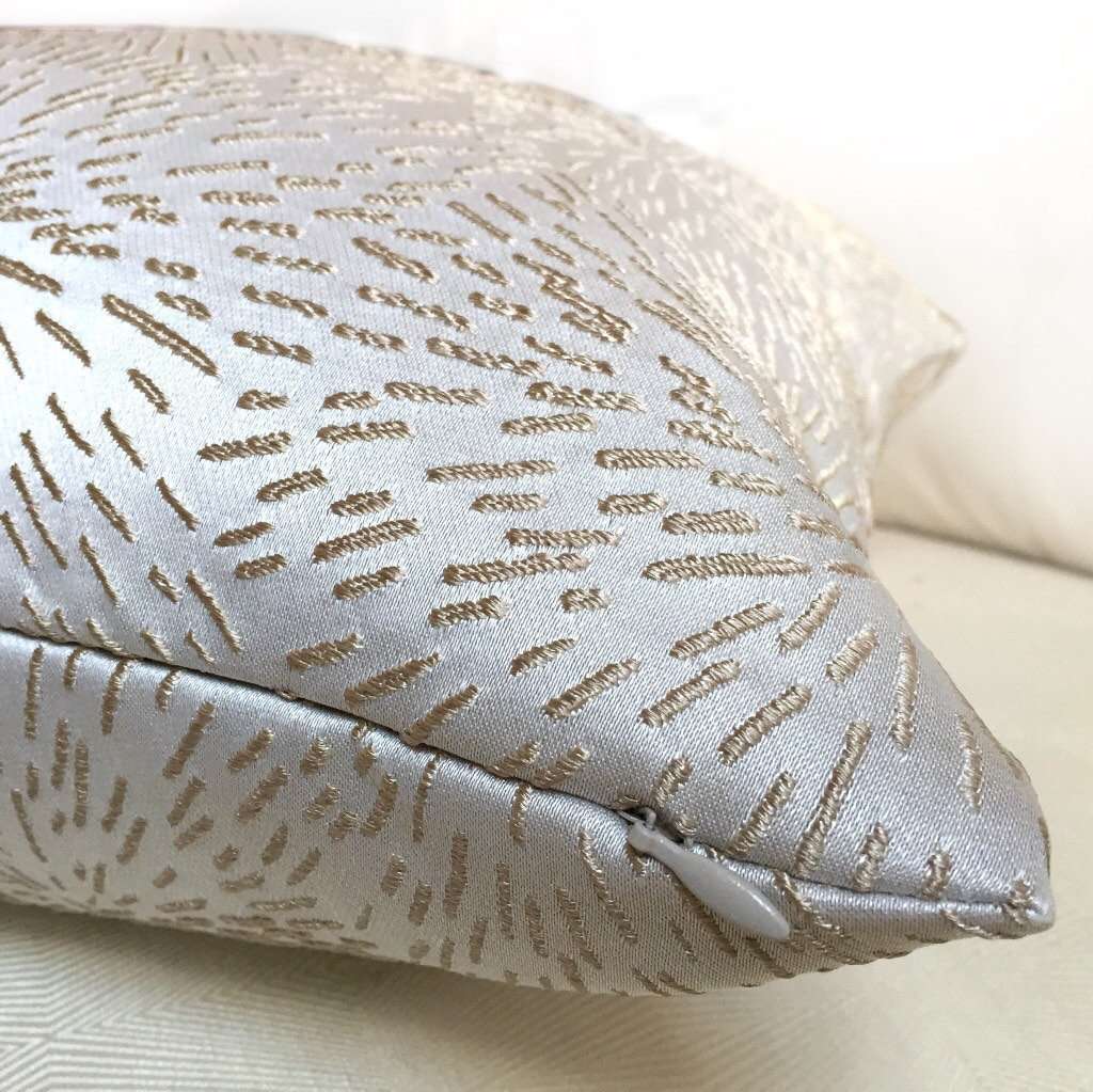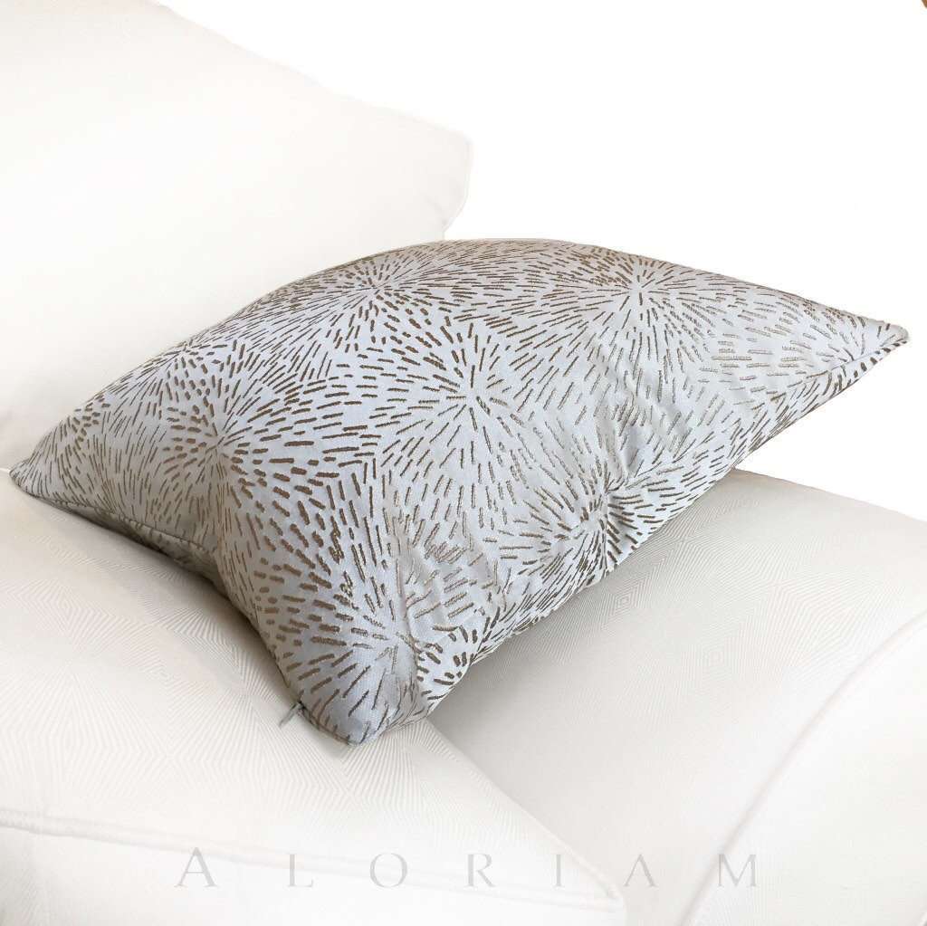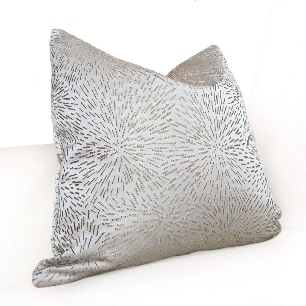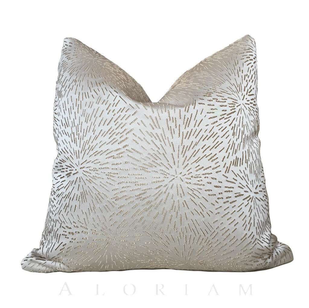 This stunning pillow cover is made from a designer fabric with a modern starburst pattern embroidered in brownish-gold on a neutral cream background. Beautifully woven with amazing detail, this pillow cover is perfect for any contemporary decor.