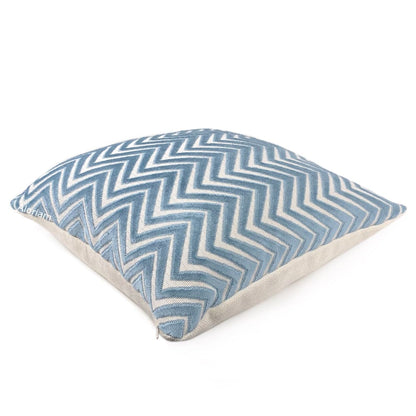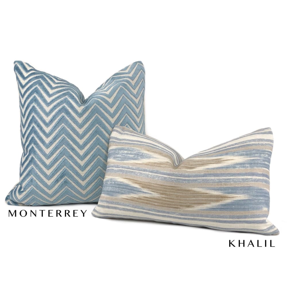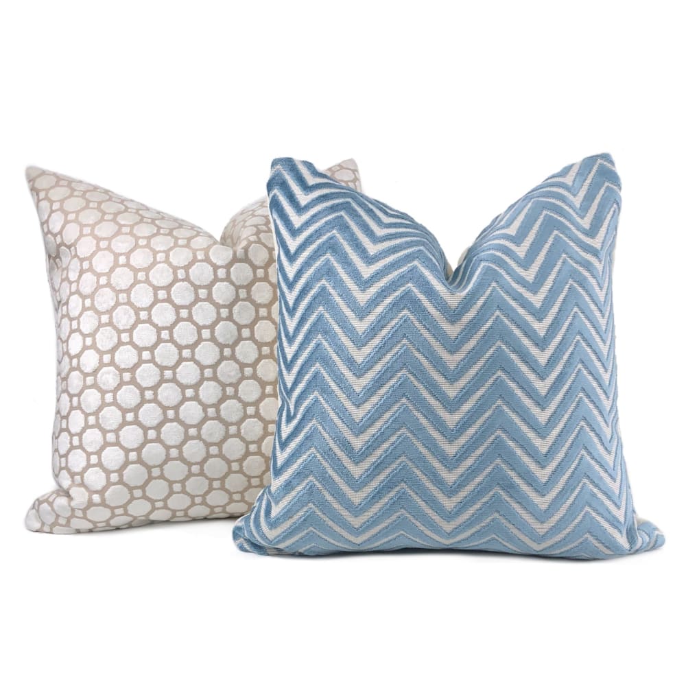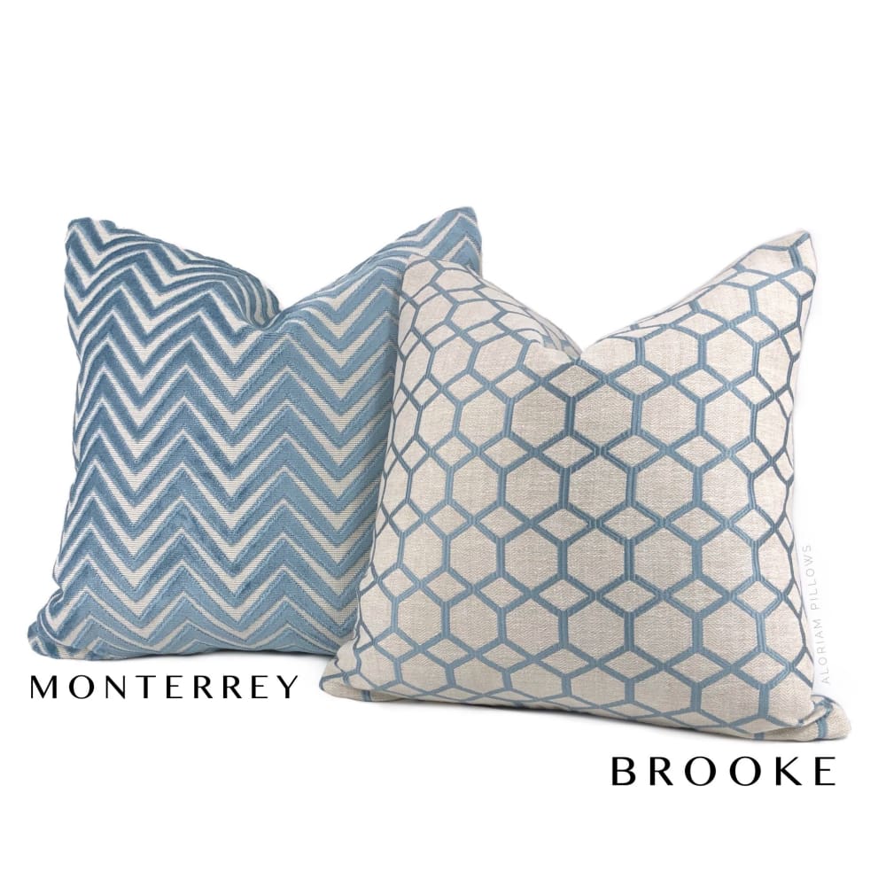 The Monterrey pillow cover features a tapered chevron design woven in surf blue velvet on a cream background. Photographed on 19x19 cover (filled with 20x20 insert).