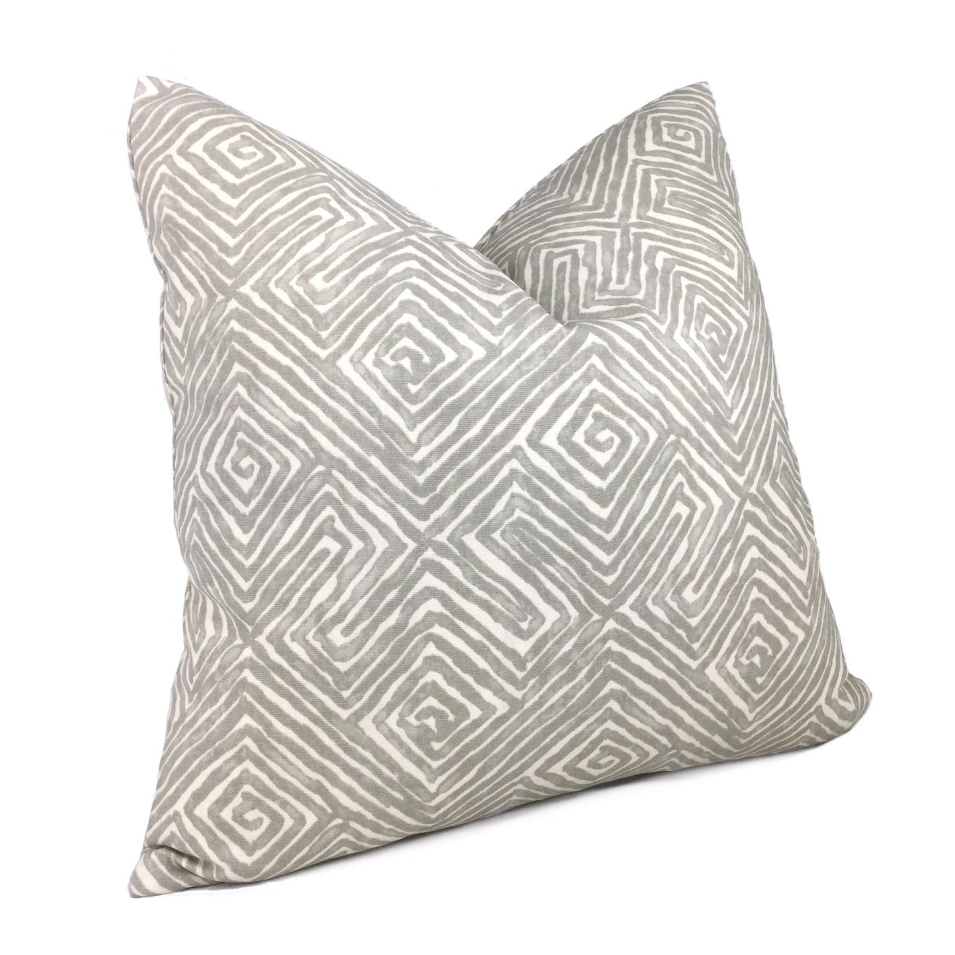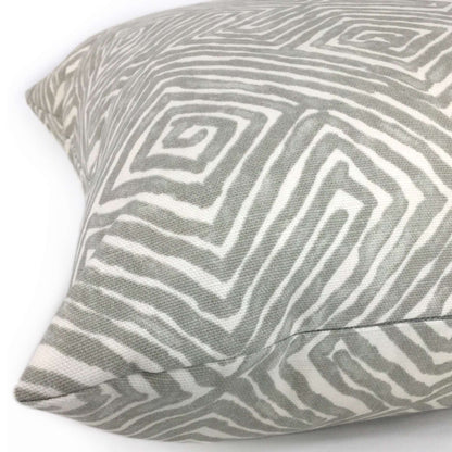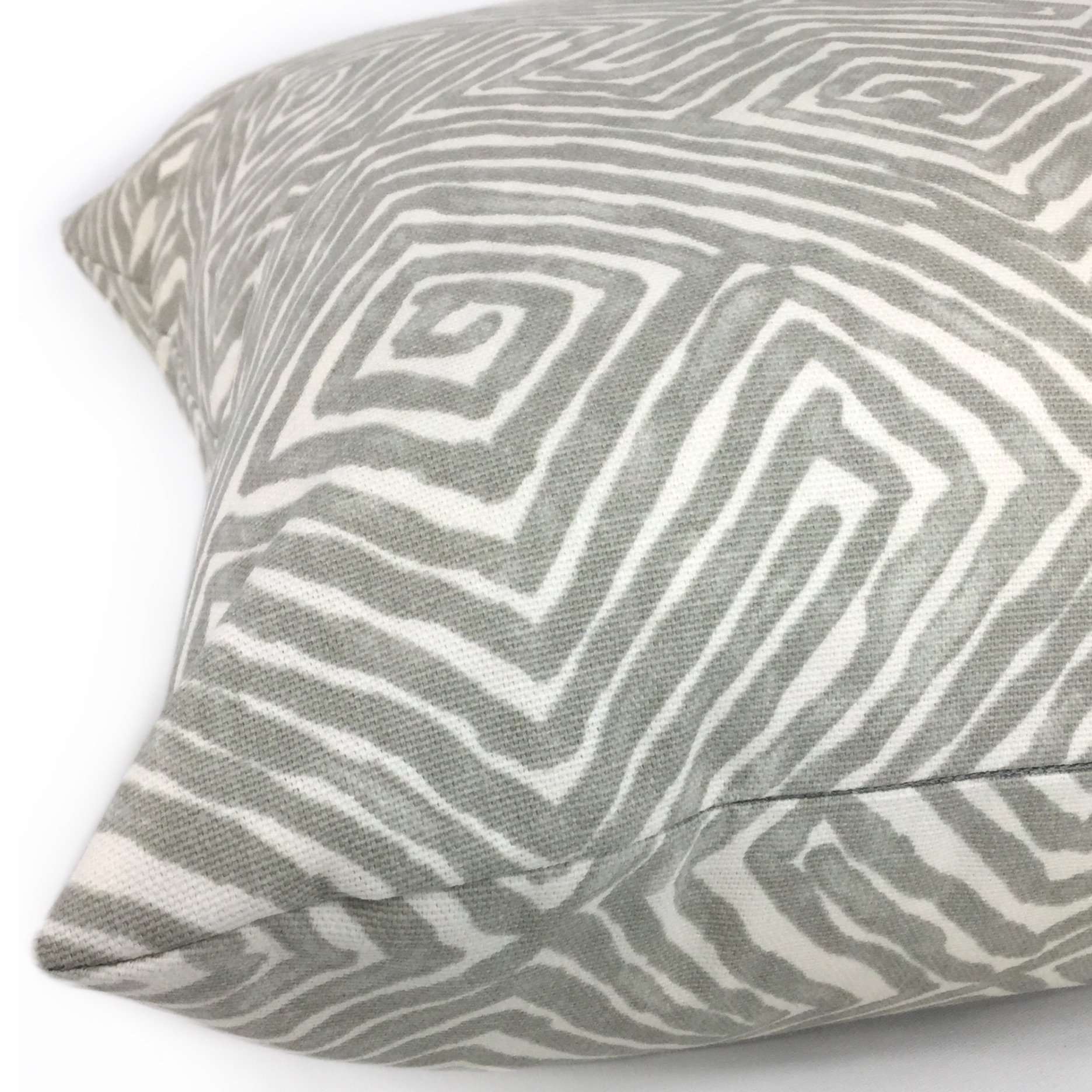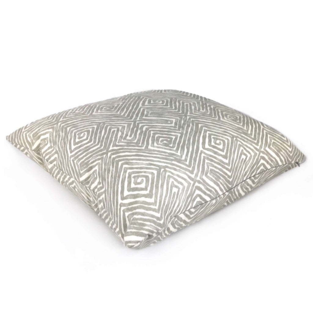 This tribal maze pillow cover is printed in gray on a creamy white background. Nate Berkus designer pattern fabric is used on both sides. Photographed on 19x19 cover (filled with 20x20 insert).