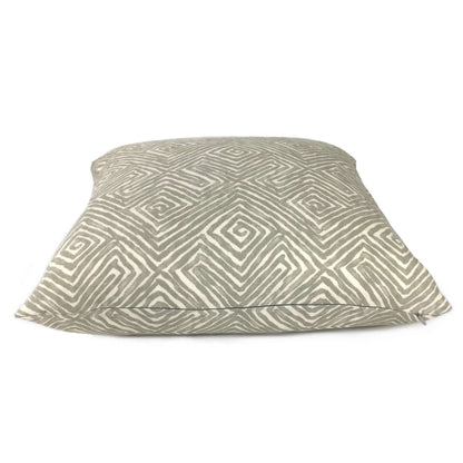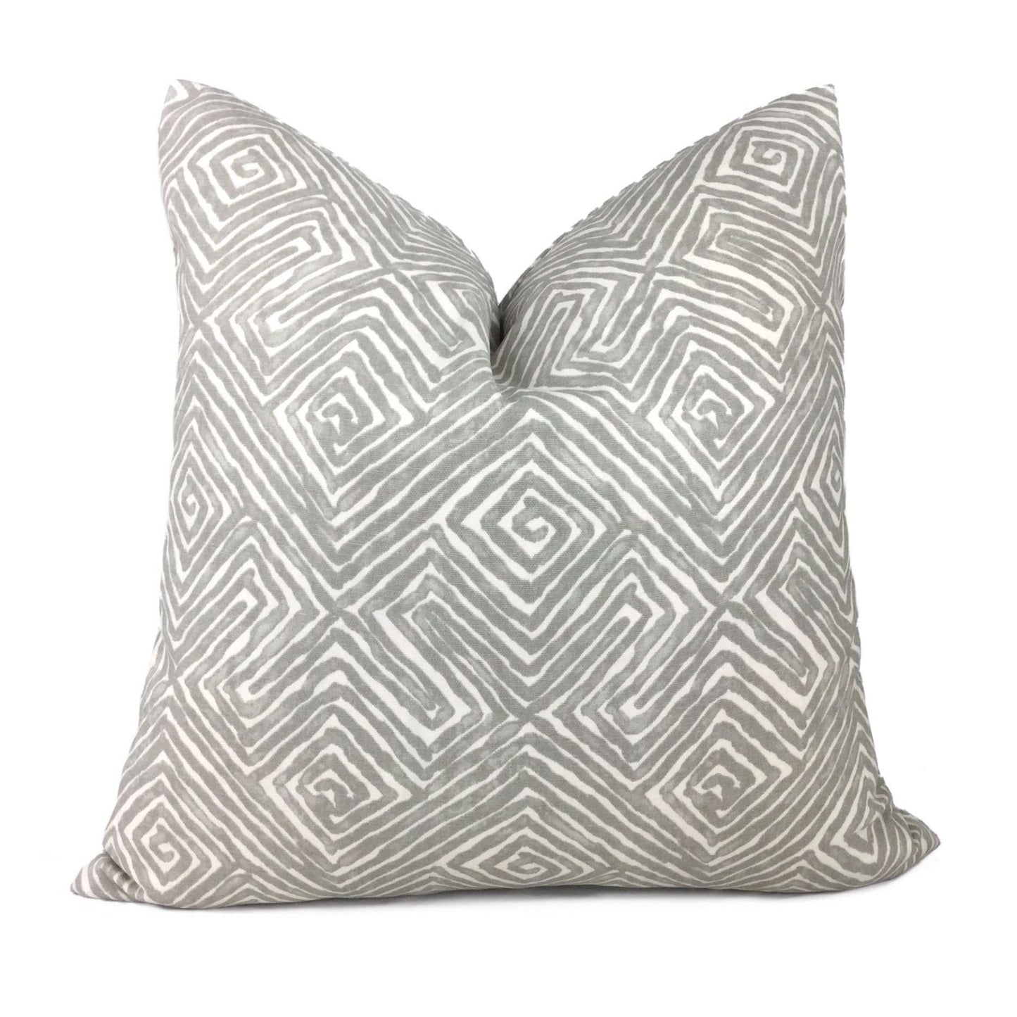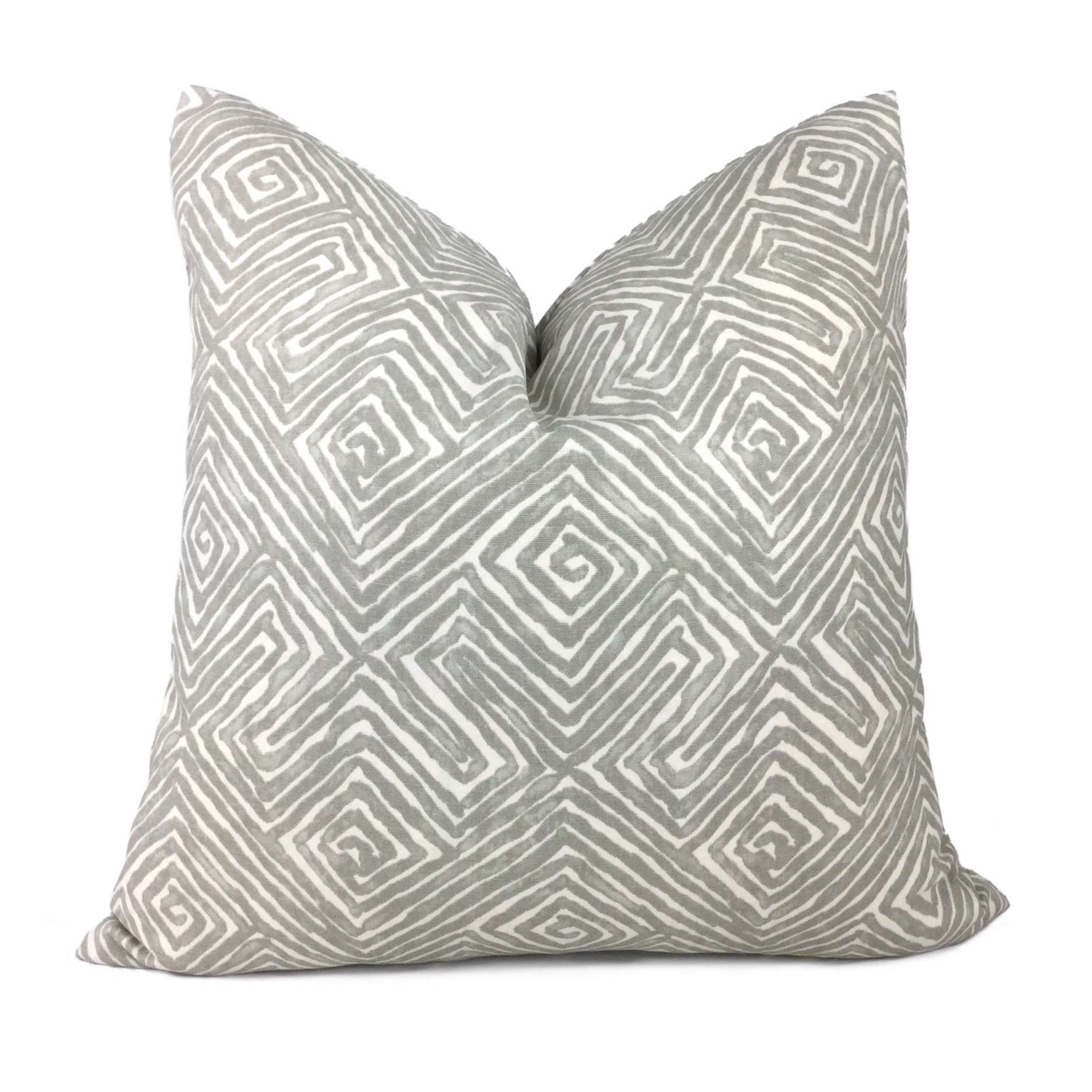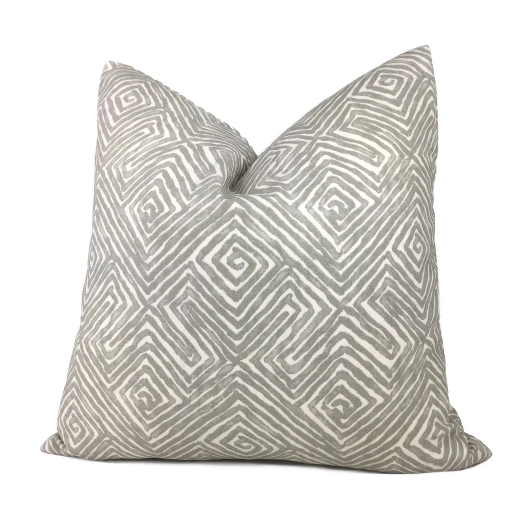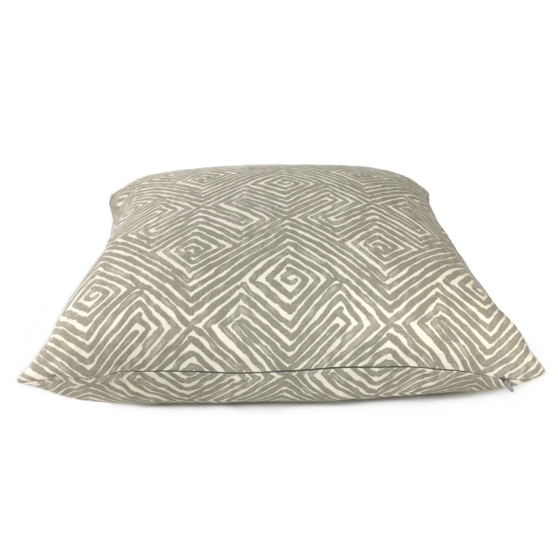 This tribal maze pillow cover is printed in gray on a creamy white background. Nate Berkus designer pattern fabric is used on both sides. Photographed on 19x19 cover (filled with 20x20 insert).