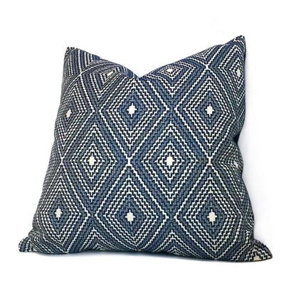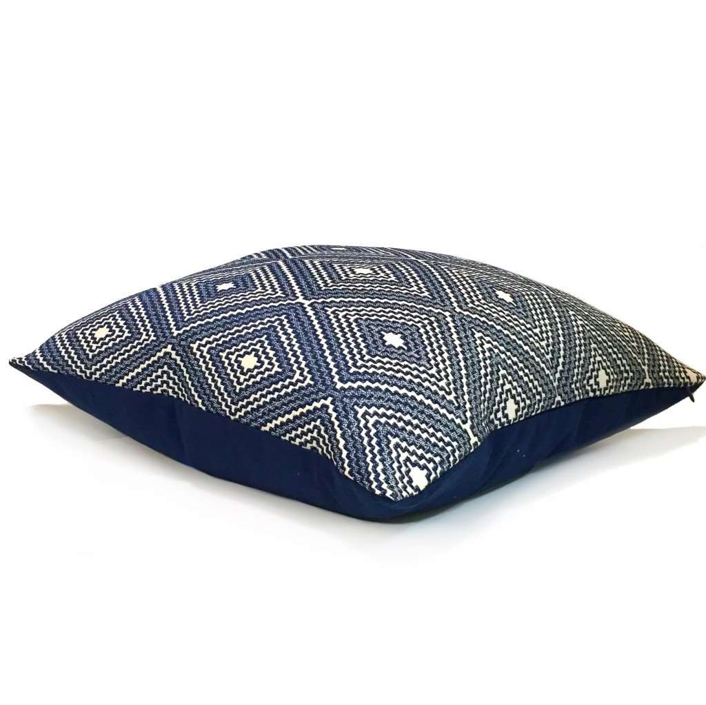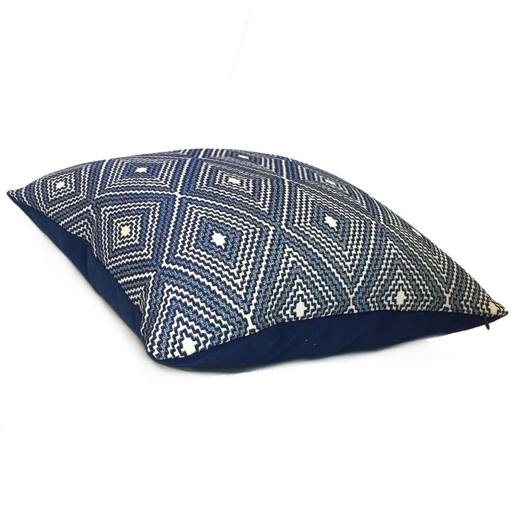 This geometric pillow cover features diamond tile pattern woven in dark blue and off-white (with a gray undertone). Pattern fabric on front side; coordinating solid navy blue fabric backside. Photographed on 17x17 cover (filled with 18x18 insert).