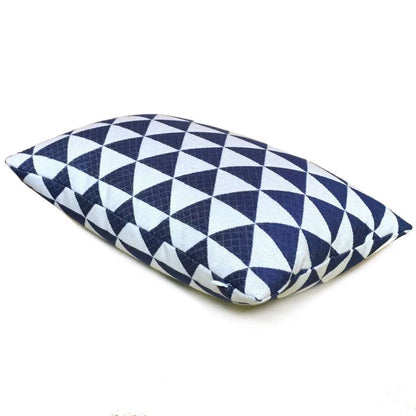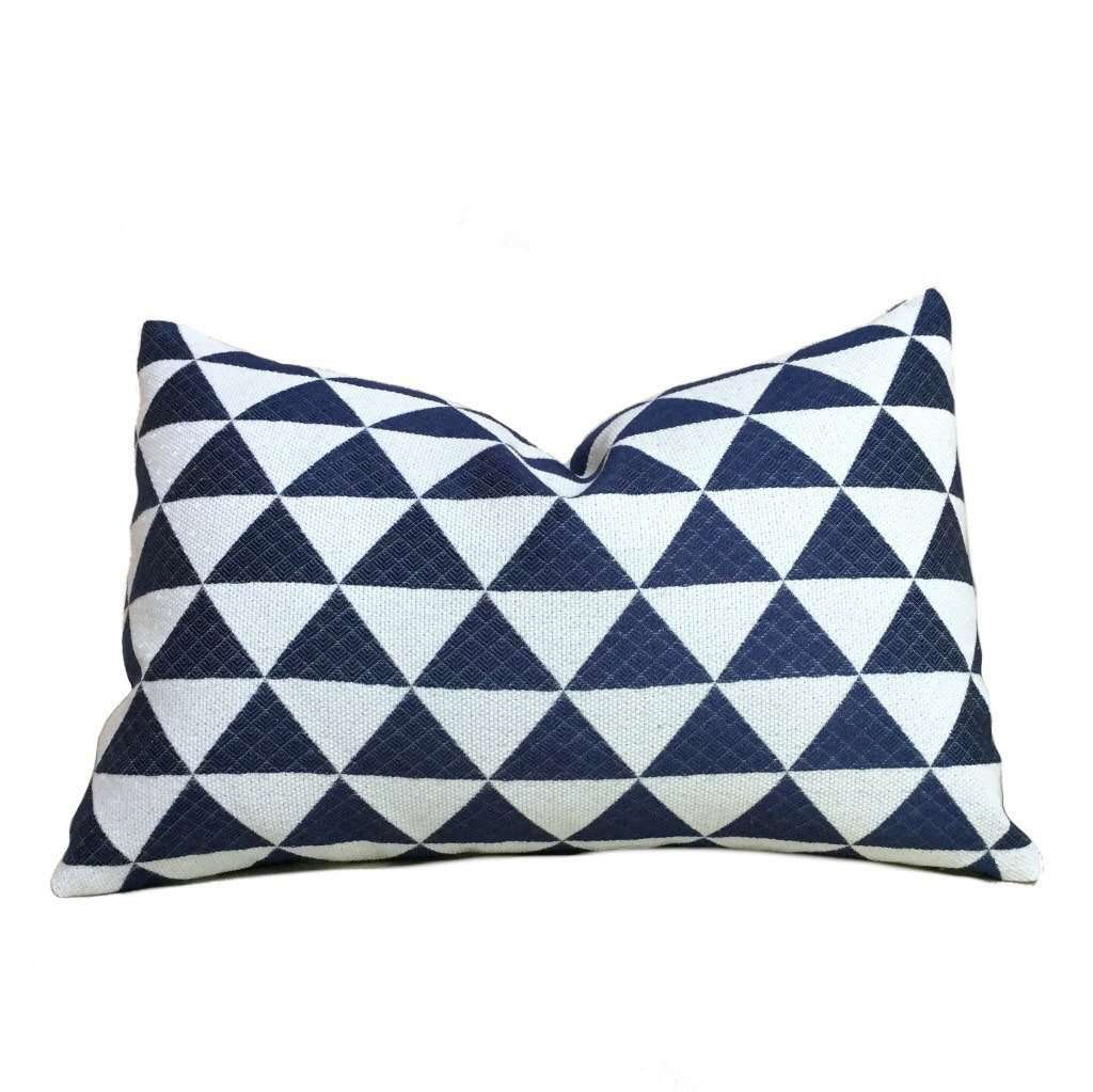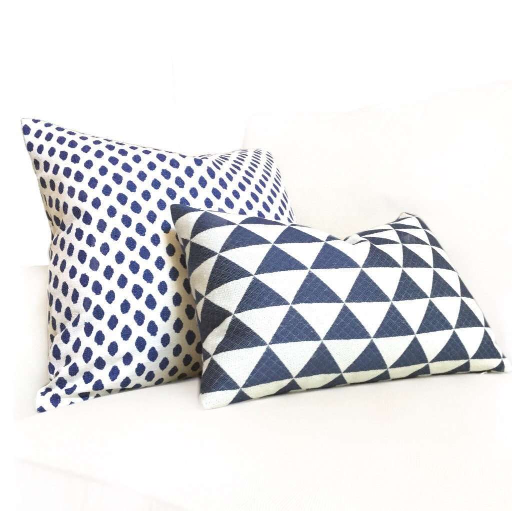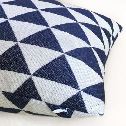 This pillow cover composed of stacked triangles woven in navy blue and off-white looks super sharp, especially when paired with other pillow designs. Have a close up look at photo 3 to see the woven pattern within the blue triangles!
