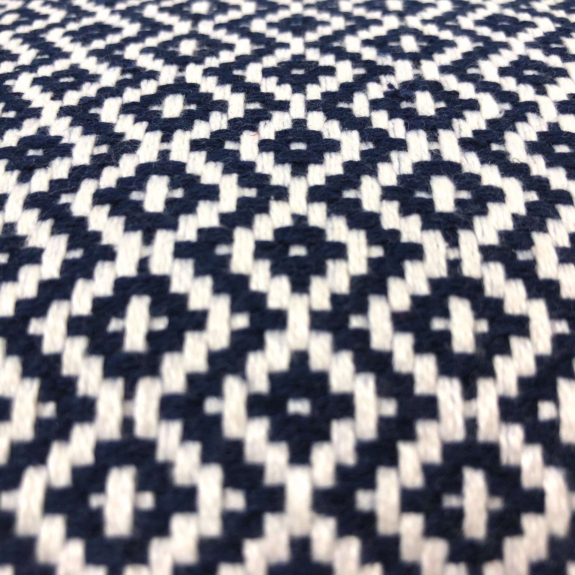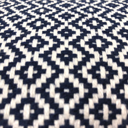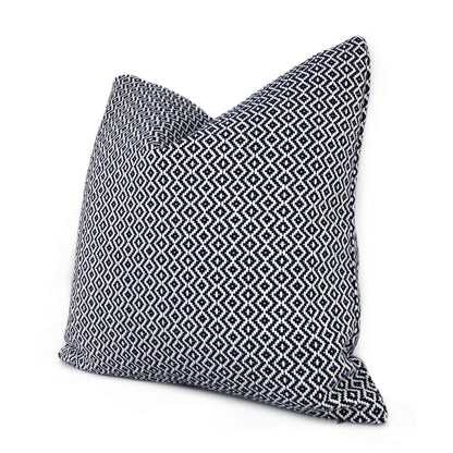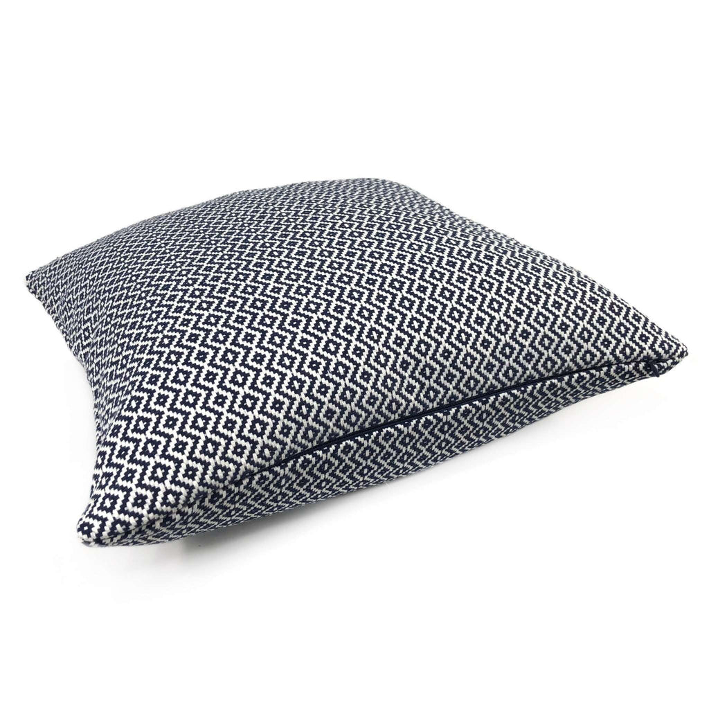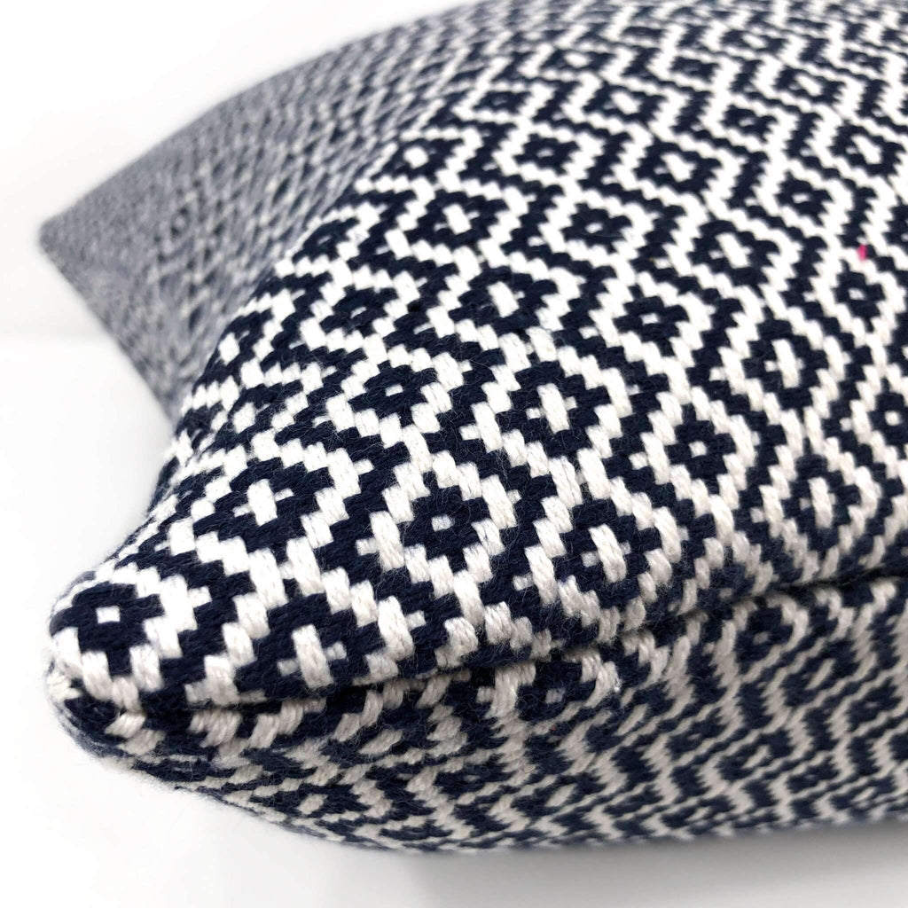 This navy blue and white pillow cover features a small diamond pattern woven in a heavy basketweave style.