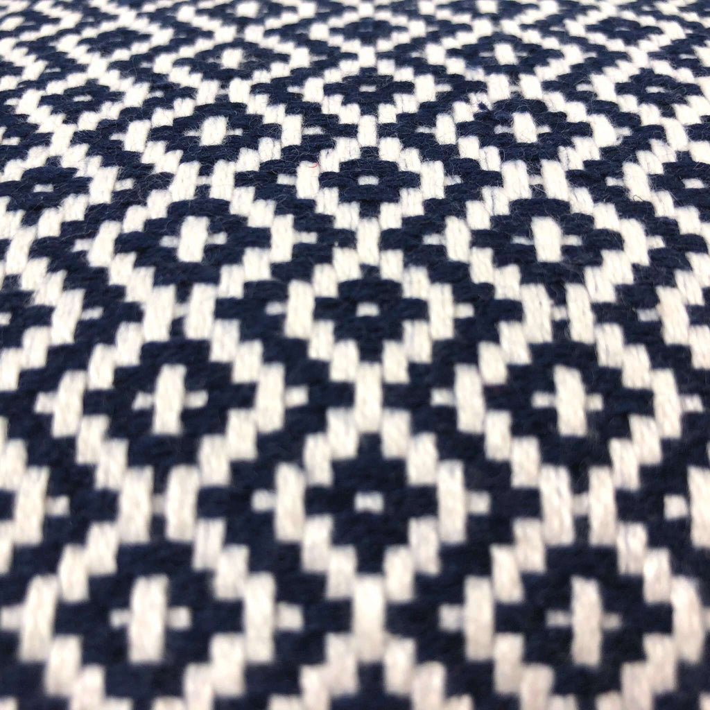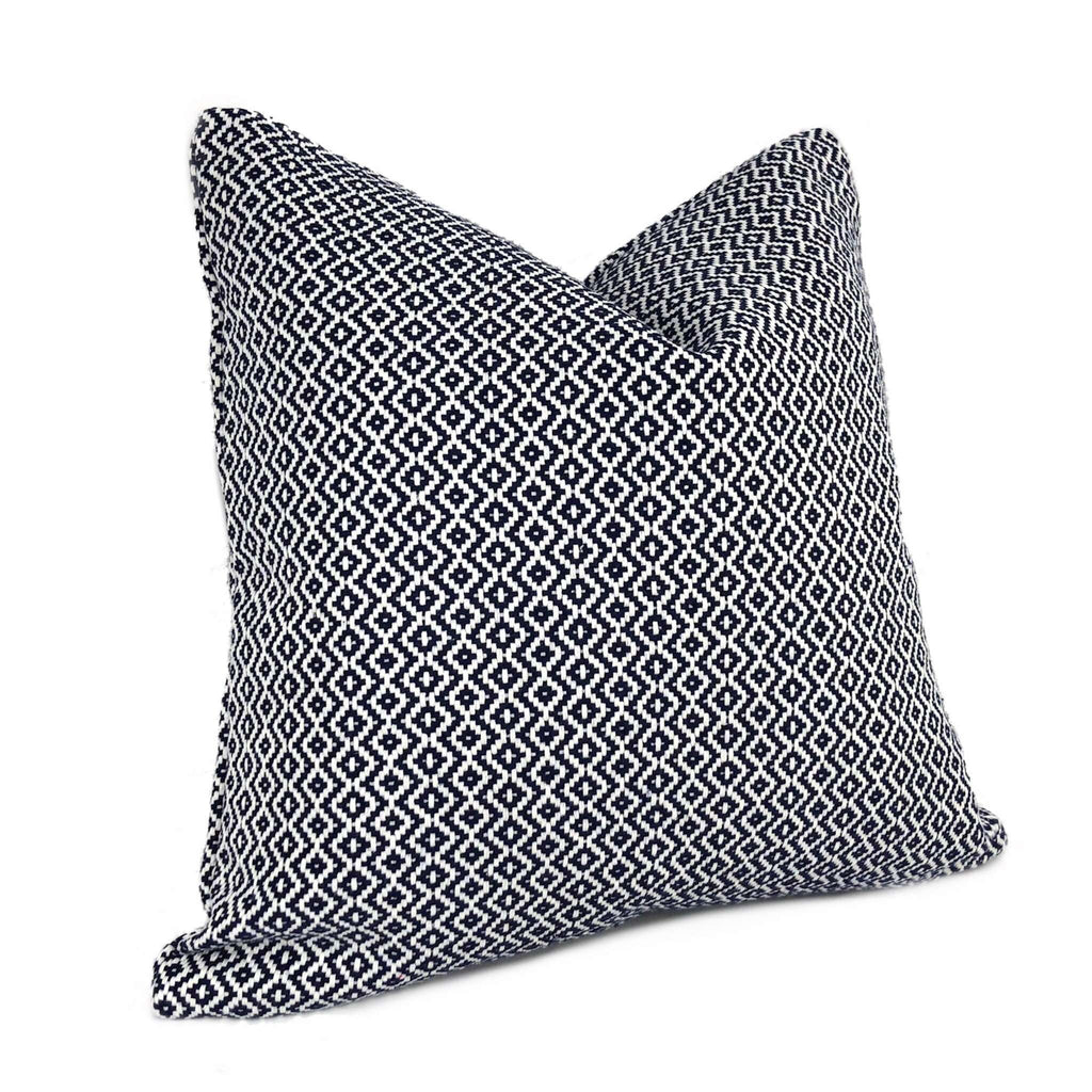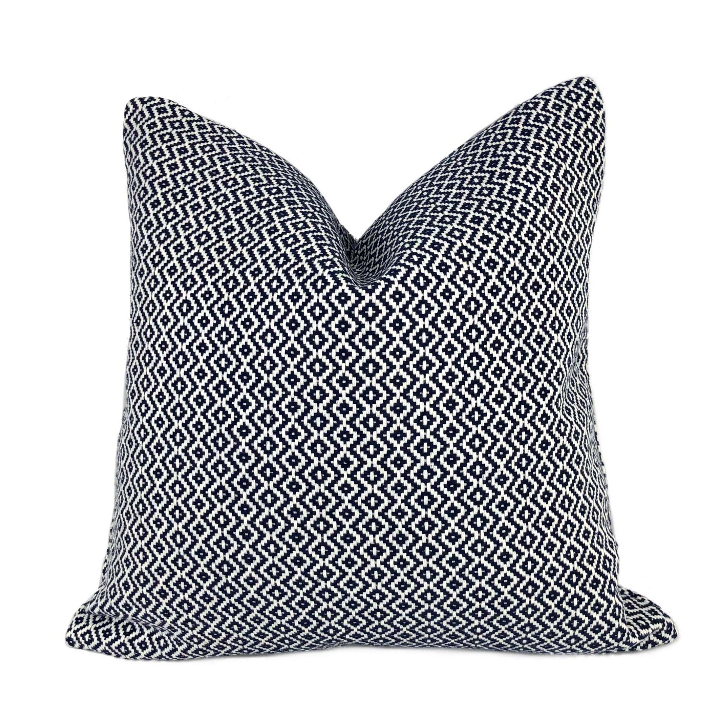 This navy blue and white pillow cover features a small diamond pattern woven in a heavy basketweave style.