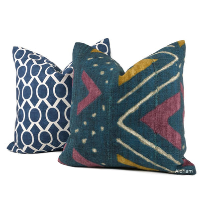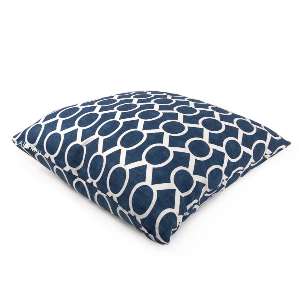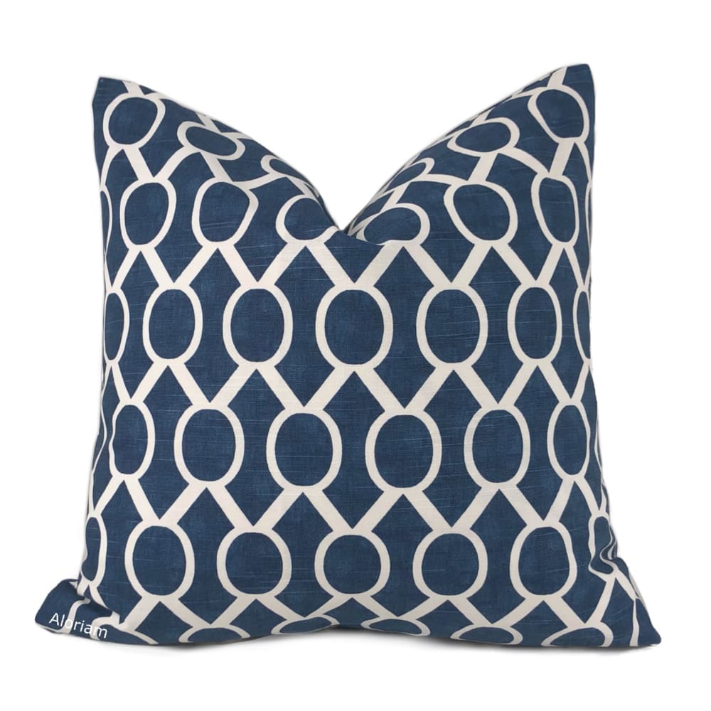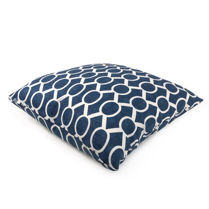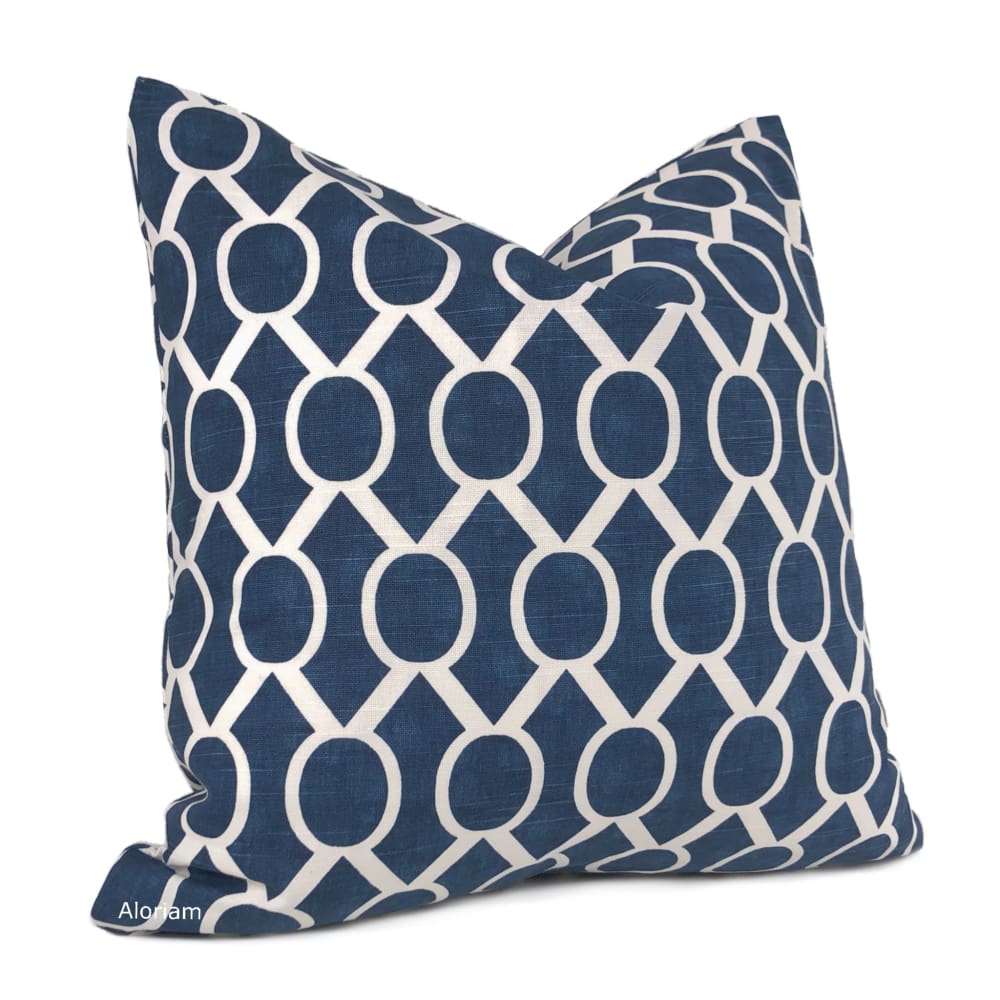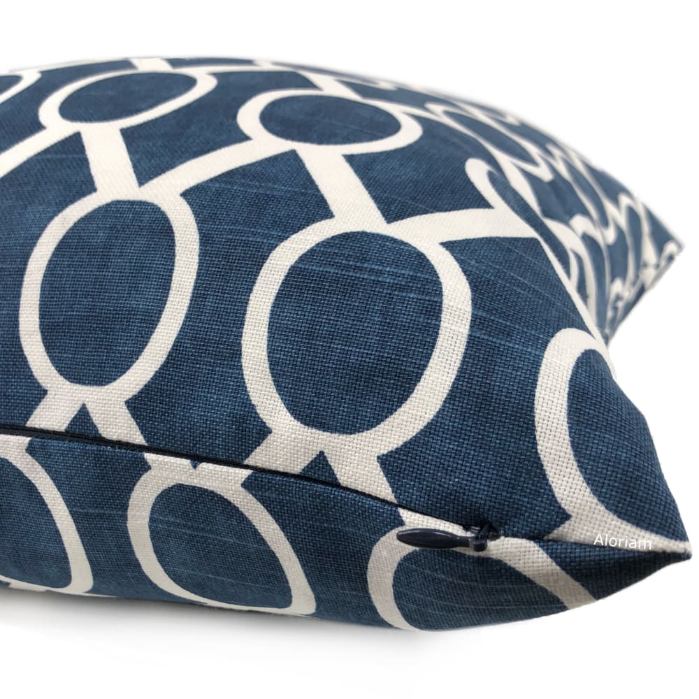 | Sewn in a modern pattern of interlocked circles on diamonds in navy blue and white, this pillow cover will complete your decor with style! Back of cover is a solid white coordinating fabric.