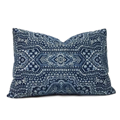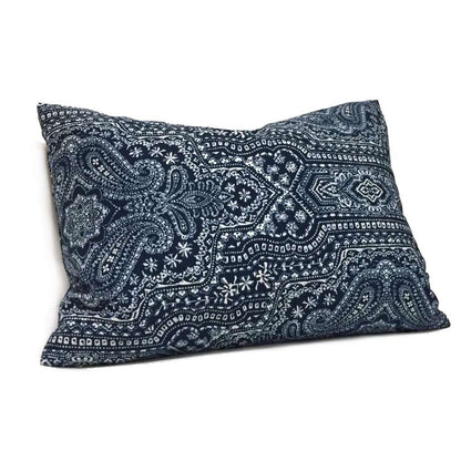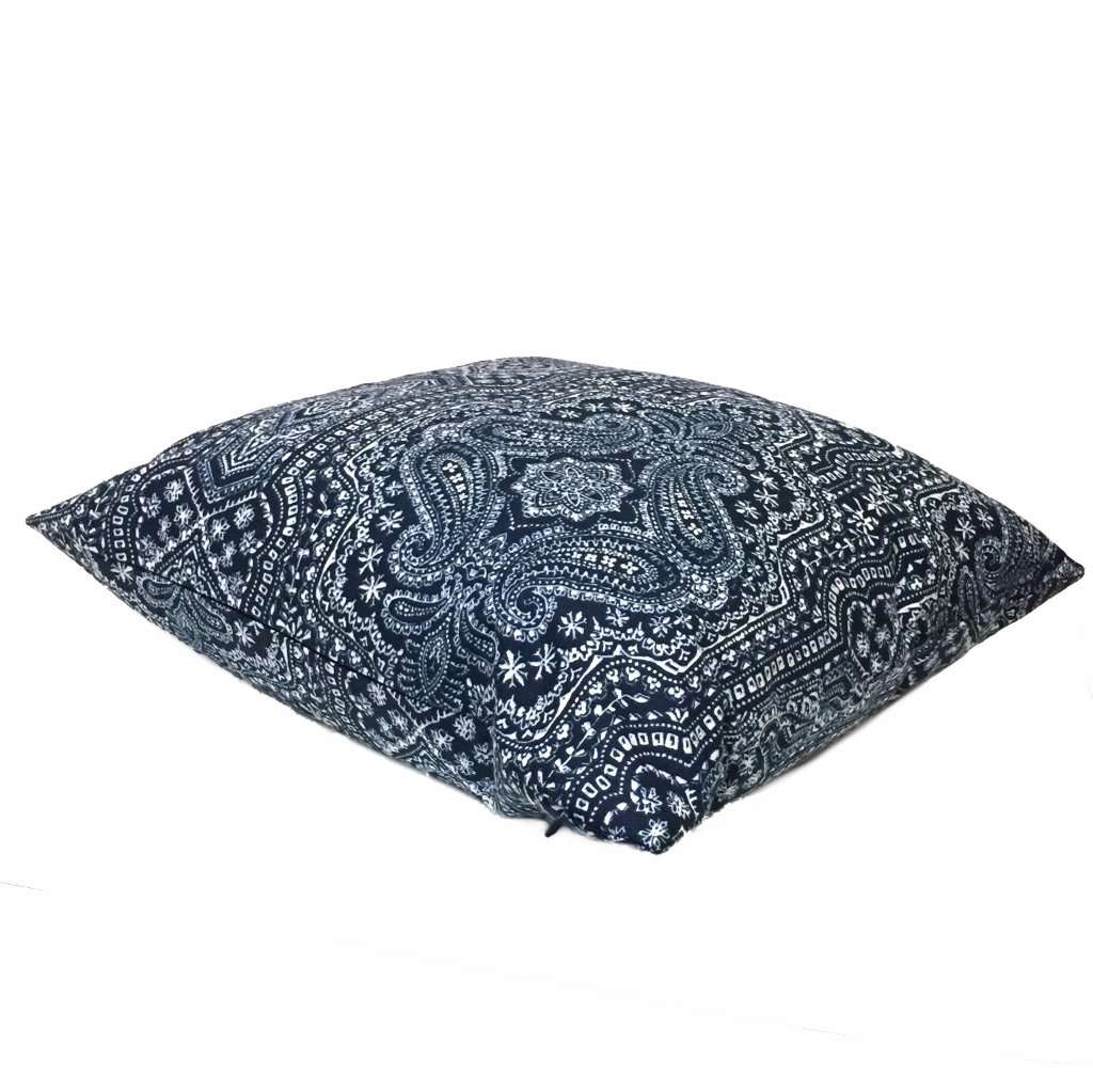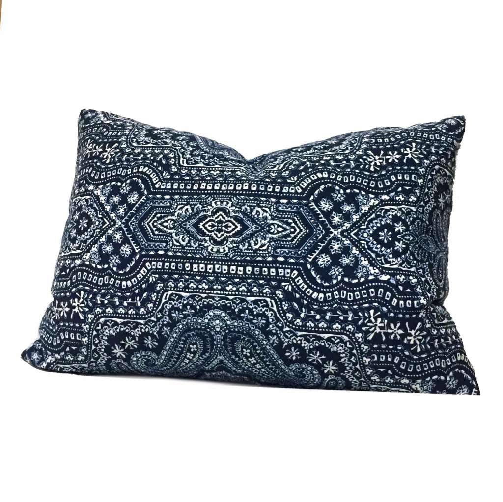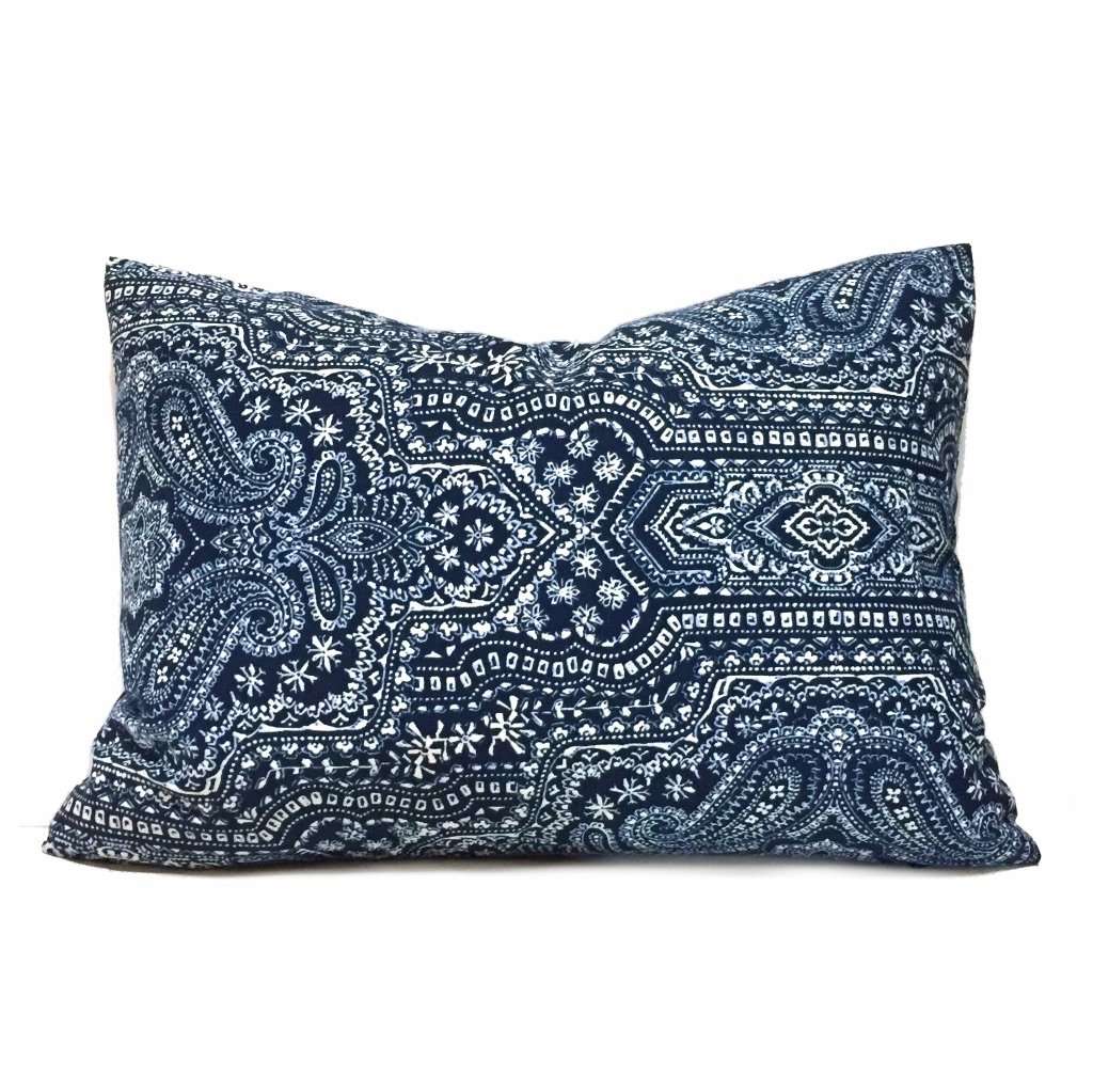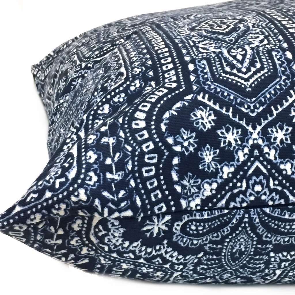 Last one! This navy blue and white pillow cover featuring an intricate paisley design is a beautiful addition to your home! Screen printed on home decor drapery weight cotton with a soil and stain resistant finish. Pattern fabric is used on both sides. Pictured on 20x20 and 14x20 inserts.