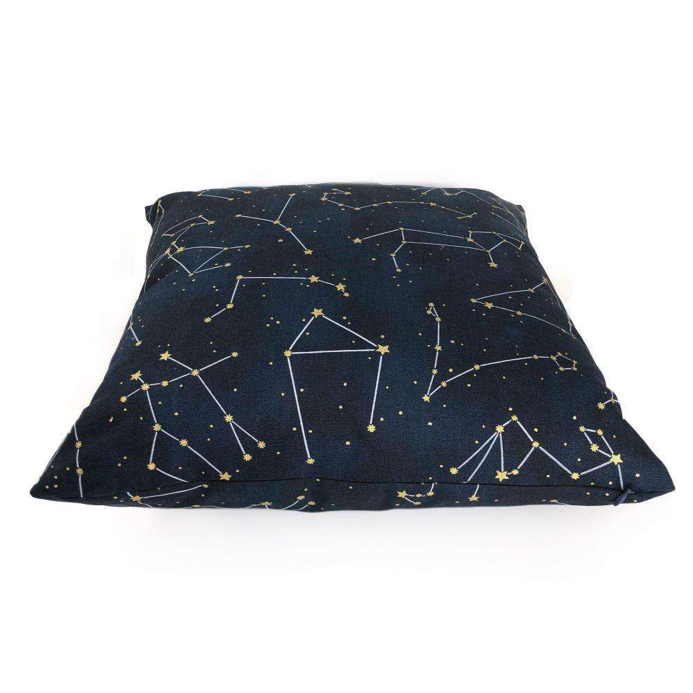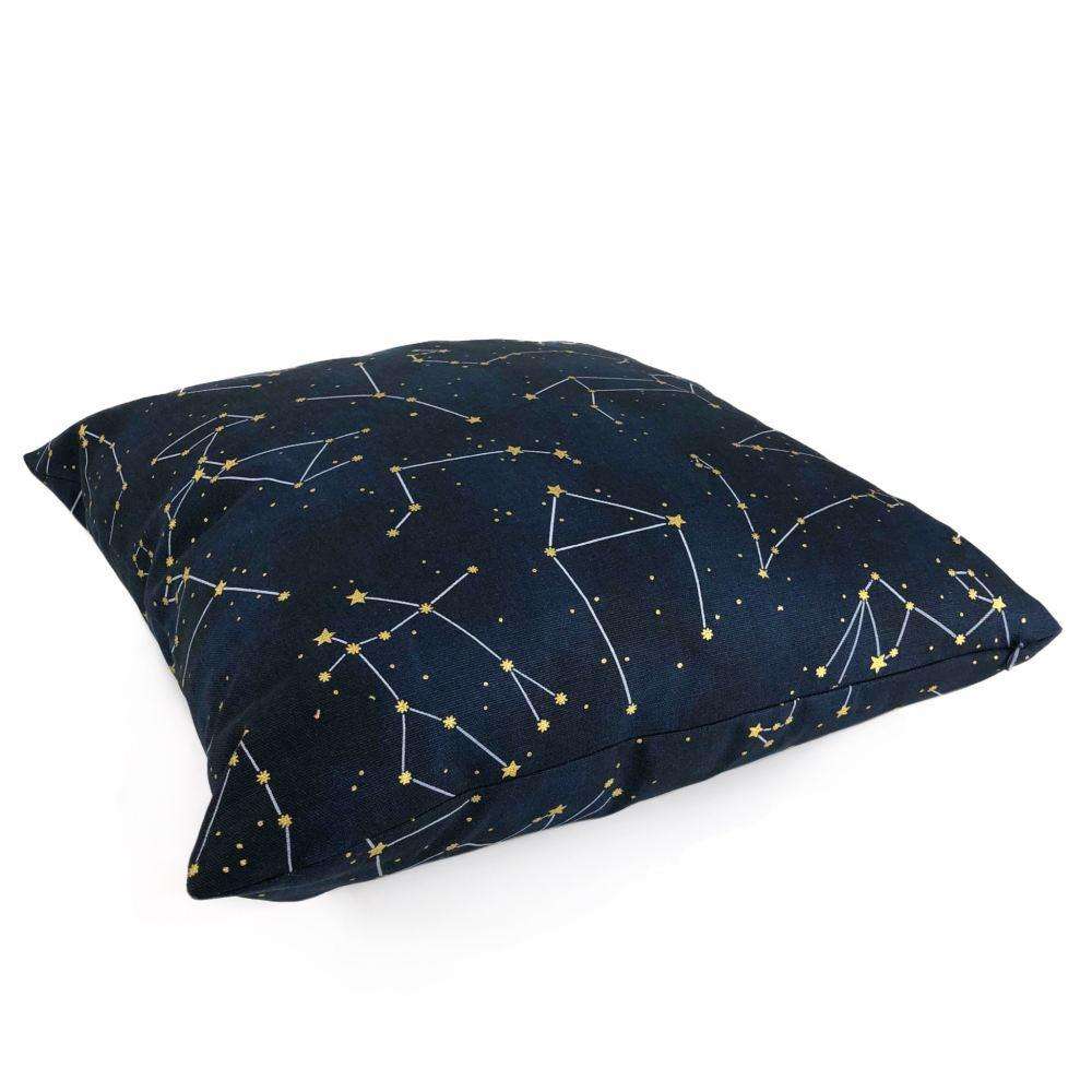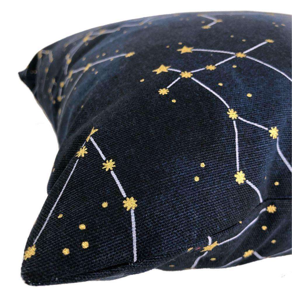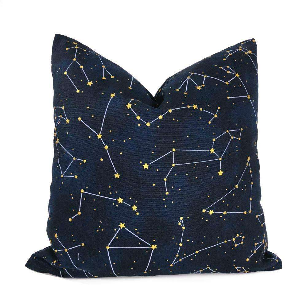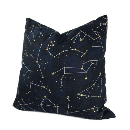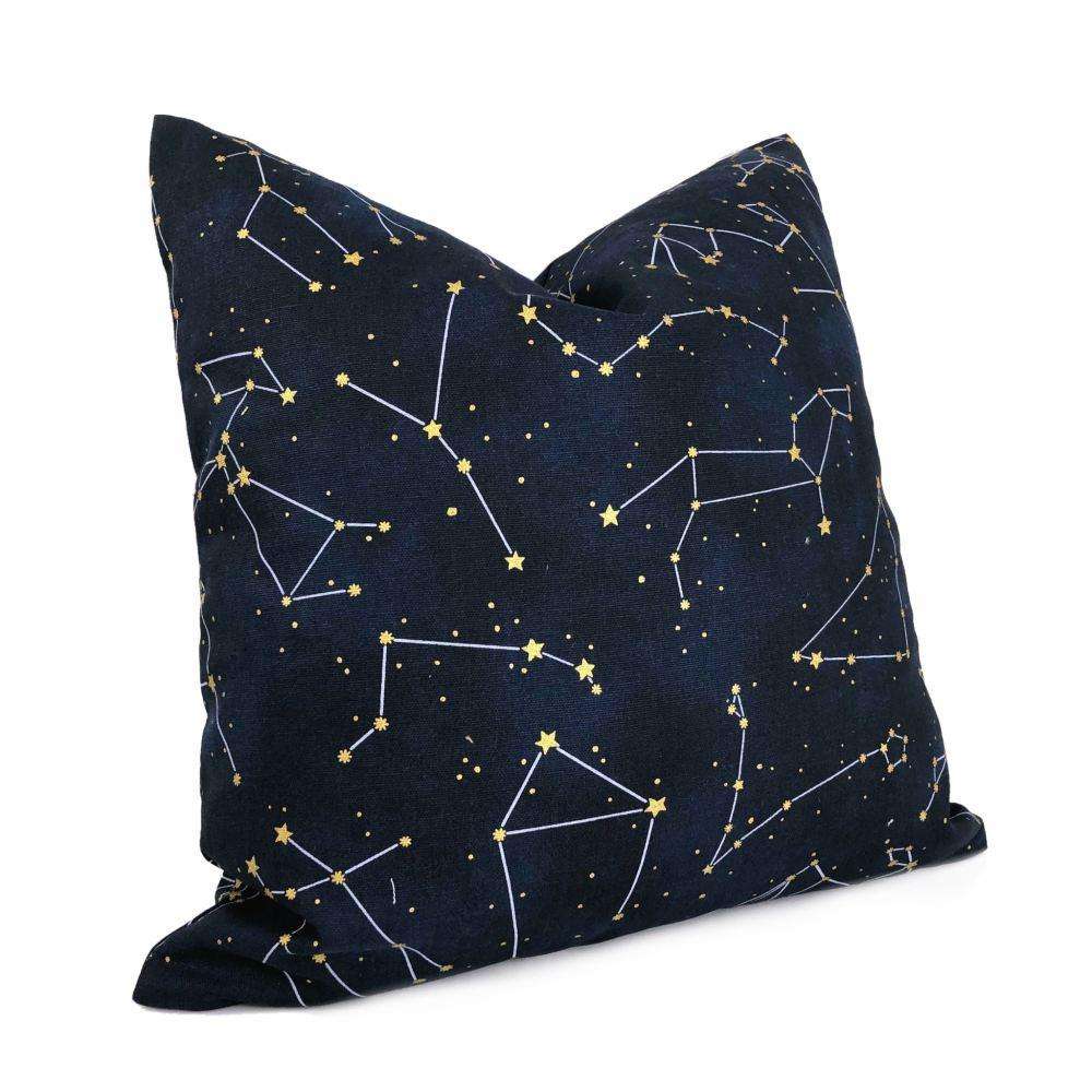 This cotton pillow cover features a night sky constellation print with gold metallic stars on deep navy blue background.