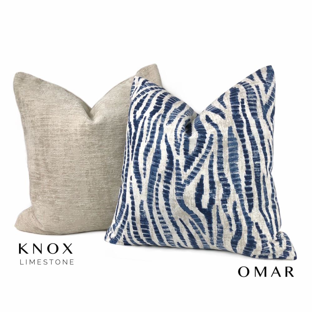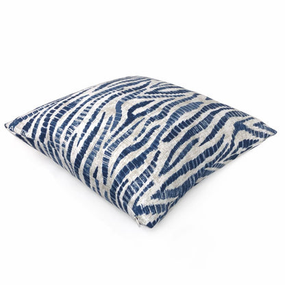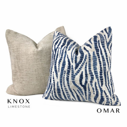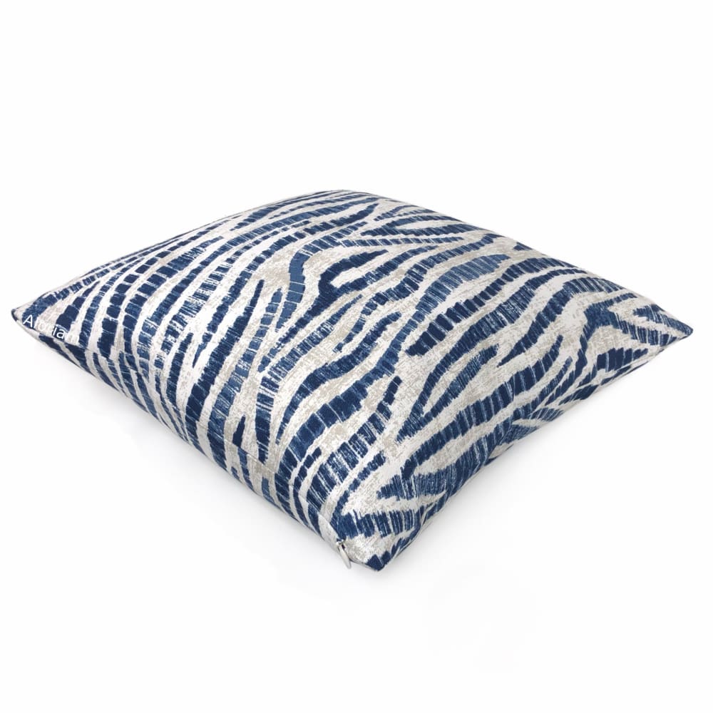 Omar is a cotton print pillow cover featuring a stylized animal stripe design in blue and ecru.