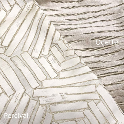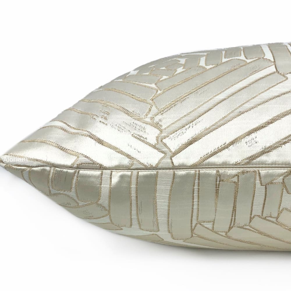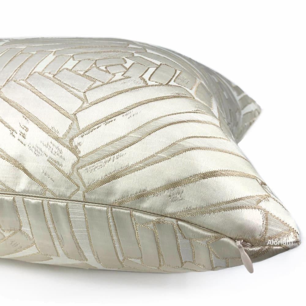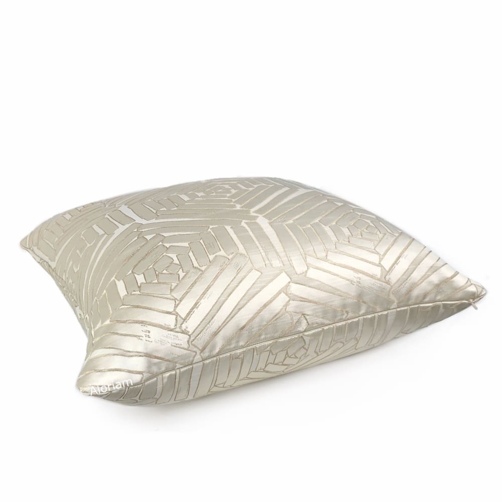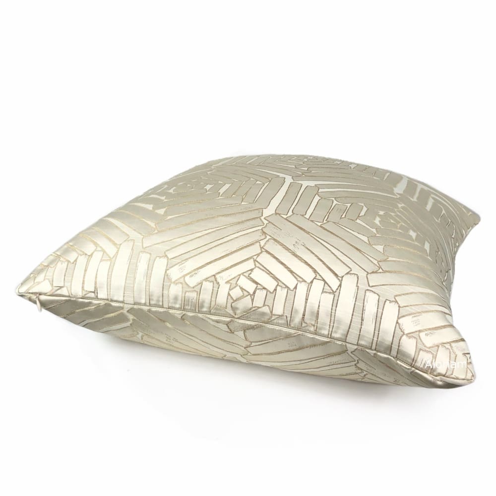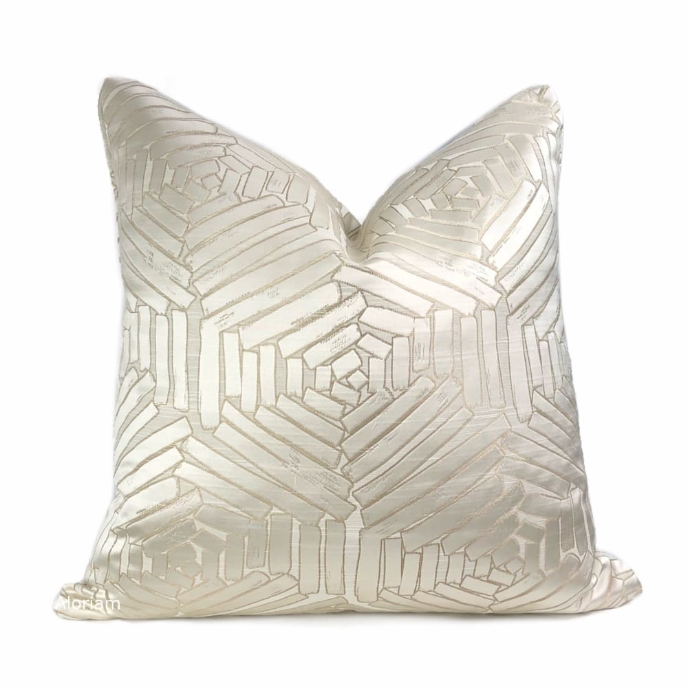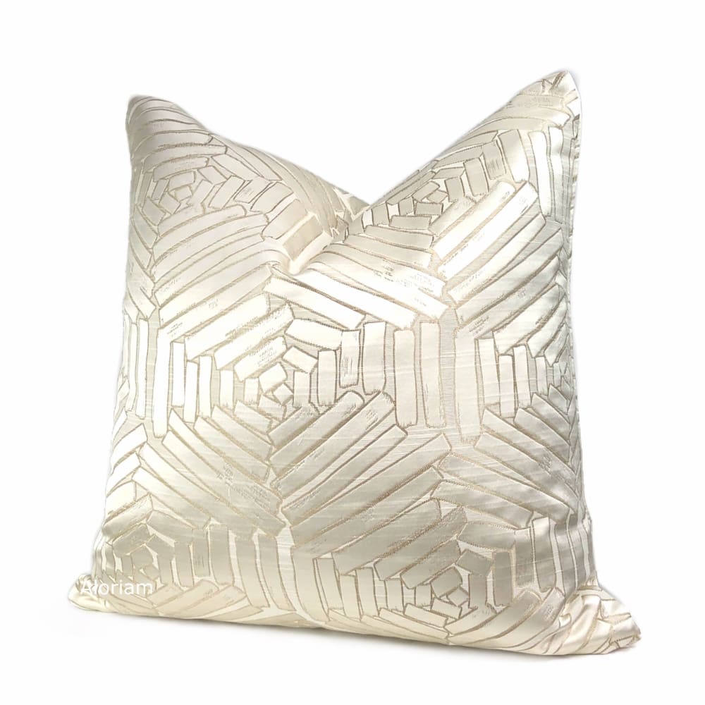 Percival is a sophisticated pillow cover woven in cream with pale gold accents. The freeform hexagon design is perfect for any contemporary interior.