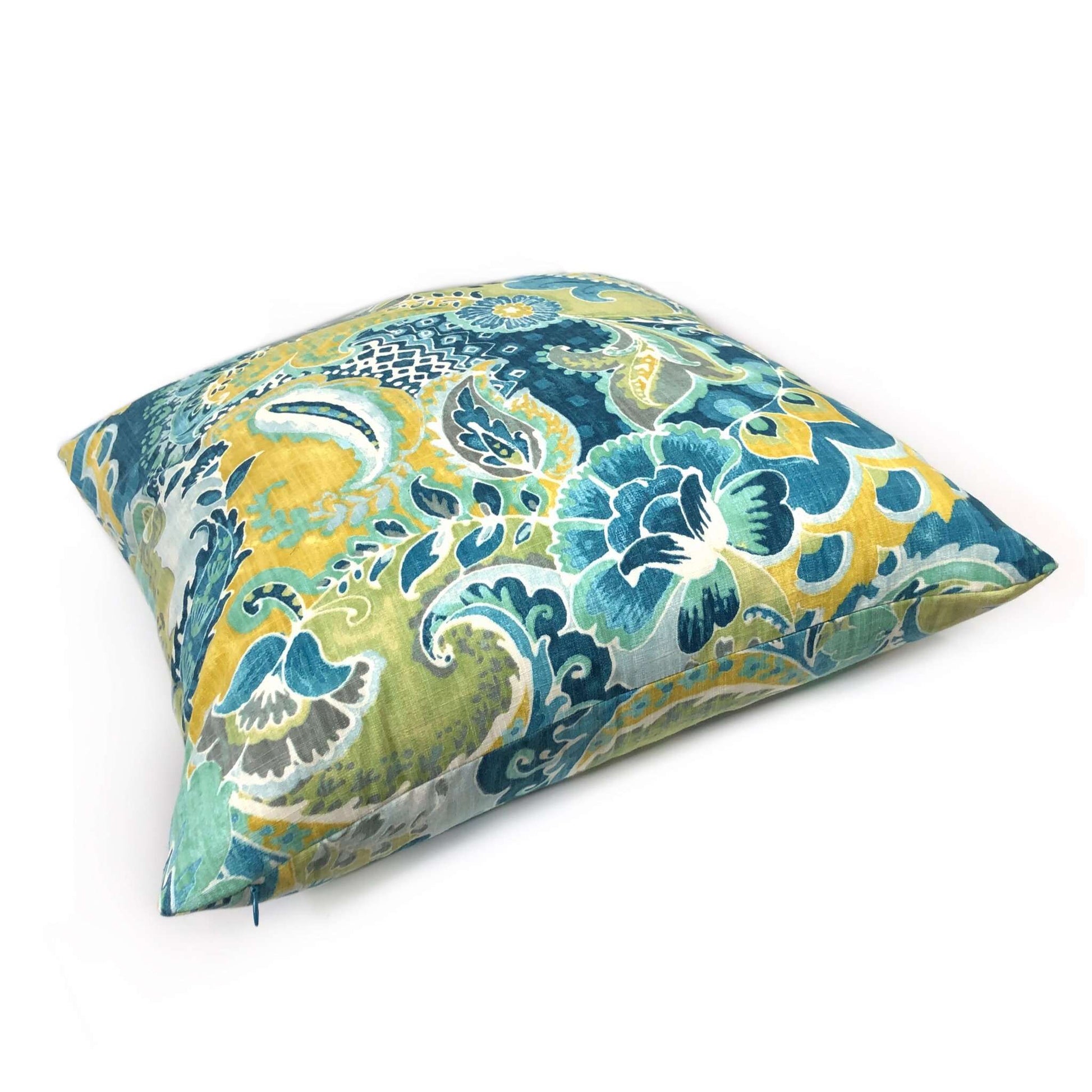 This cotton pilllow cover features a colorful floral extravaganza printed in teal, lime, aqua green with yellow and white accents. Pattern fabric is used on both sides. Photographed on 22x22 cover (filled with 24x24 insert).