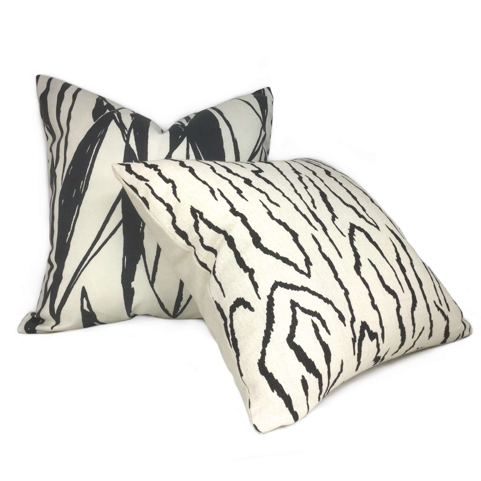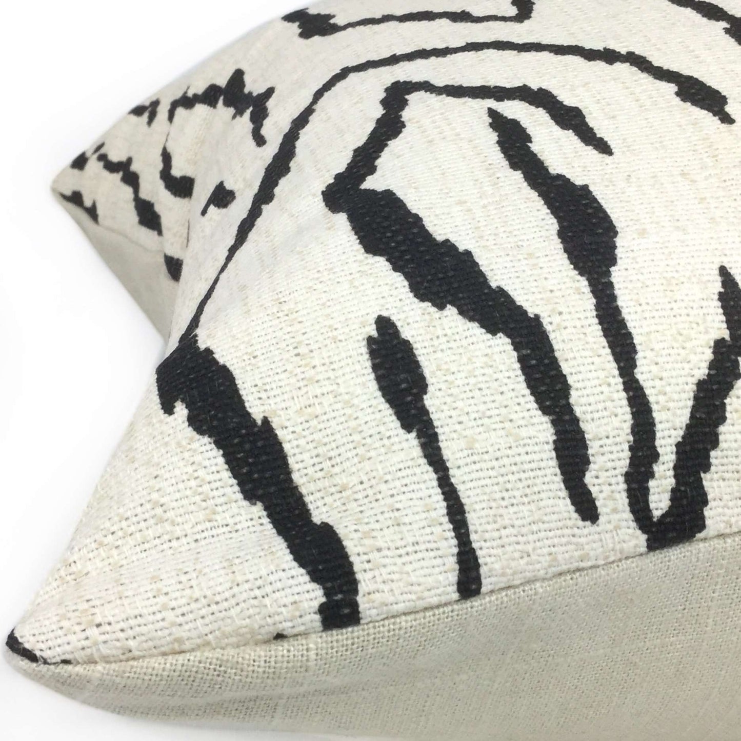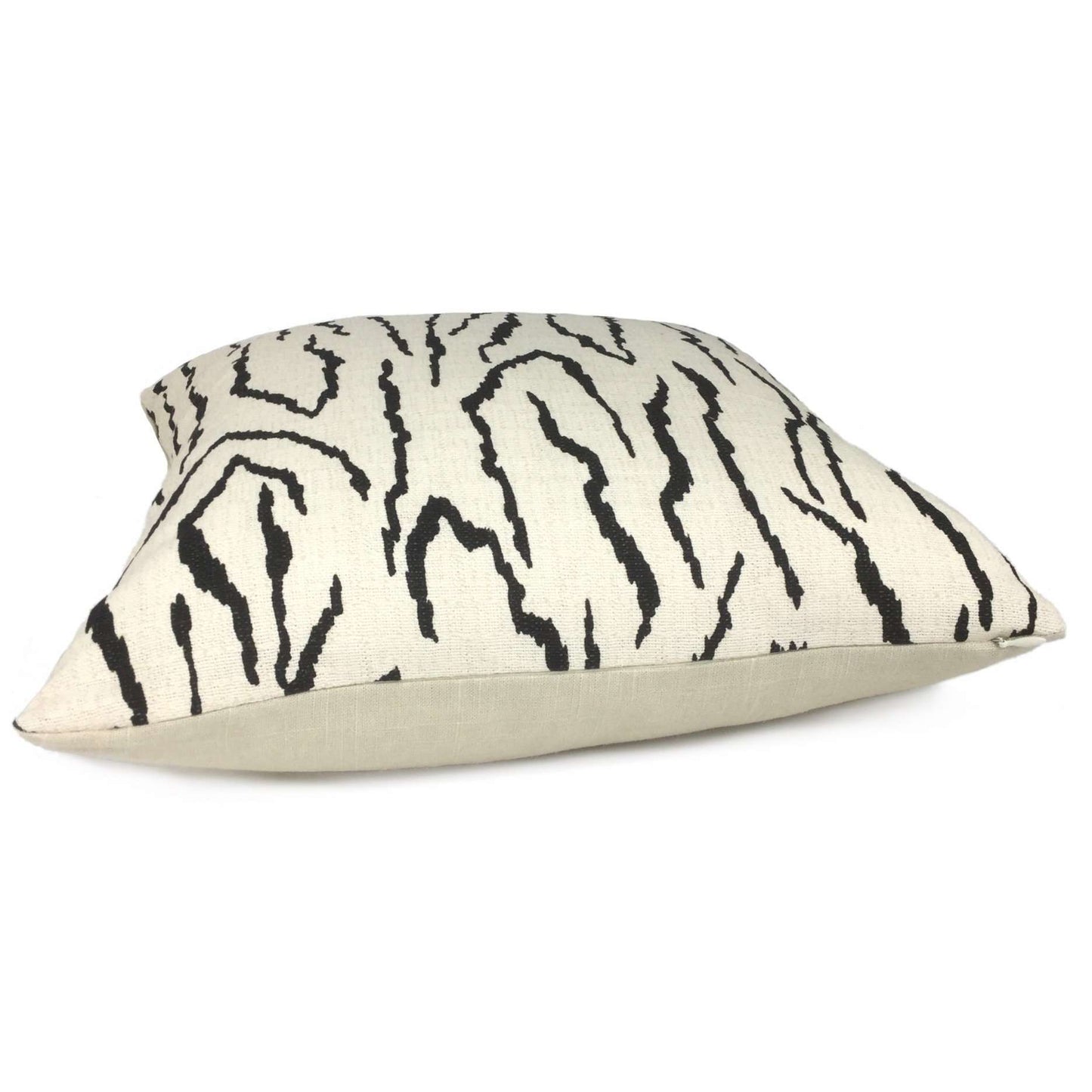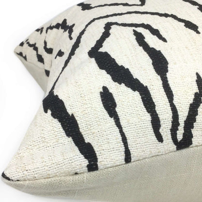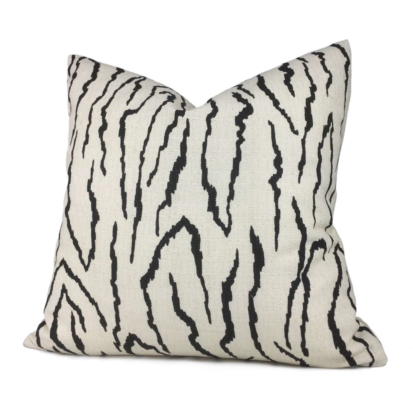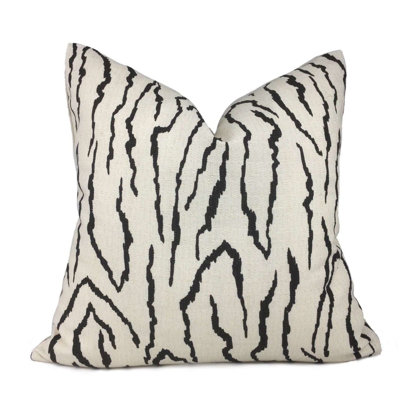 Our Pingvellir pillow cover is an abstract graphic pattern that will bring boldness to any space. The jagged linear design reminiscent of mountainous forms and shifting tectonic plates is printed in black on a cream medium-weight slubbed cotton background. Choose from the designer fabric used on both sides or front side with a coordinating solid cream backside. Photographed on 17x17 cover (filled with 18x18 insert).
