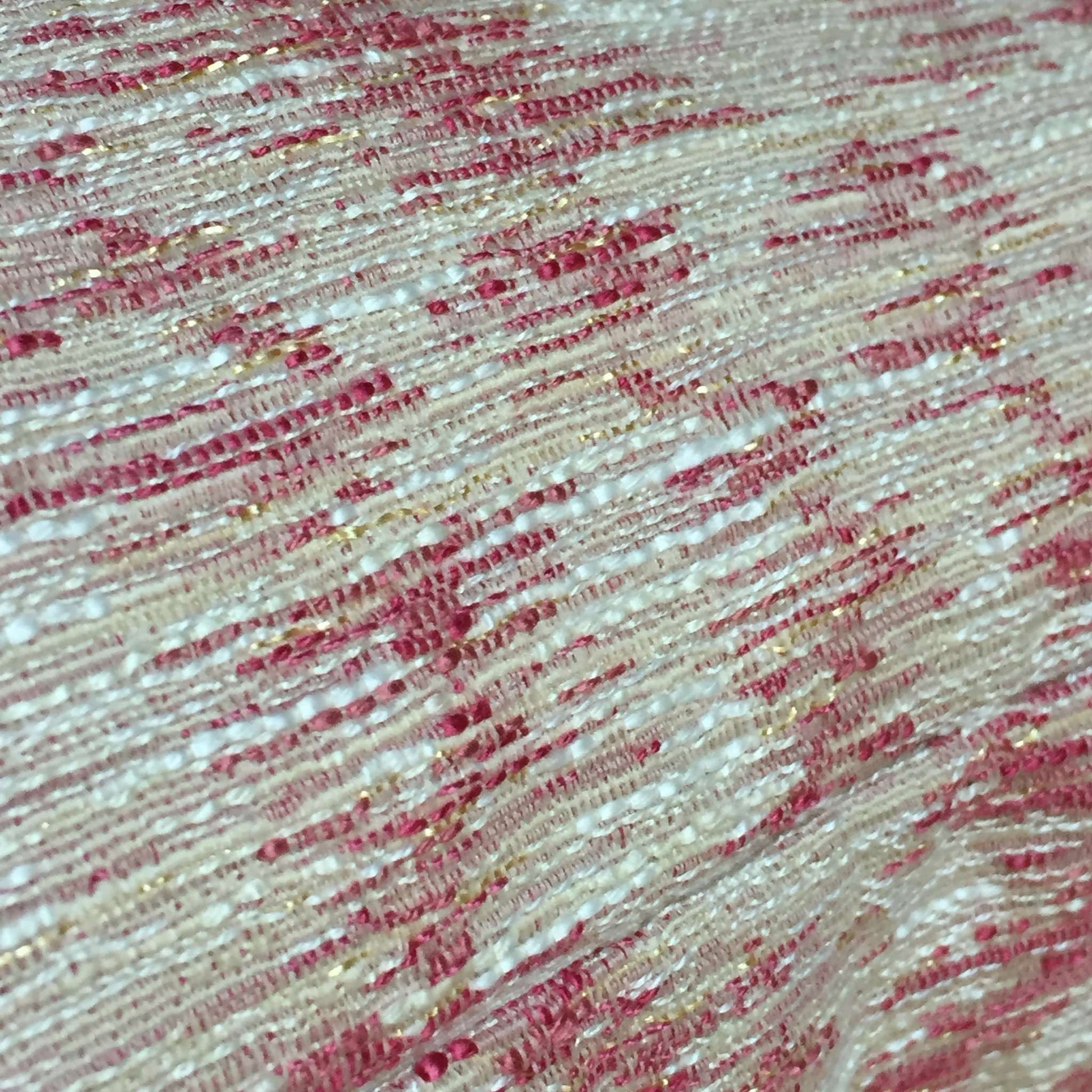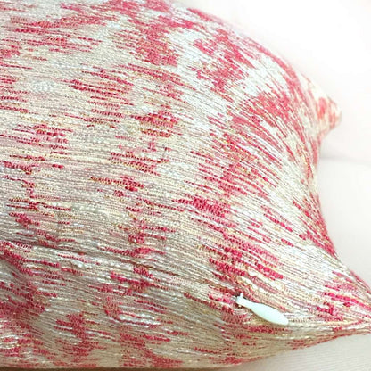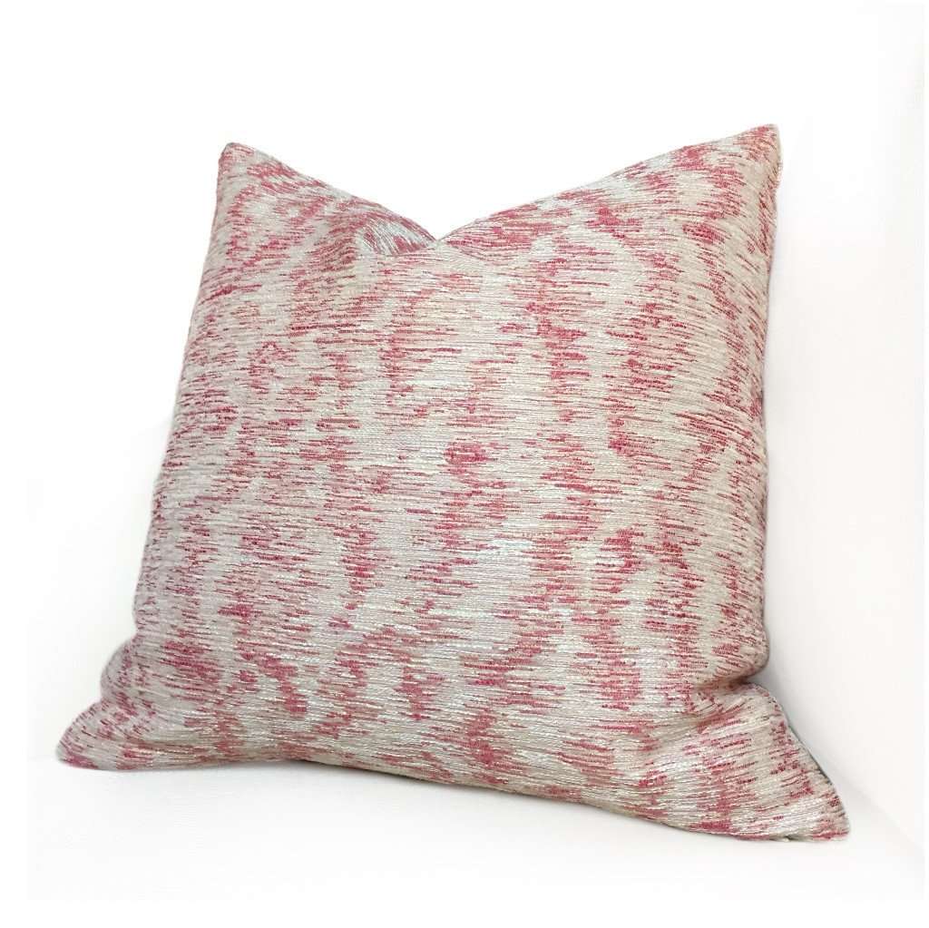Sewn in a designer abstract textured fabric, this pillow cover features colors of pink and ivory, with a glimmer of gold threaded throughout. The photos do not do this pattern justice! Only 3 covers available (2 made to fit 18x18 inserts and 1 made to fit 20x20 insert).