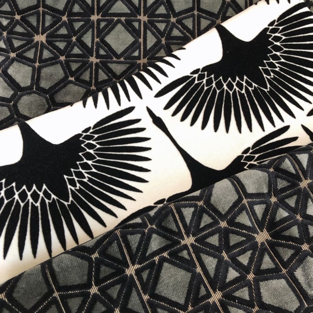 Luxury designer pattern fabric woven in Belgium by Pollack front side (over $200 a yard!) with solid black backside. Photographed on 20x20 and 12x20 inserts.