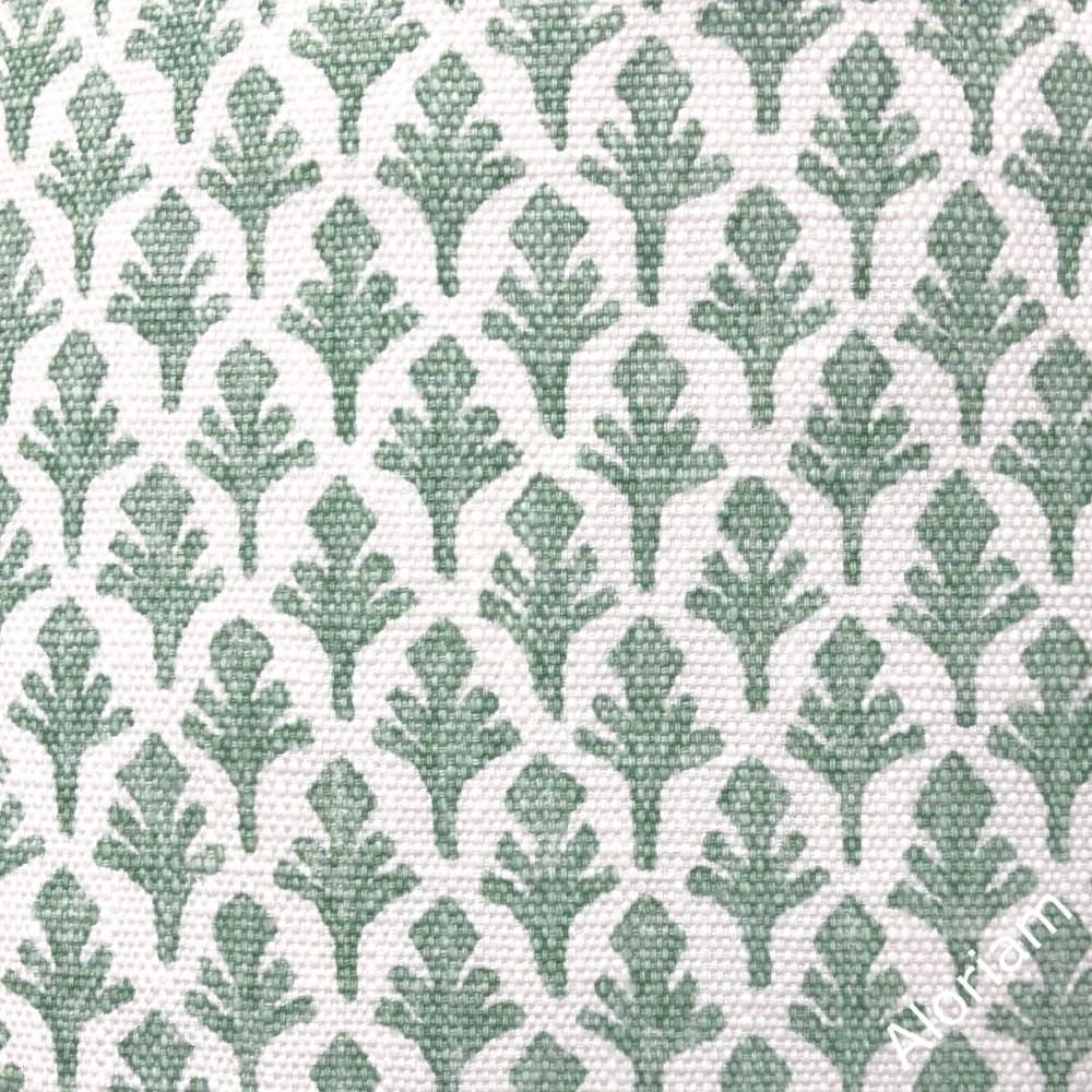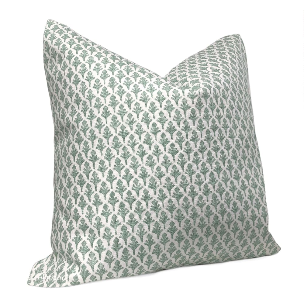 The Ponce pillow cover features a stylish leaf print in eucalyptus green on a white background. Each leaf is approximately 1 inch in height.
