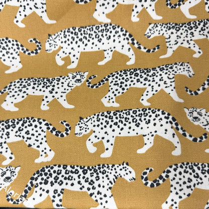 These prowling leopards will bring style to any space! Leopards are printed in black and white on a golden camel colored background.