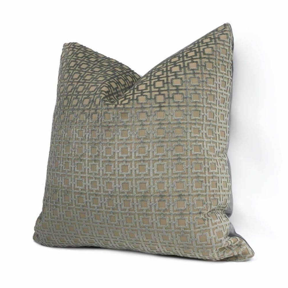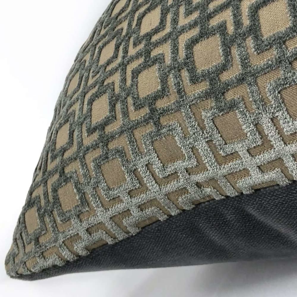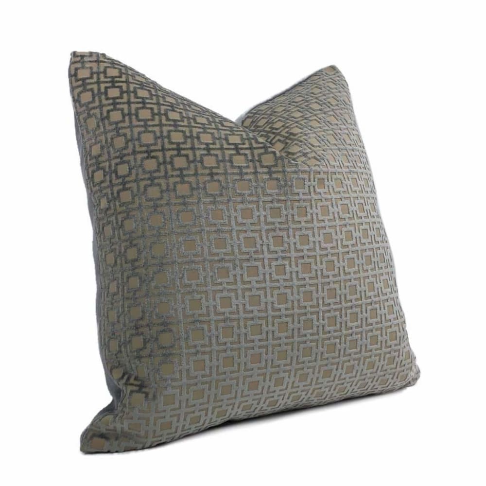 This pillow cover features a geometric grid pattern woven in lustrous storm gray velvet on a tan background. Each square measures approximately 1 inch.