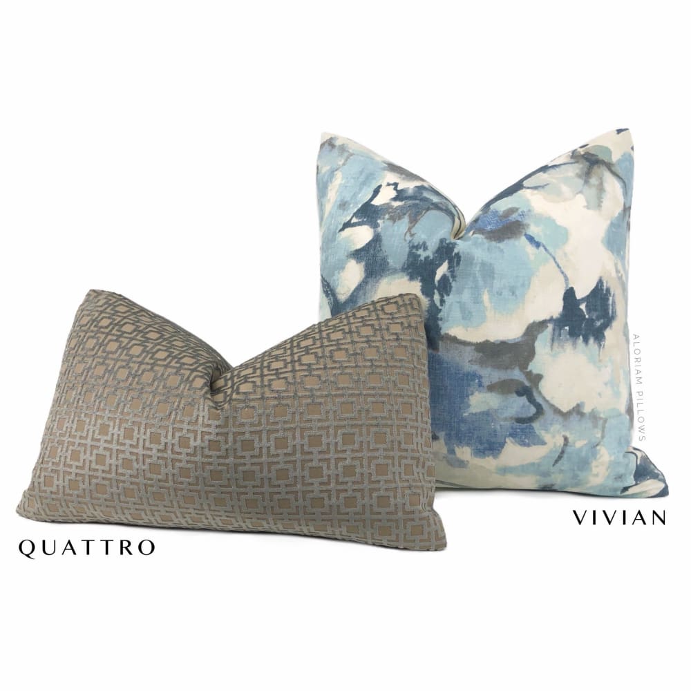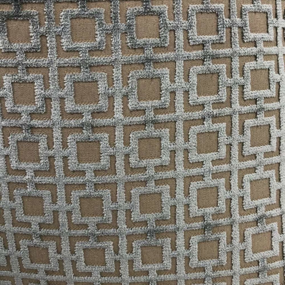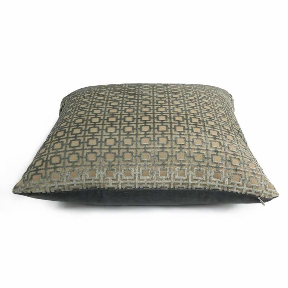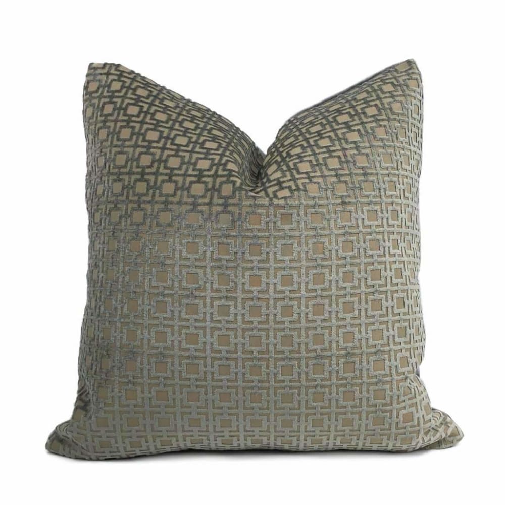 This pillow cover features a geometric grid pattern woven in lustrous storm gray velvet on a tan background. Each square measures approximately 1 inch.