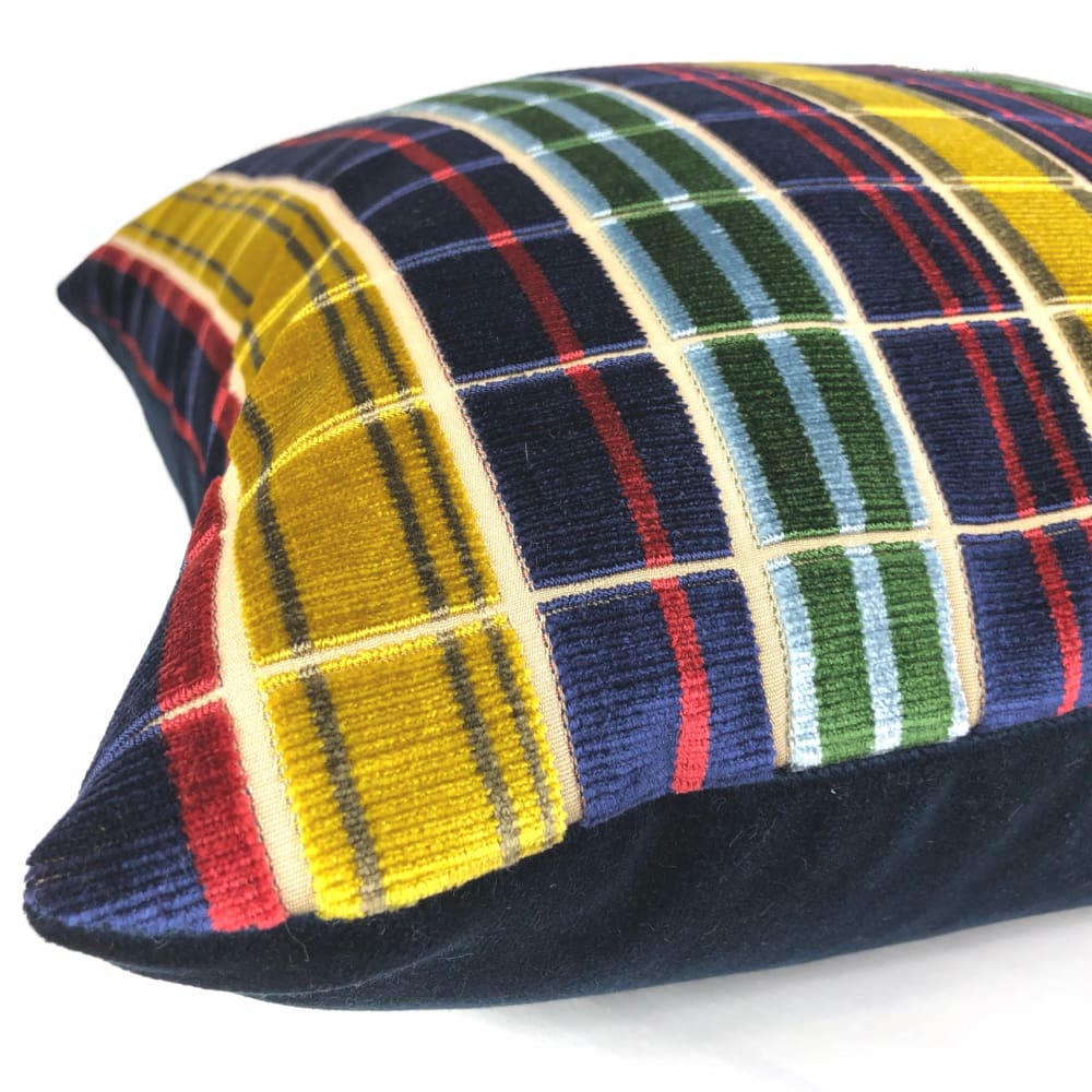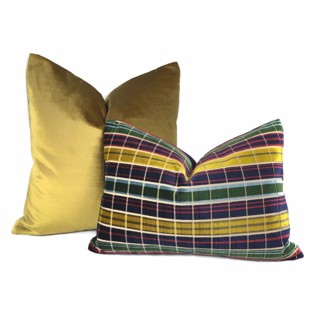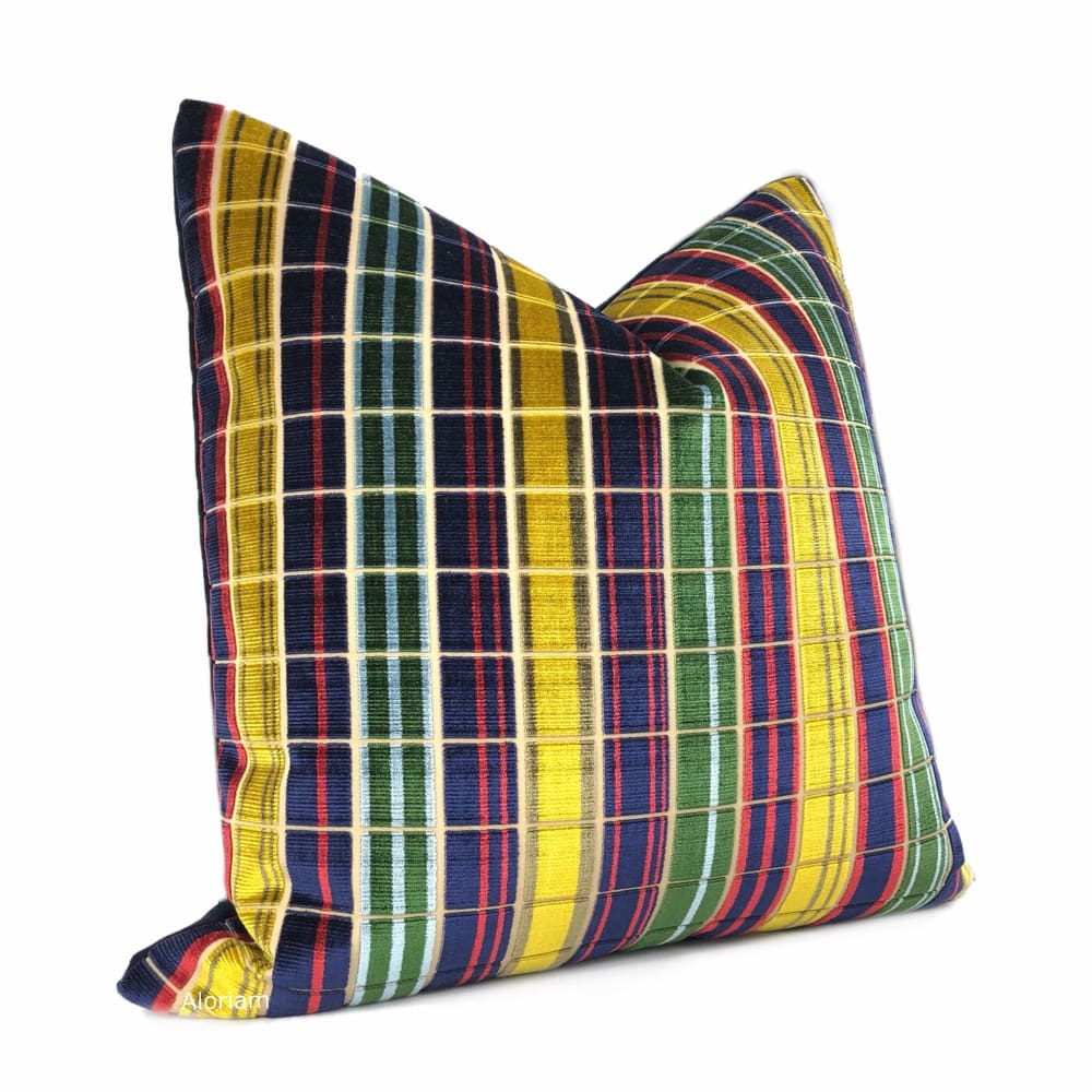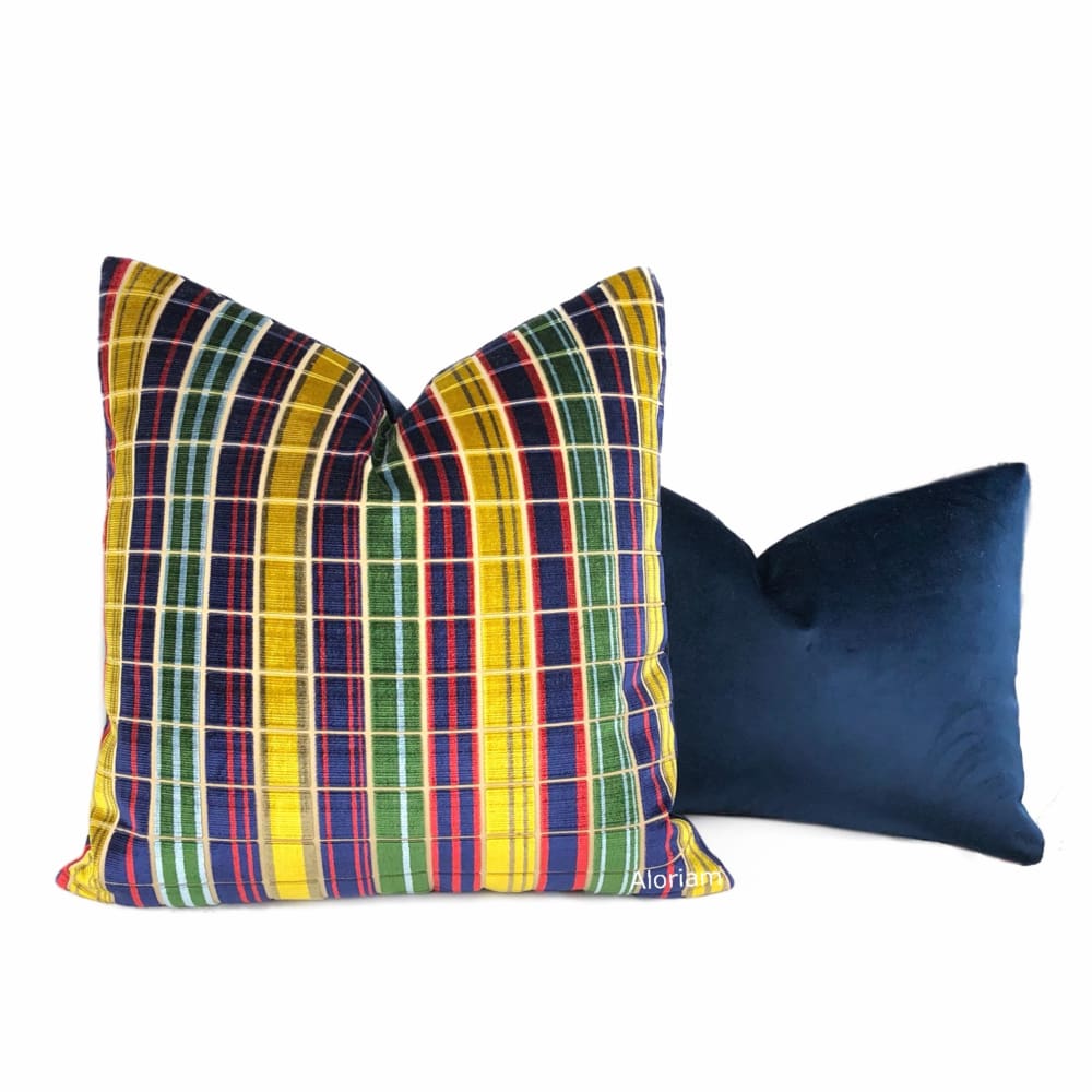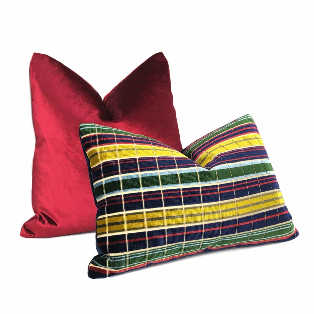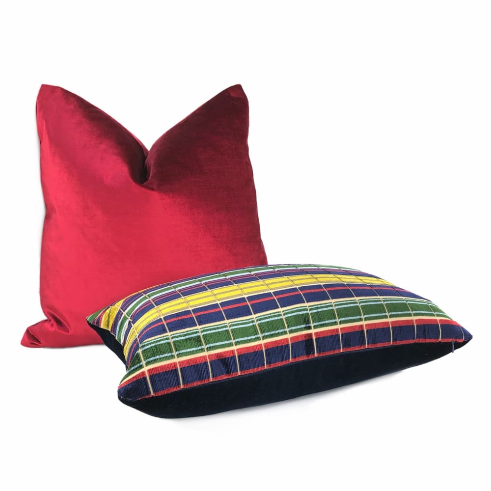 In the best British style, the Regent's Park pillow cover interprets the classic English plaid pattern in a dazzling array of colors. Woven in silk, this decadent velvet fabric glows with intersecting stripes of navy blue - ruby red, yellow gold - gray, and forest green - sky blue. Pairing a traditional time-tested plaid design with a fresh color palette, the Regent’s Park pillow is perfect for any home looking for a touch of luxury. Photographed on 20x20 and 14x20 inserts.