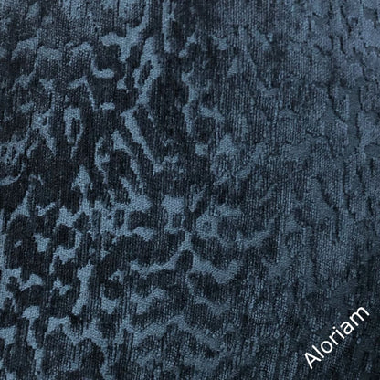 The Regis pillow cover combines the plush hand of soft textured chenille with a navy blue leopard skin pattern.