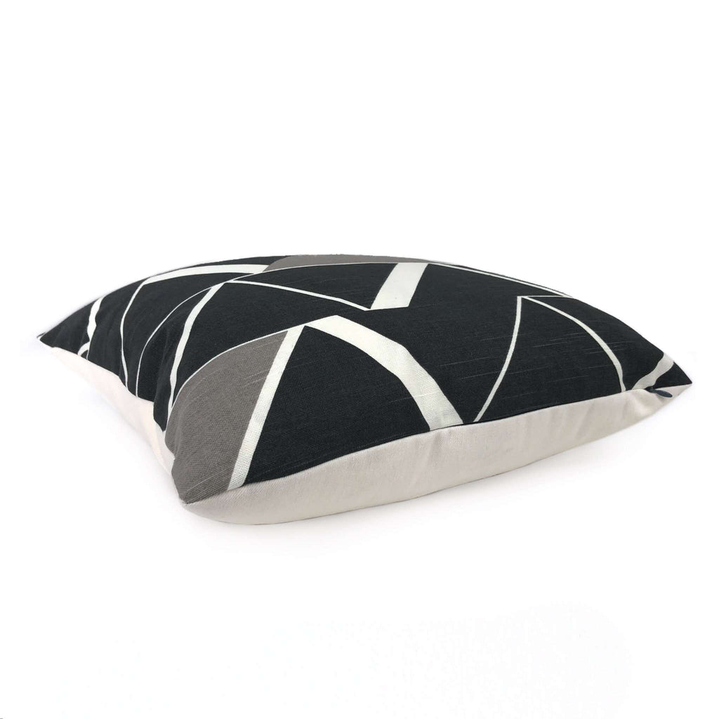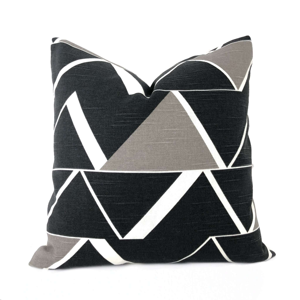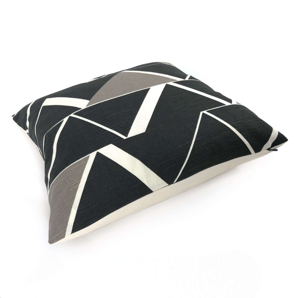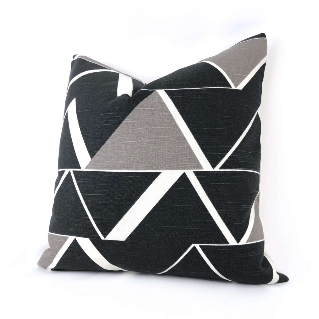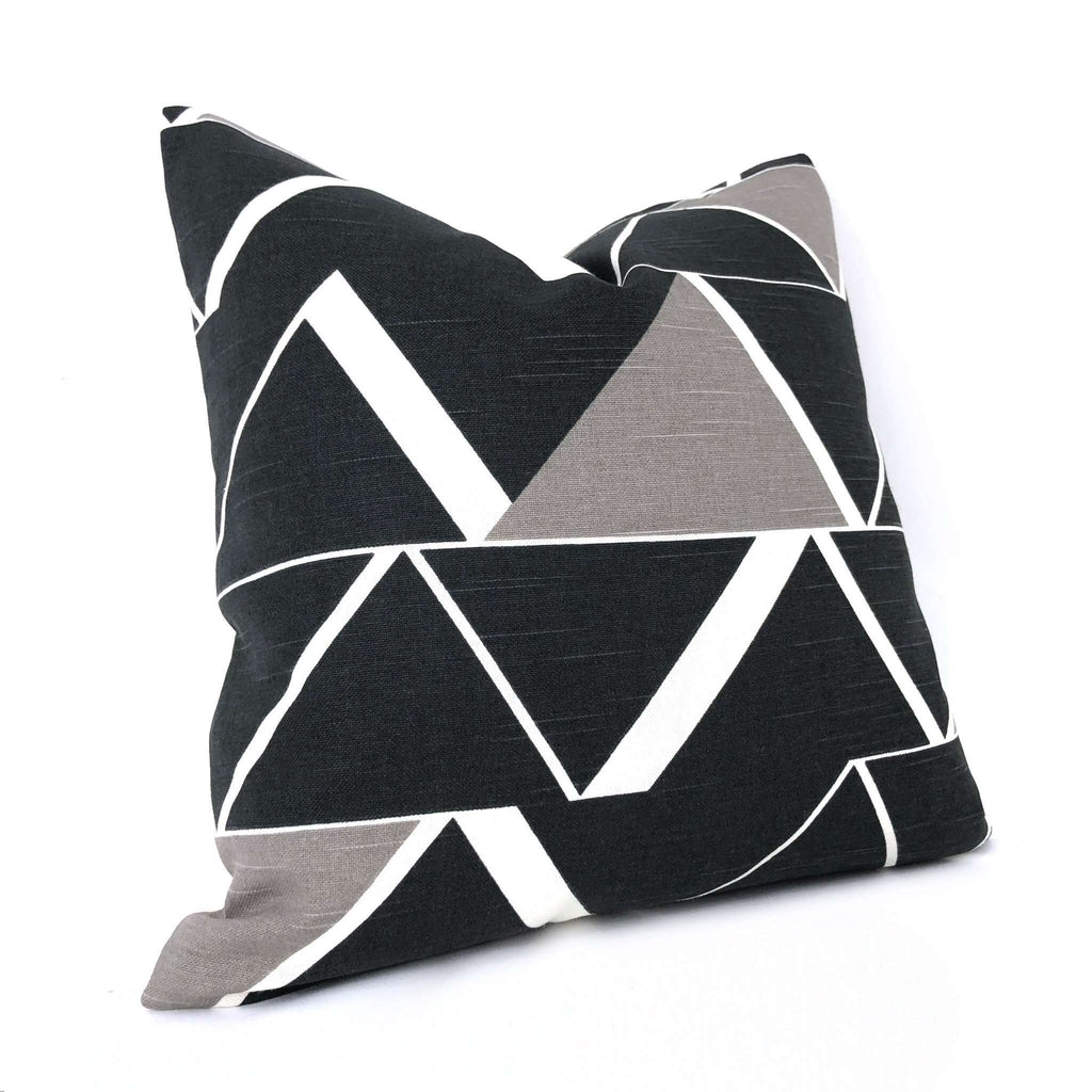 Bold geometric design printed in a striking color combination of dark charcoal gray, white and taupe gray make this pillow cover an eye catching choice for any contemporary interior. Choose from the pattern fabric used in front side with a coordinating white backside or used on both sides. Photographed on 17x17 cover (filled with 18x18 insert).