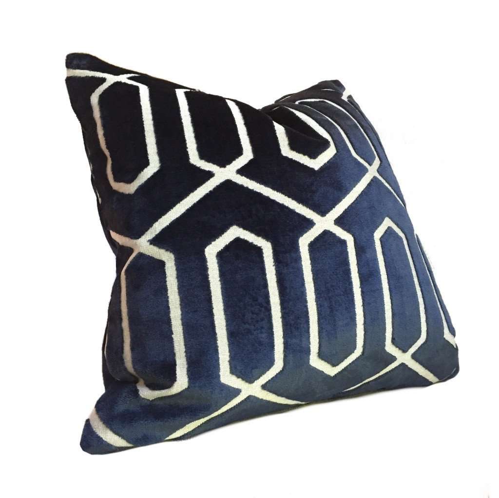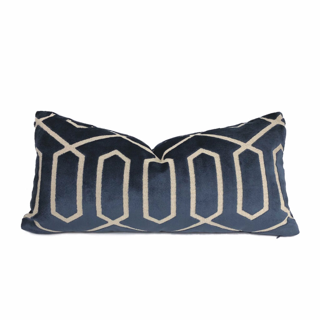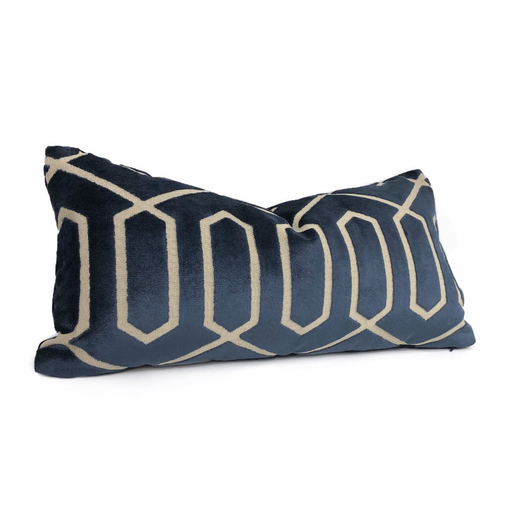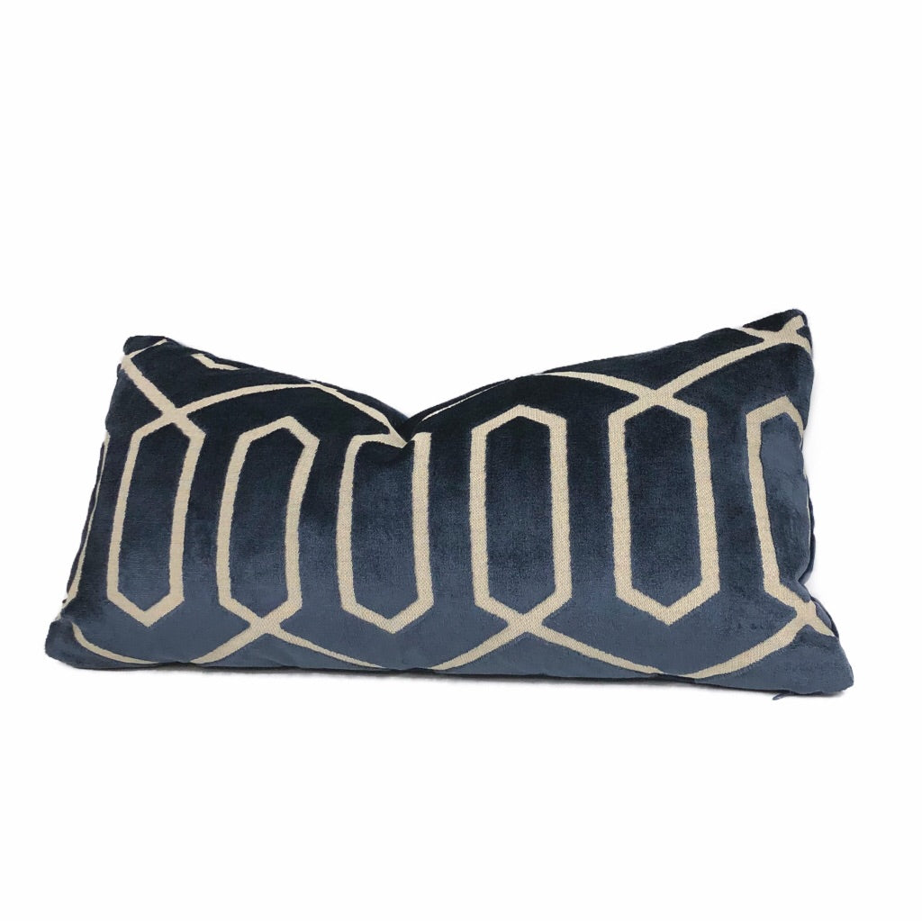 Almost sold out! This stunning pillow cover made from Robert Allen's Bengal lattice cut velvet fabric features a bold geometric design woven in dark navy blue and beige. A coordinating solid navy blue velvet is used on the backside. This $100+/yard Italian made velvet is super thick and sumptuously soft, and looks amazing with many other patterns. Photographed on 20x20 and 12x24 inserts.
