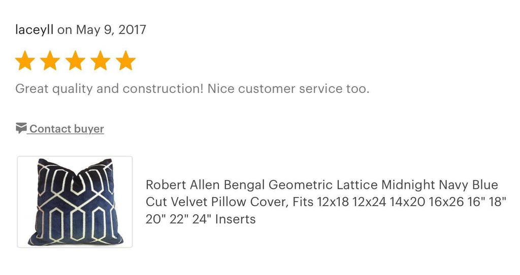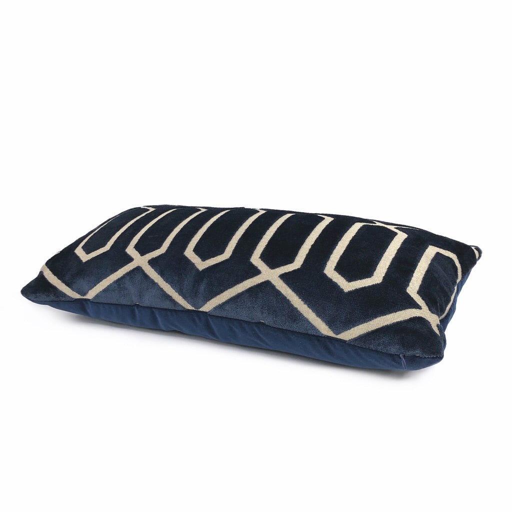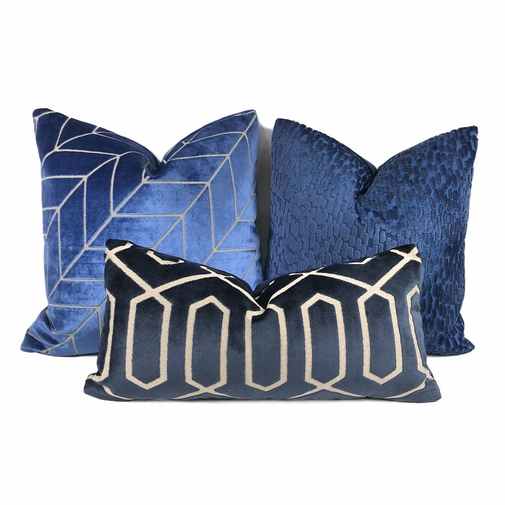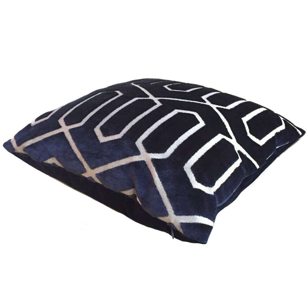 Almost sold out! This stunning pillow cover made from Robert Allen's Bengal lattice cut velvet fabric features a bold geometric design woven in dark navy blue and beige. A coordinating solid navy blue velvet is used on the backside. This $100+/yard Italian made velvet is super thick and sumptuously soft, and looks amazing with many other patterns. Photographed on 20x20 and 12x24 inserts.