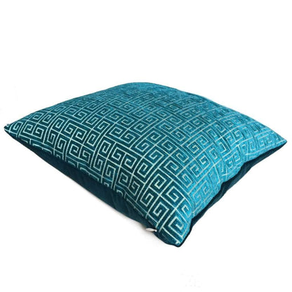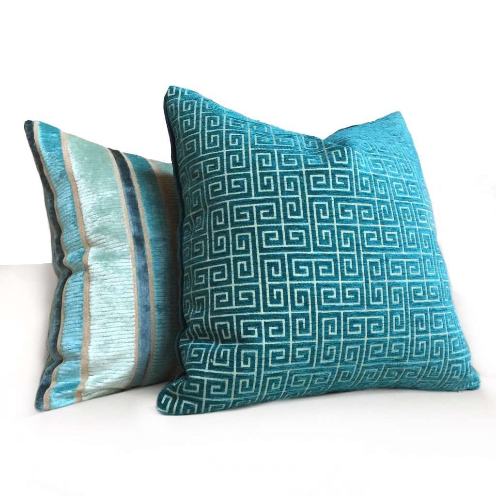 Sewn in a classic geometric Greek key pattern texture fabric by Robert Allen in a bright turquoise teal green, this pillow cover will breathe new life into your decor!