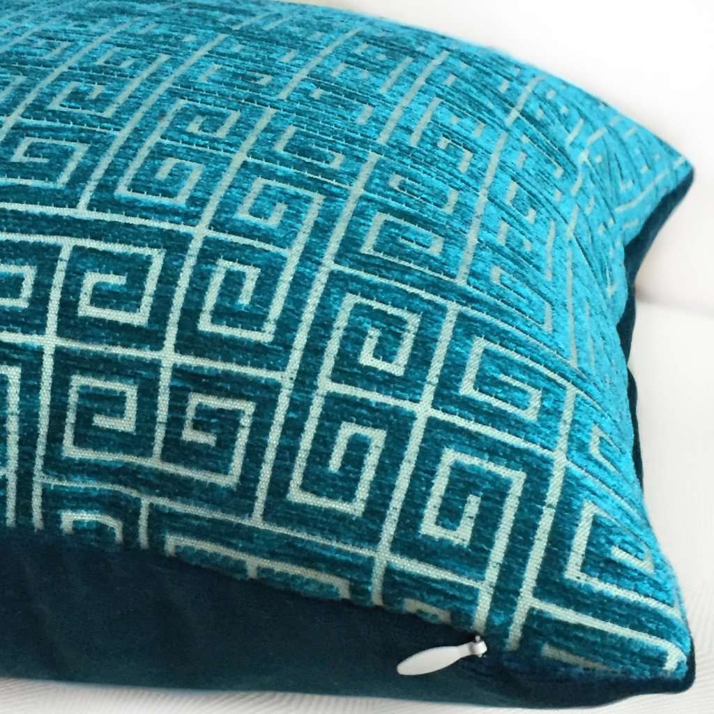 The back of the cover is a coordinating solid teal green fabric. This textured greek key design is available in more colors.