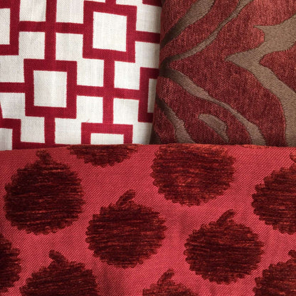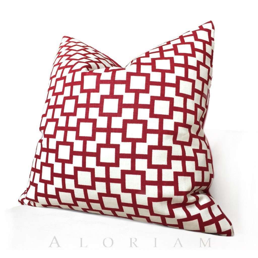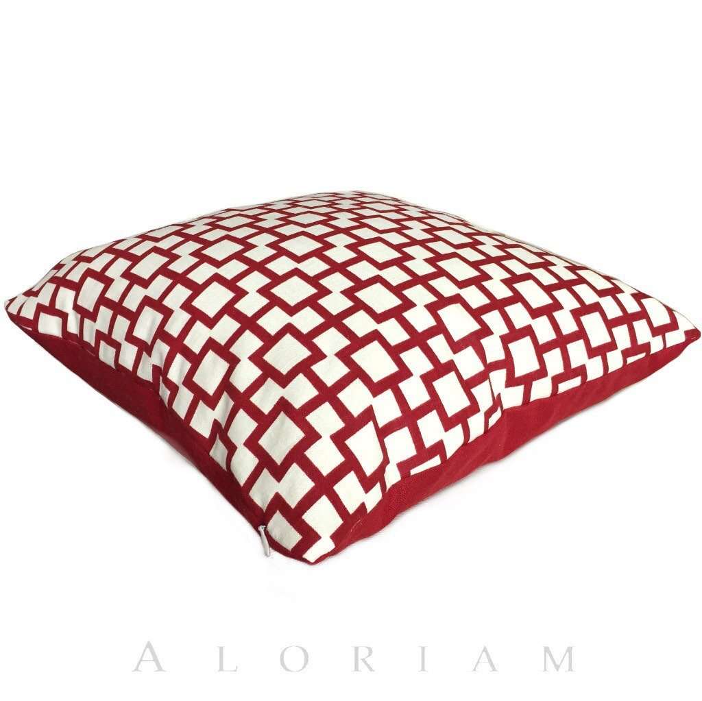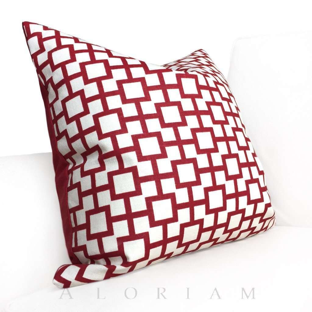 This modern geometric print by Robert Allen features interlocked squares in dark red on a cream background. The pattern fabric made of 55% Linen 45% Rayon is used on the front side of the cover, with the back a coordinating solid red fabric.