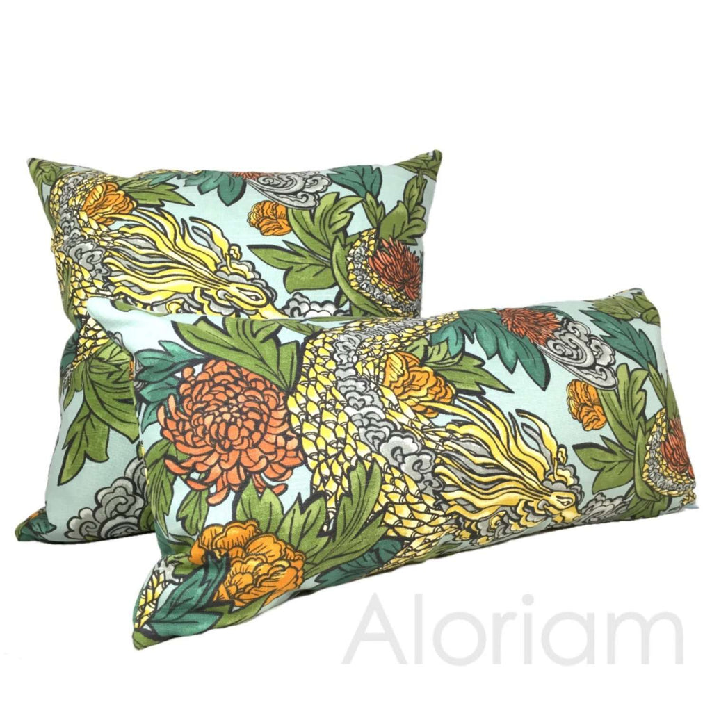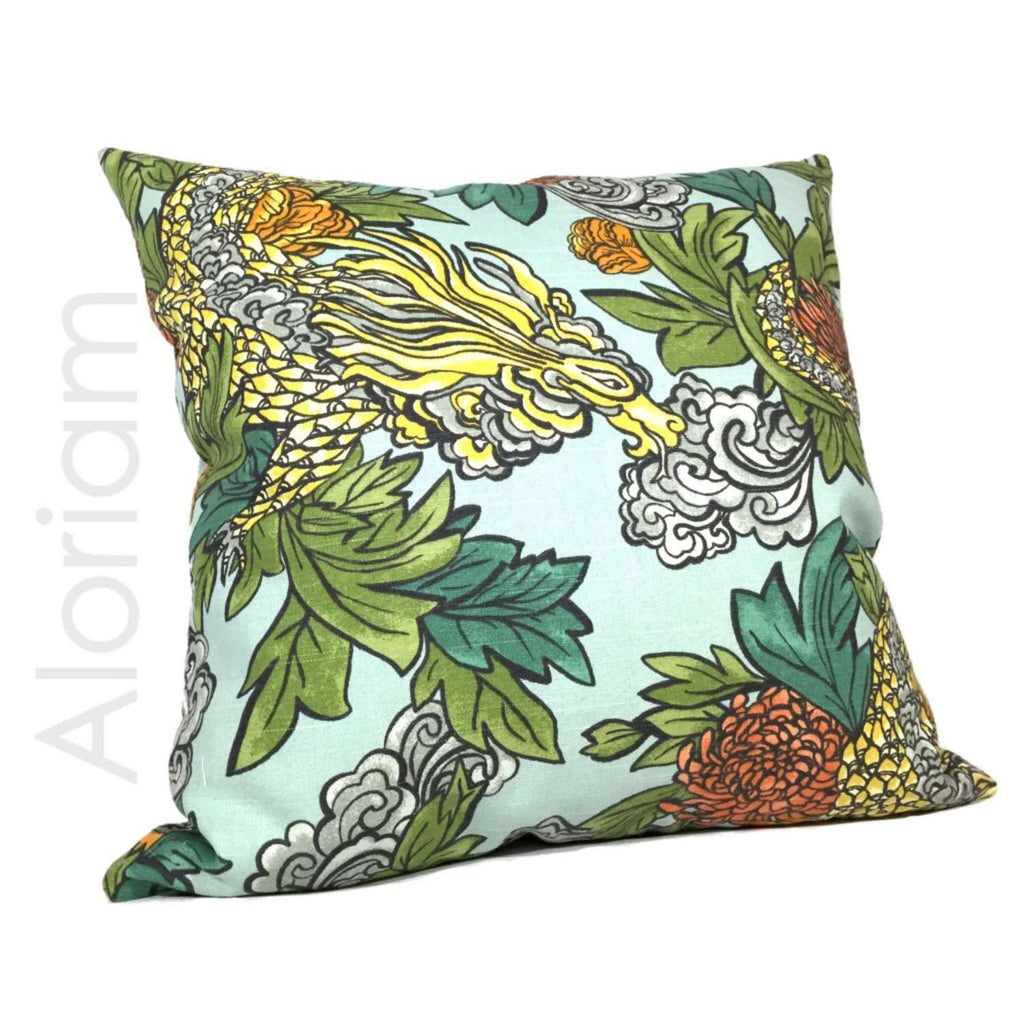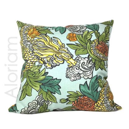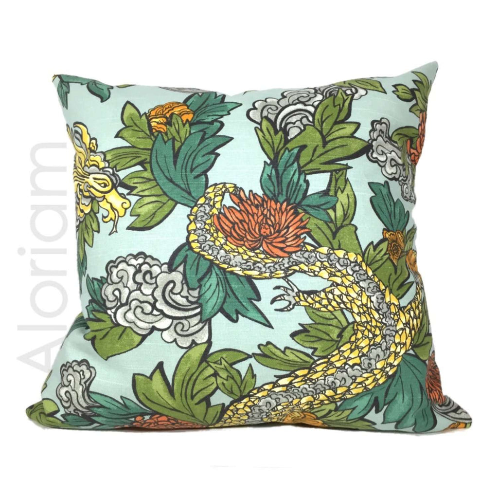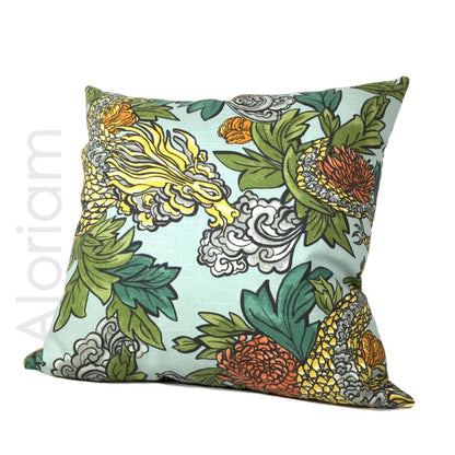 This Ming Dragon print designed by Dwell Studio for Robert Allen is a perennial favorite among customers seeking a modern interpretation of a classic chinoiserie motif. The dragon head will be featured on the front of the cover while other segments of the botanical foliage will be used on the backside. This eye catching pillow cover features colors of orange, golden yellow, grey, green and aqua.
