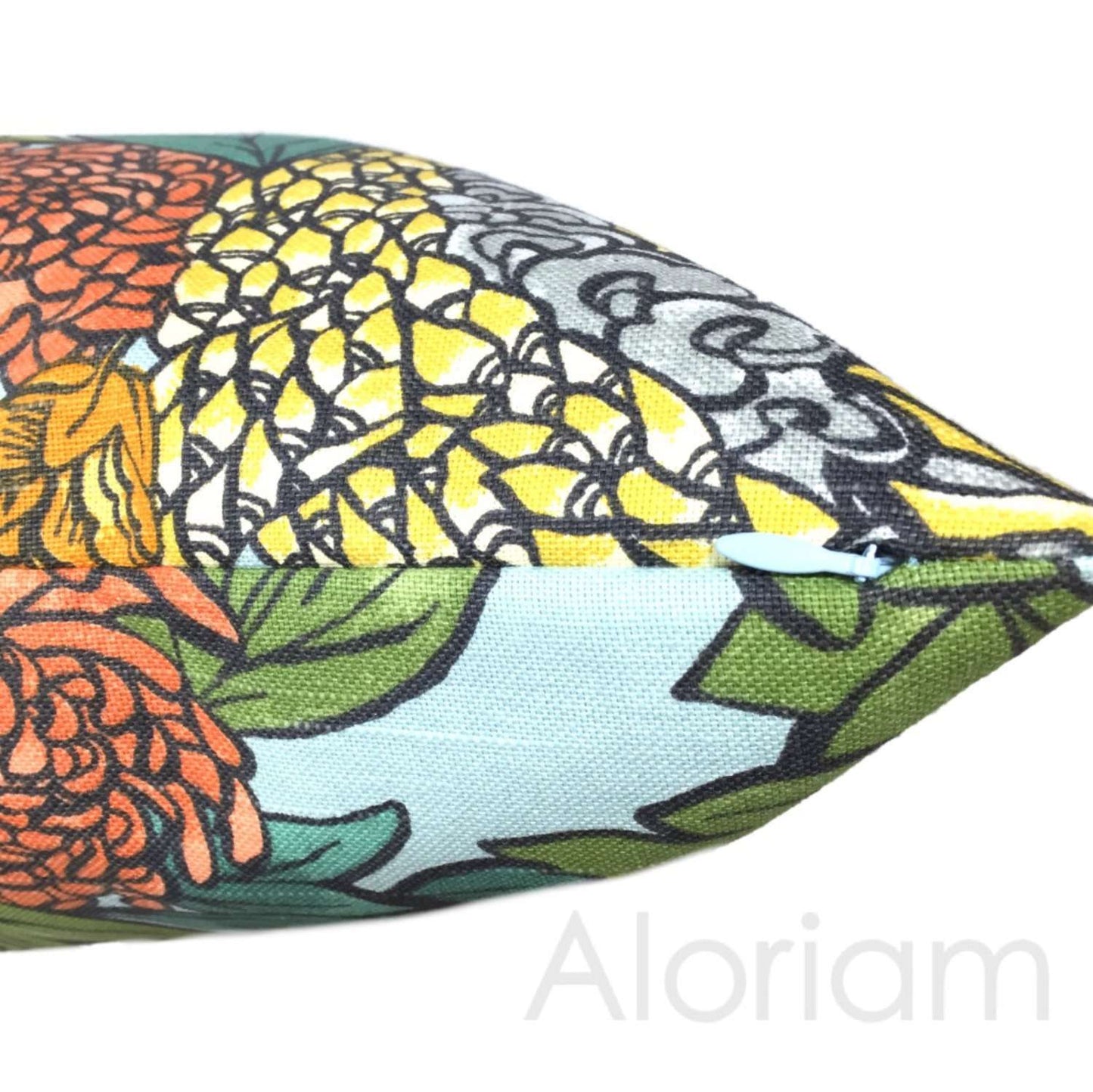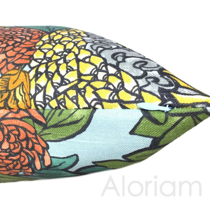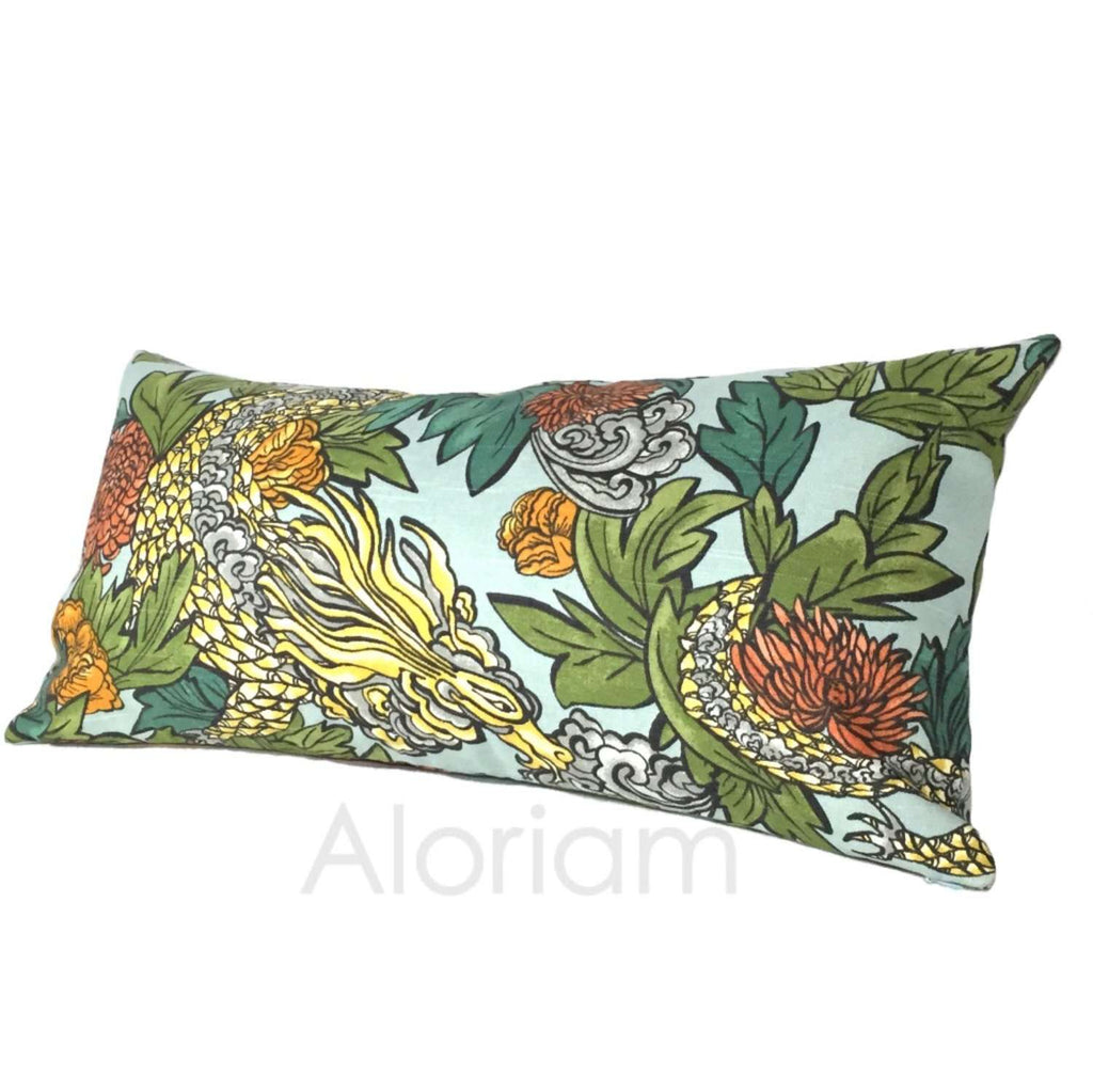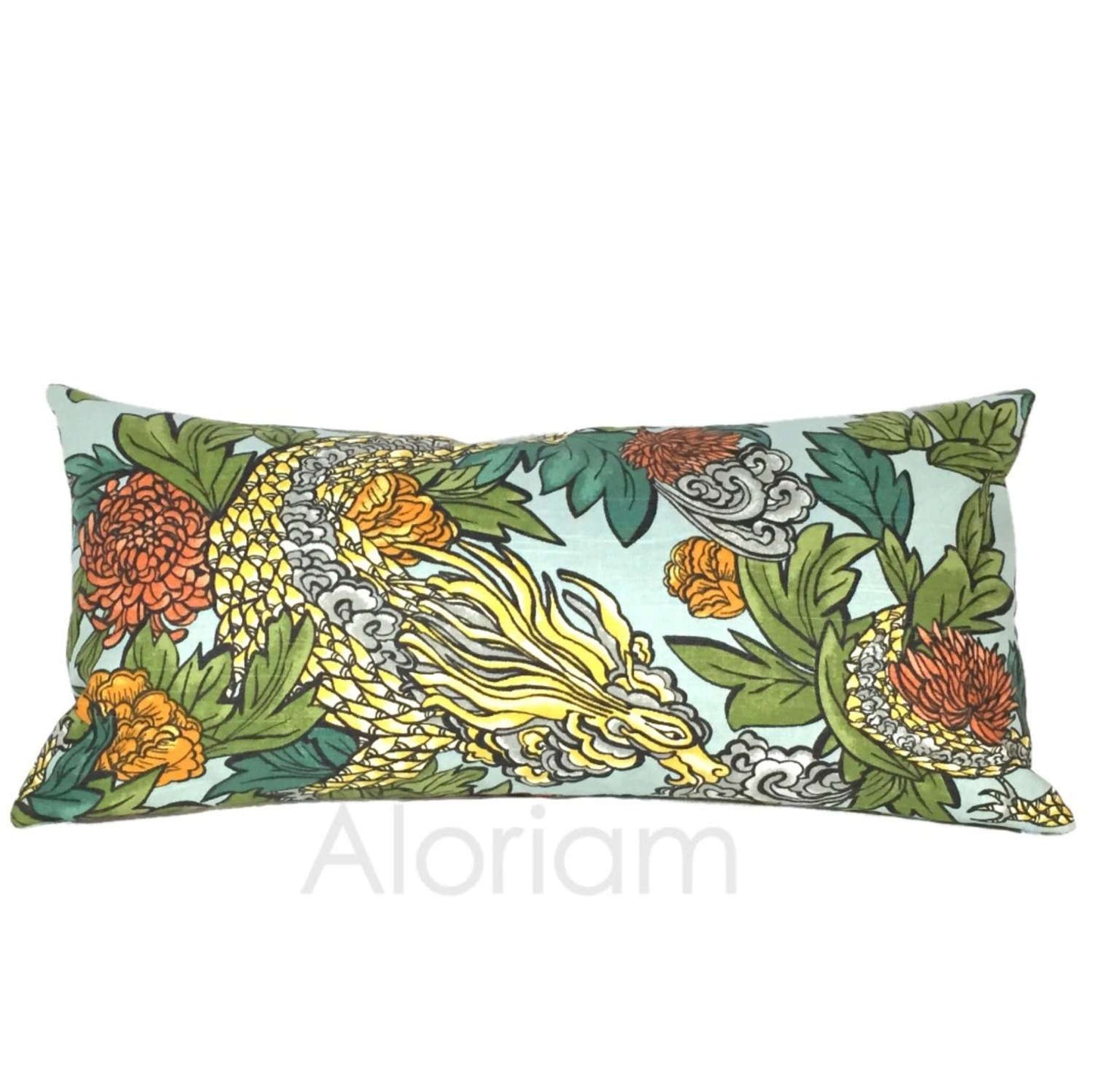 This Ming Dragon print designed by Dwell Studio for Robert Allen is a perennial favorite among customers seeking a modern interpretation of a classic chinoiserie motif. The dragon head will be featured on the front of the cover while other segments of the botanical foliage will be used on the backside. This eye catching pillow cover features colors of orange, golden yellow, grey, green and aqua.