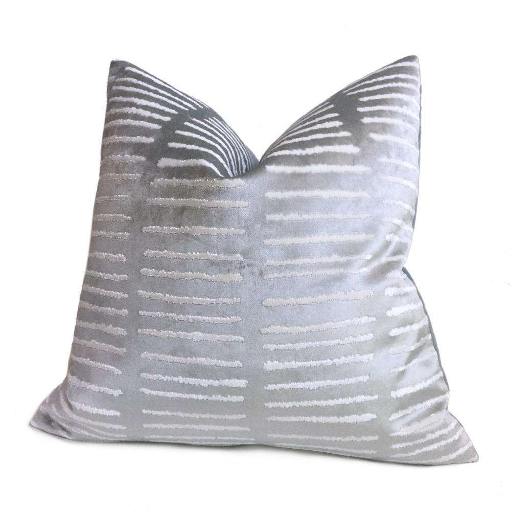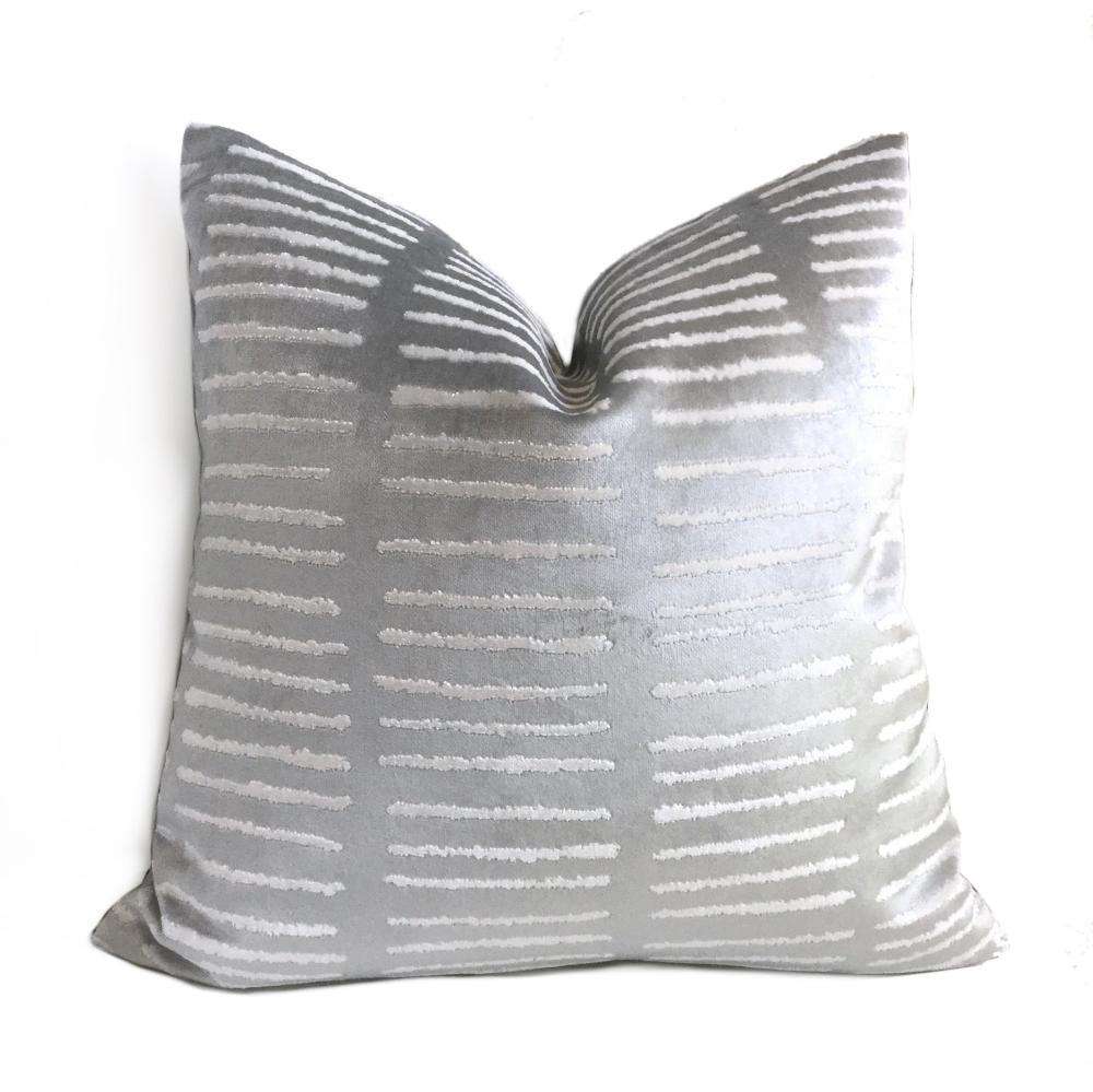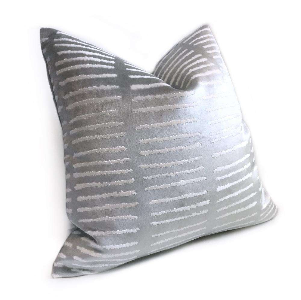 LAST ONE! This opalescent blue pillow cover features a modern linear design woven in soft, lustrous velvet. Made from a designer fabric by Robert Allen, this pillow is perfect for any contemporary decor! Choose from the pattern fabric used on the front side with a coordinating solid velvet backside, or the pattern fabric used on both sides. Photographed on 20x20 and 14x20 insert.