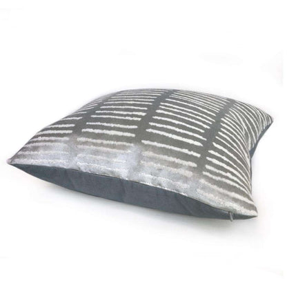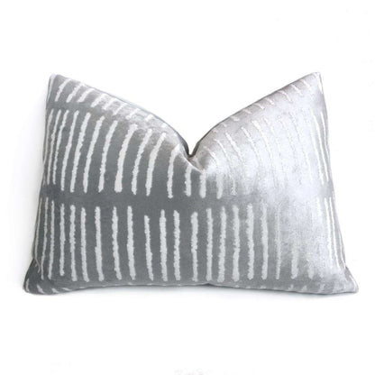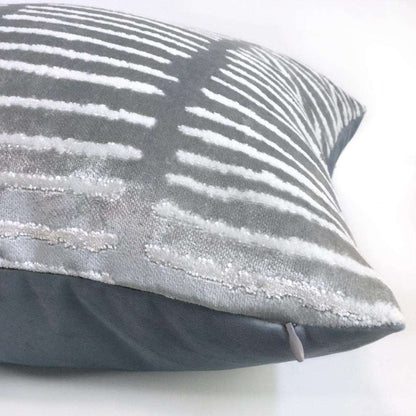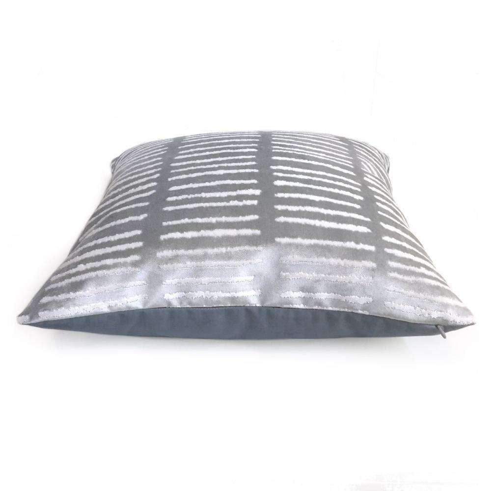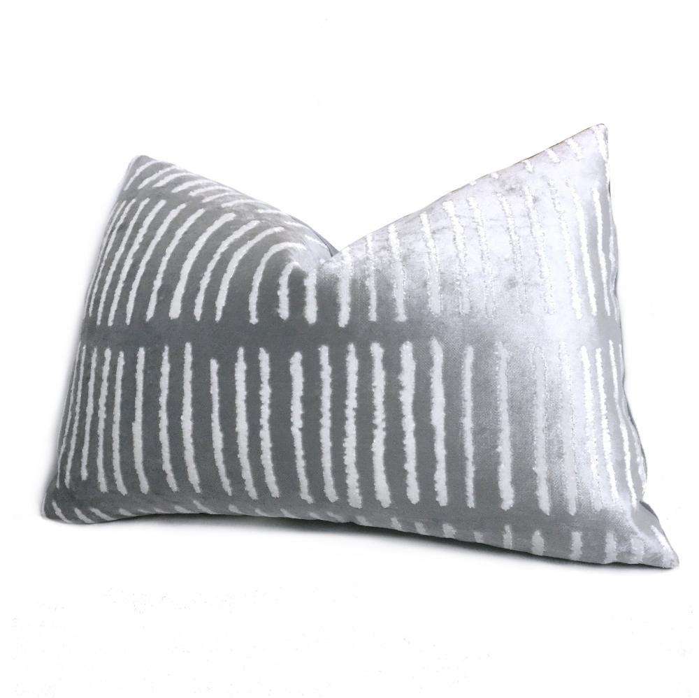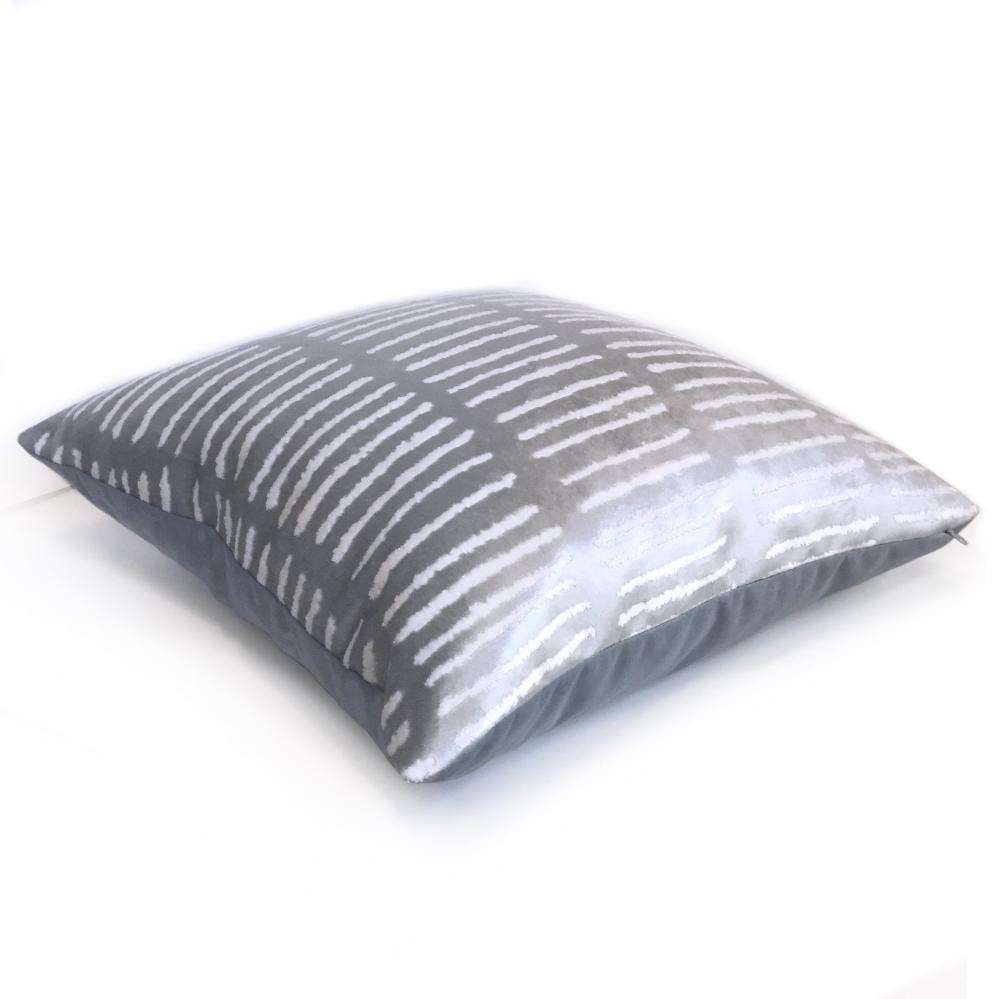 LAST ONE! This opalescent blue pillow cover features a modern linear design woven in soft, lustrous velvet. Made from a designer fabric by Robert Allen, this pillow is perfect for any contemporary decor! Choose from the pattern fabric used on the front side with a coordinating solid velvet backside, or the pattern fabric used on both sides. Photographed on 20x20 and 14x20 insert.